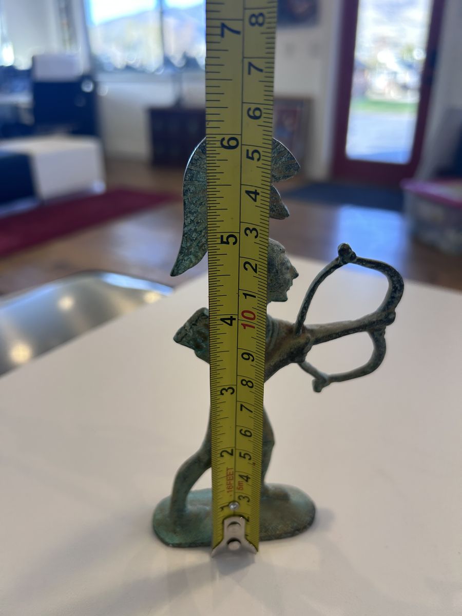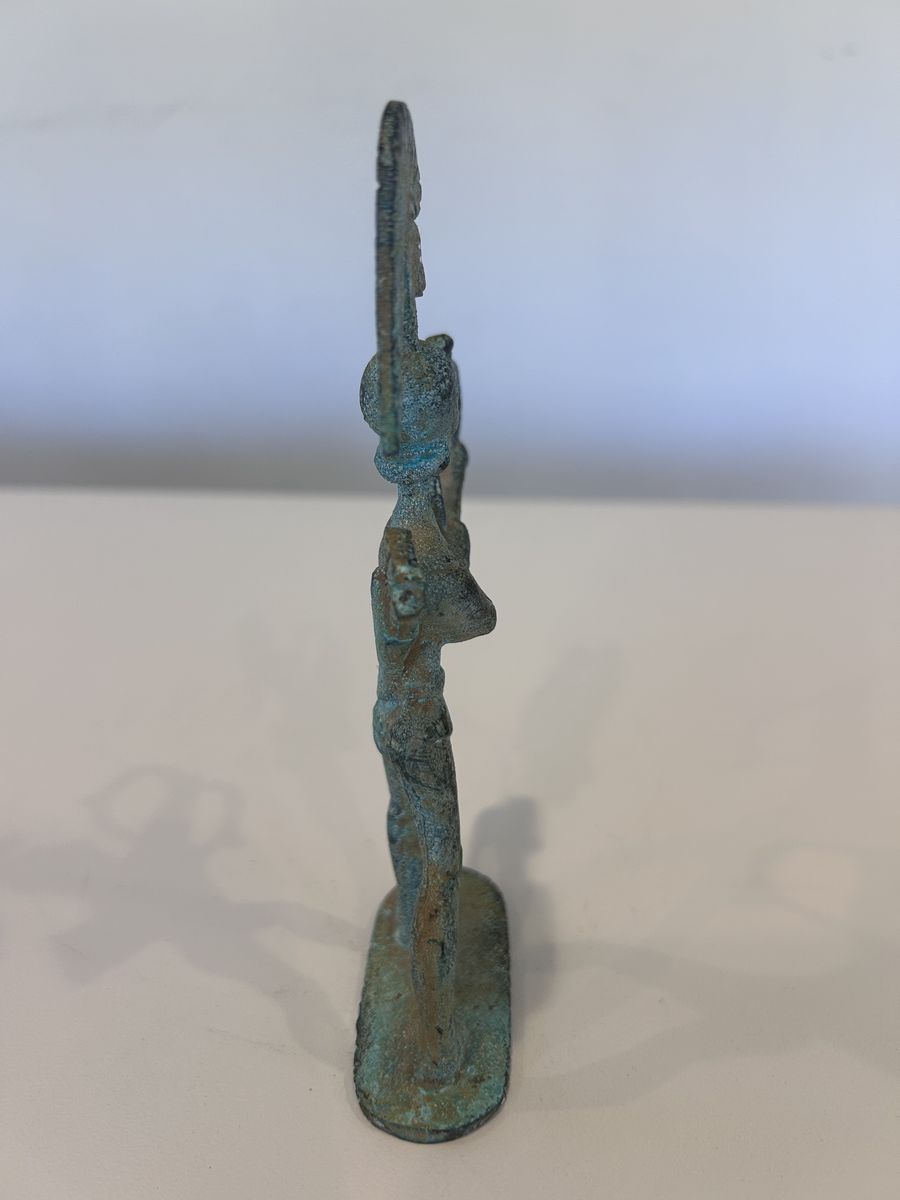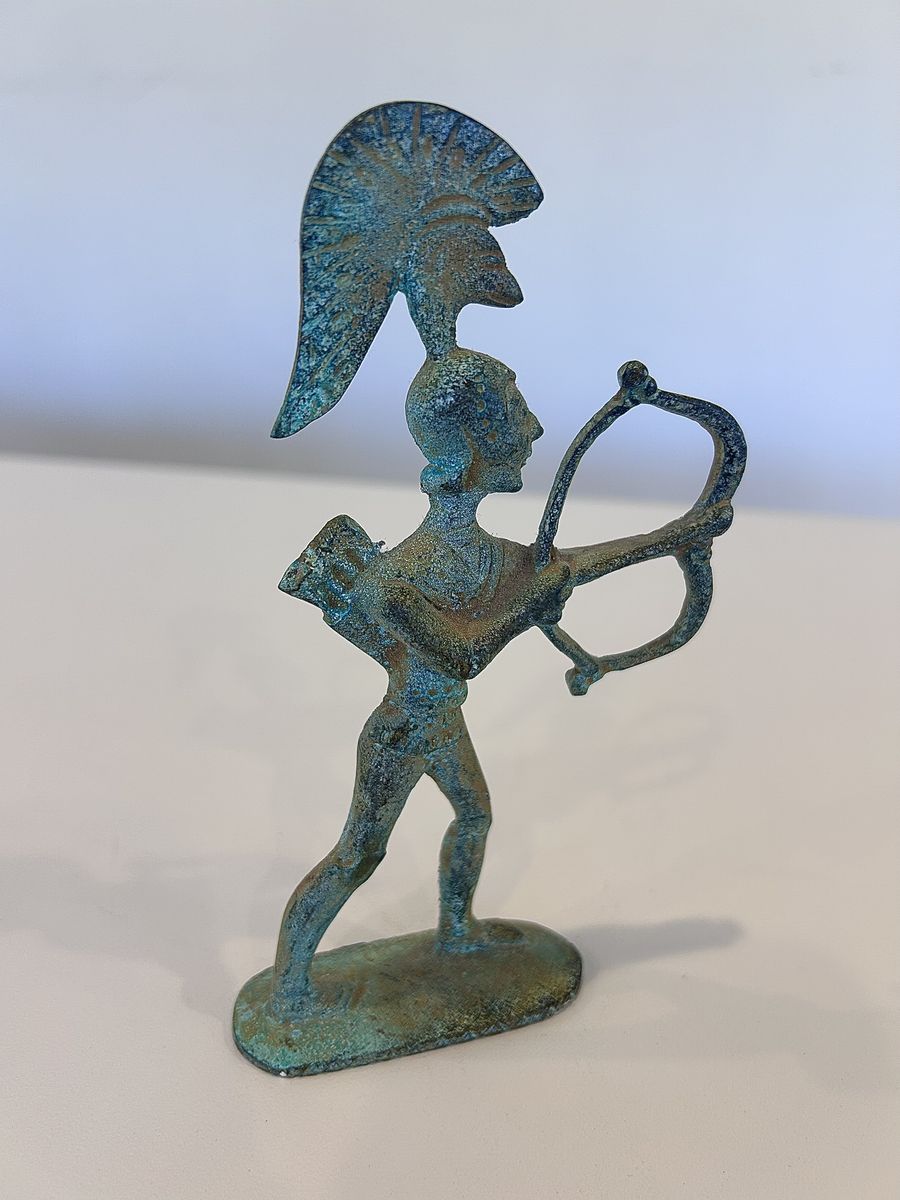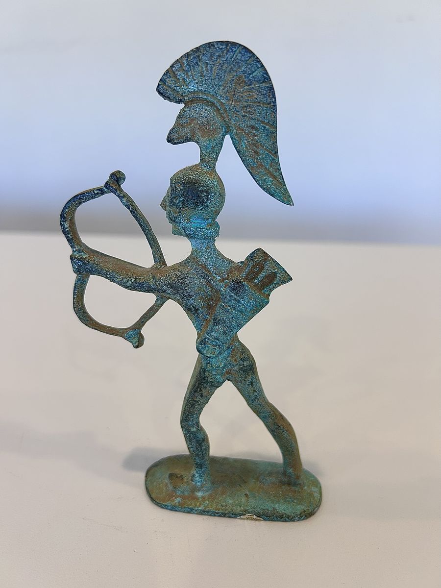 ZelleThis small bronze reproduction depicts an Etruscan warrior standing at 6.25 inches tall. The multicolor statue showcases intricate details and a patina finish, adding to its historical authenticity. Made in Italy, this piece reflects the style and craftsmanship of the Etruscan civilization, making it a unique and decorative collectible for art enthusiasts and collectors alike.