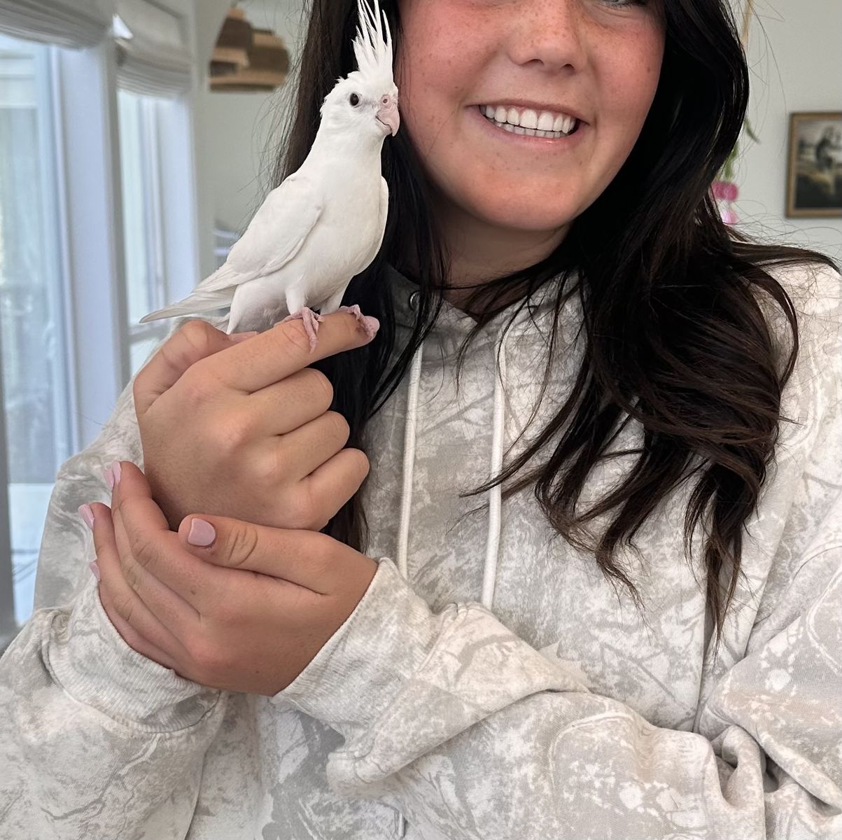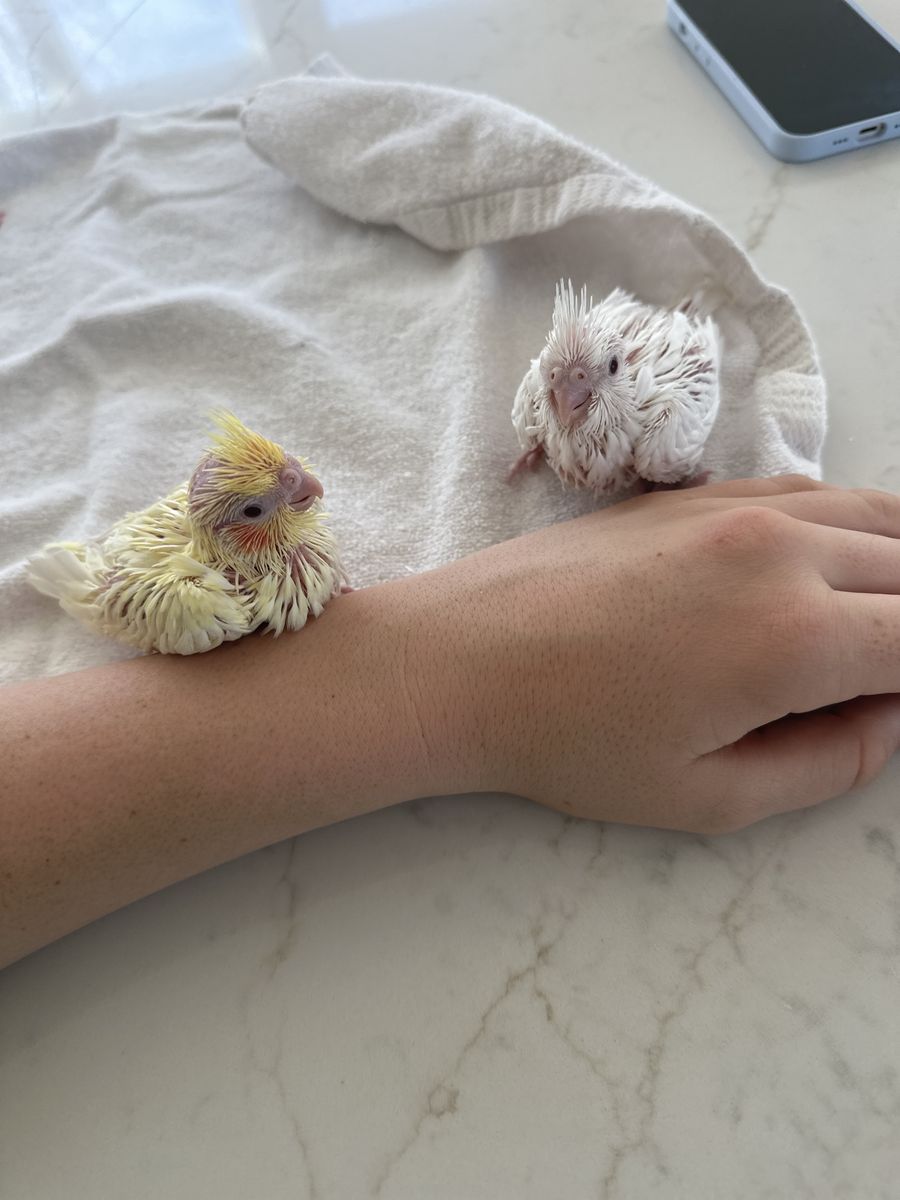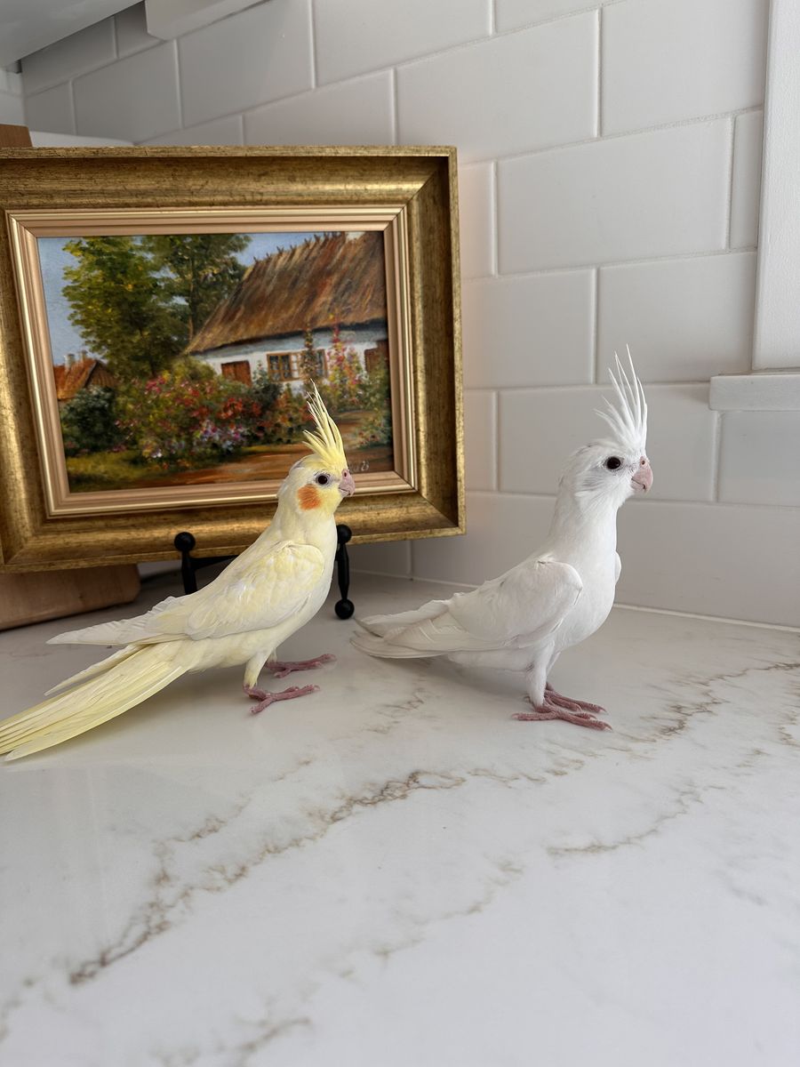 We have an 8 week old sweet baby cockatiel ready for a new home! It is a rare all-white (white faced pied) with dark eyes. It was parent-raised but handled daily, so it is comfortable with people and will already step up onto your finger.