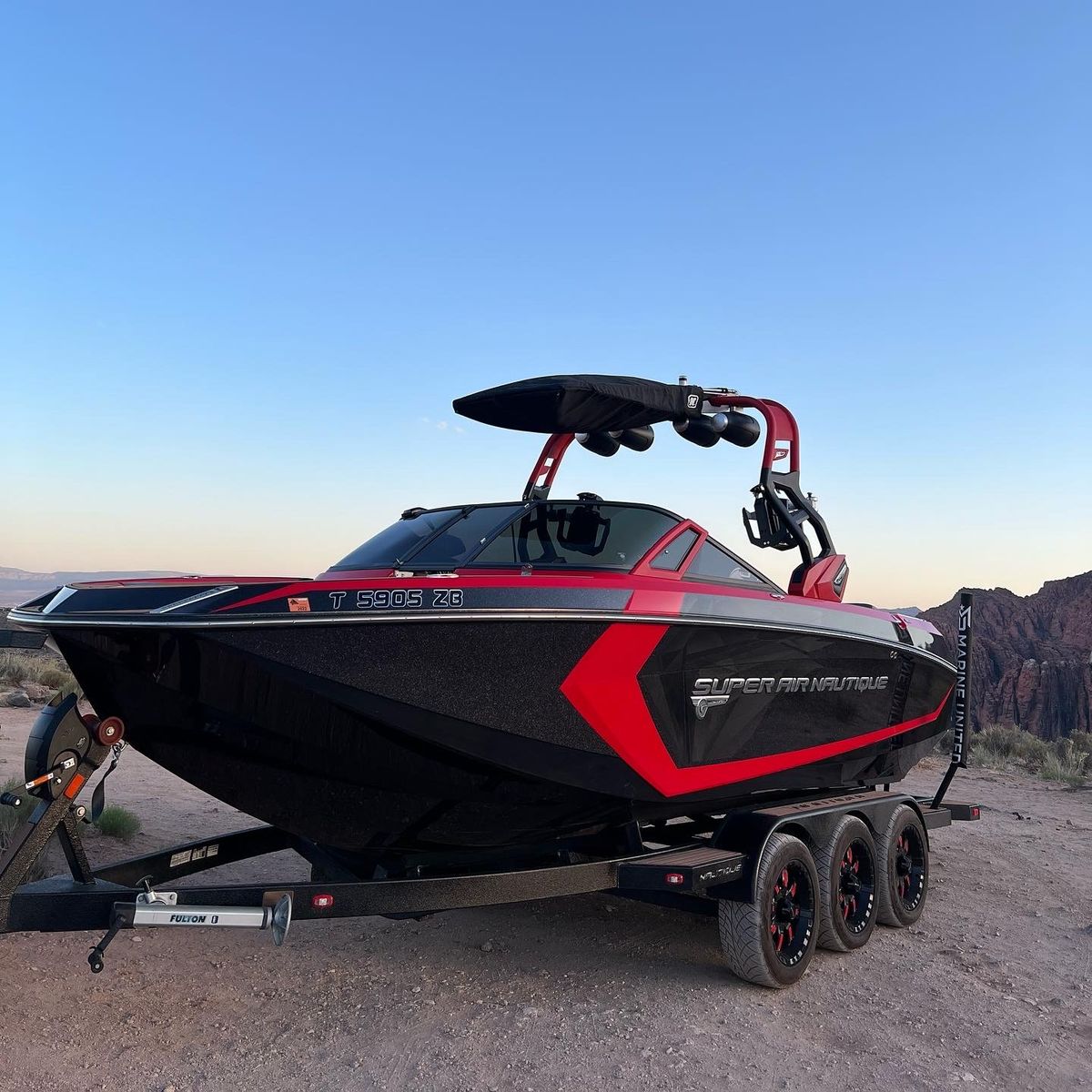 2018 Super Air Nautique G23 – one of the cleanest and most customized G23s you’ll find! This 23-foot wake boat turns heads everywhere it goes and throws a massive, clean wake perfect for wakesurfing and wakeboarding. With only 300 hours on the reliable PCM engine, it’s barely broken in and has been well-maintained. We’re only selling because it hasn’t seen the water in the last 2 years – time for someone else to enjoy it! Always garage kept and plugged in to preserve batteries. Key Features & Upgrades: • Custom full-boat RGB lighting throughout (interior, exterior, tower – looks incredible at night) • Premium JL Audio sound system with 2×12” subwoofers + 4×10” subwoofers that fire back toward the surfer for thumping sound on the water (literally shakes the water!) • Custom Gator Step flooring in a sharp American flag theme ($30k in lighting and audio) ($7,500 in gator step flooring) • Surf Gate system and ballast setup that delivers world-class waves • Tower with board racks and premium bimini • Beautiful red/black color scheme with premium interior •Custom (paint matched) alternator strong enough to run anything you can think of! • Comes with several Ronix and Hyperlite surf boards and wakeboards (retail value around $5,000) The G23 is widely regarded as one of the best-performing wake boats in its class – roomy enough for 15–16 people, stable, and built for serious watersports fun. This one stands out as the prettiest boat on the water with all the custom touches. Located in the Kamas Utah area. Trailer is included (triple-axle setup shown in photos). Serious inquiries only – cash or verified funds. Please message with any questions or to schedule a viewing/test ride. No trades. Clean title. Ready for the 2026 season!