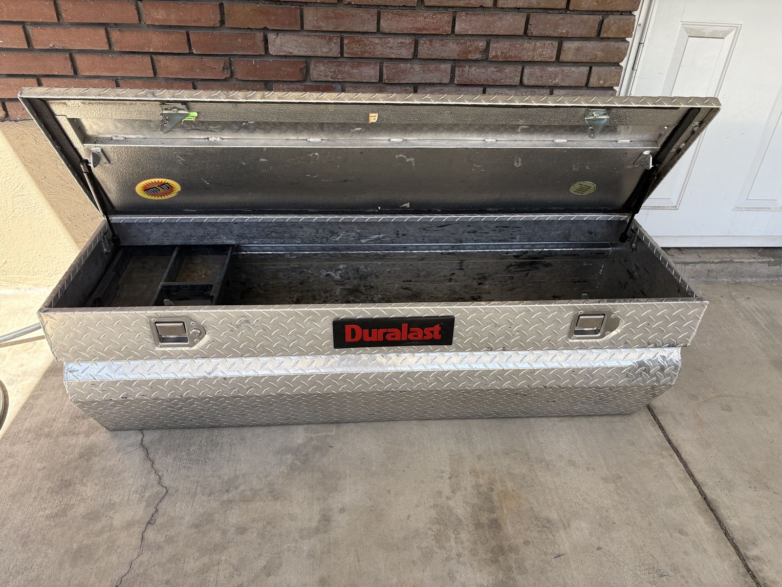 VenmoDuralast truck tool box. Diamond plate aluminum. Good shape. Have key. This worked great in my F-250. Sat down on the floor in front of the wheel wells in my 6' bed.