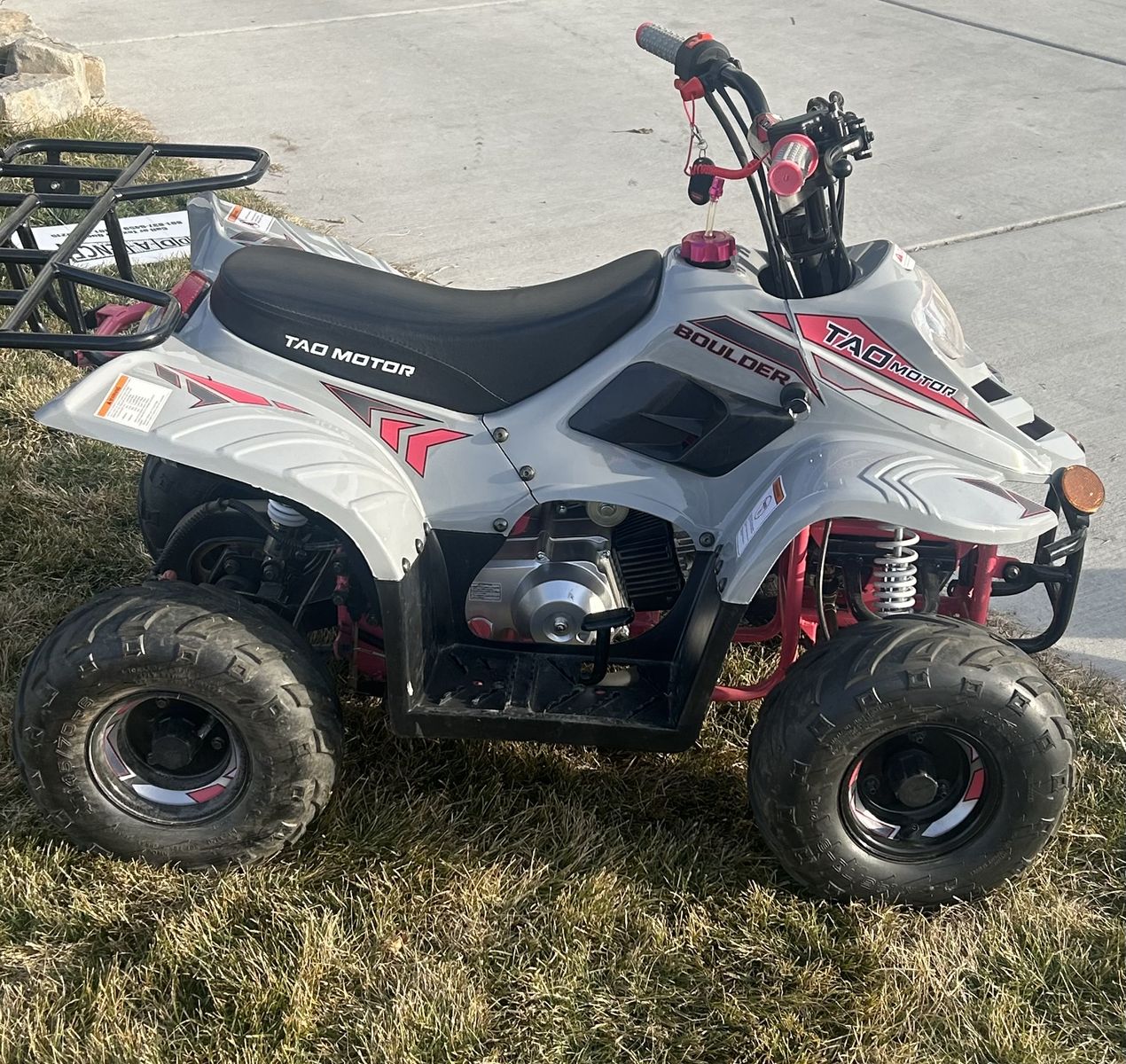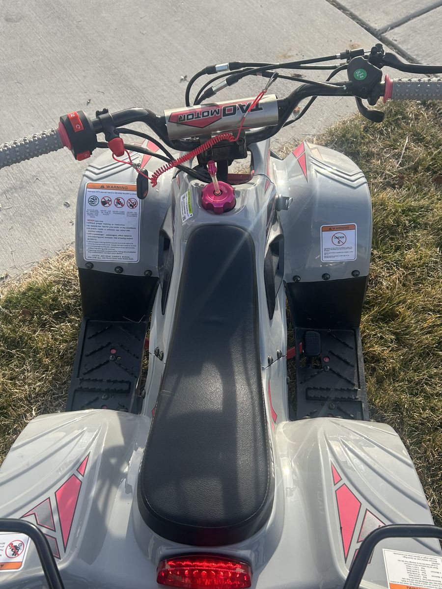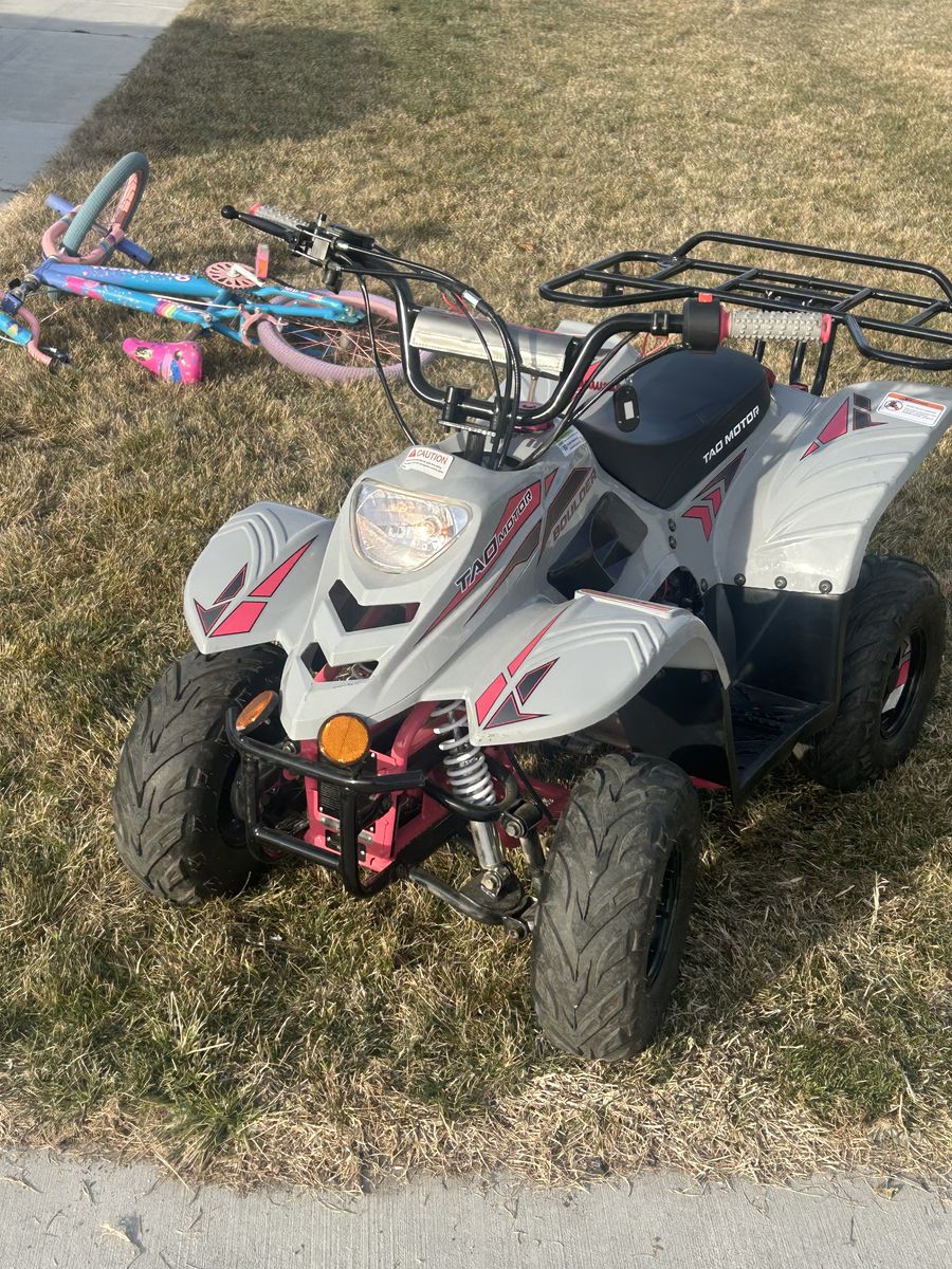 Venmo2025 Grey/ Pink Tao Tao Four Wheeler 110cc New has been rode 2hrs, weight limit 95 pounds, parents remote shut off, goes up to 22 miles an hour also has a turn down switch that can take it down to 5 miles an hour. Like brand new only been ridden for two hours. Takes high octane gas.