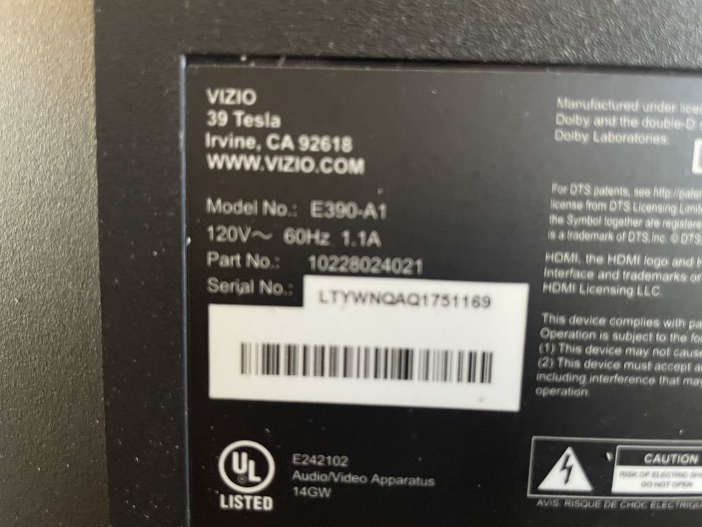 The Vizio E390-A1 is a 39-inch 1080p LED LCD television featuring a slim frame, 60Hz refresh rate, and 10W stereo sound with SRS StudioSound HD. It offers two HDMI ports, component/composite inputs, and a USB port. This is a non-smart TV model that relies on an ambient light sensor for optimized backlight adjustment.