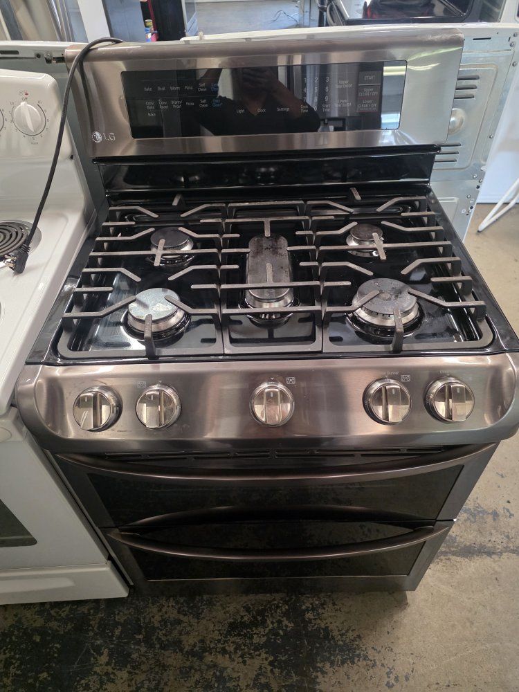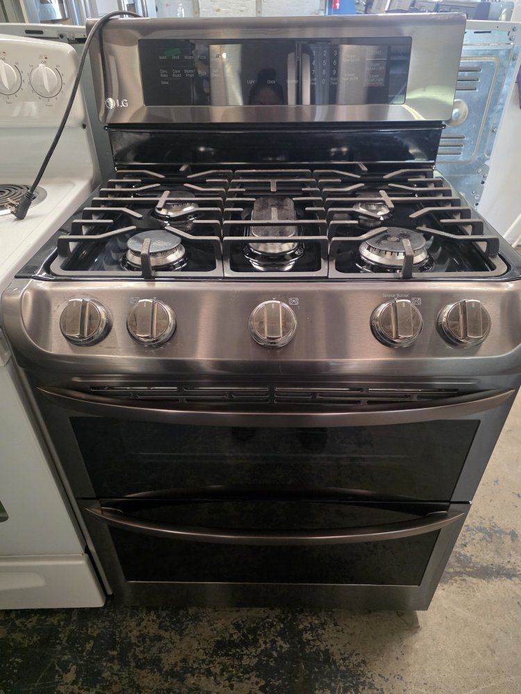 Black stainless double oven gas range, in great working condition and clean, delivery available.
