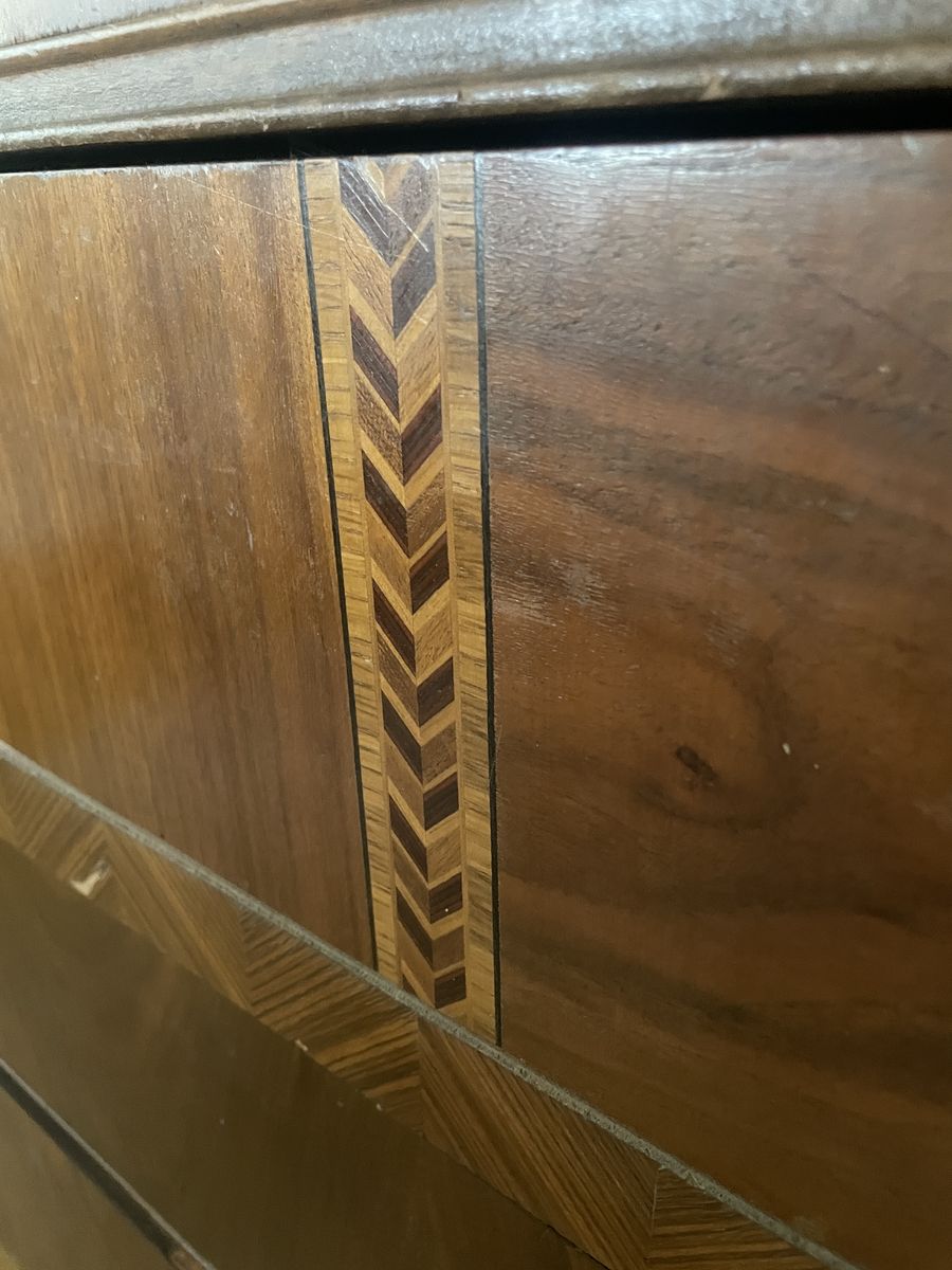 Likely from the 1930s - 1940s, the details and build quality are astounding. Those Art Deco characteristics with the curved edges, bookmatched walnut veneer, and original decorative pulls make it a stunning piece.