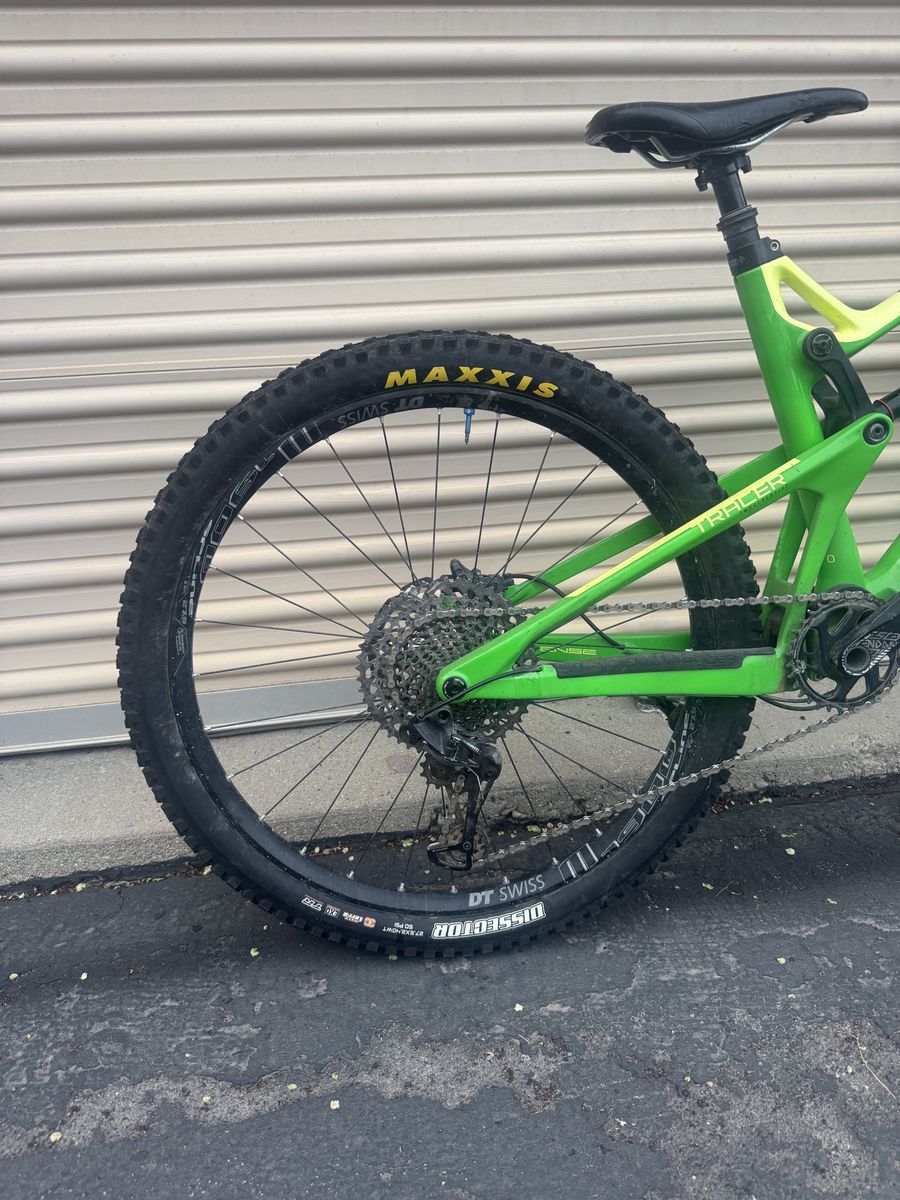 FRAME: INTENSE TRACER CARBON MED. DRIVE: SRAM GX EAGLE 1x12 BRAKES: SHIMANO DEORE XT WHEELS: DT SWISS ALLOY 27.5 TIRES: MAXXIS MINION DHF 2.6(front) MAXXIS DISECTOR 2.4 (rear)