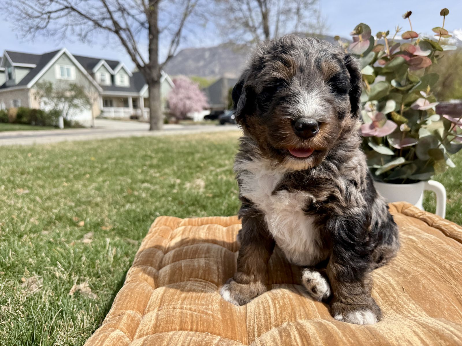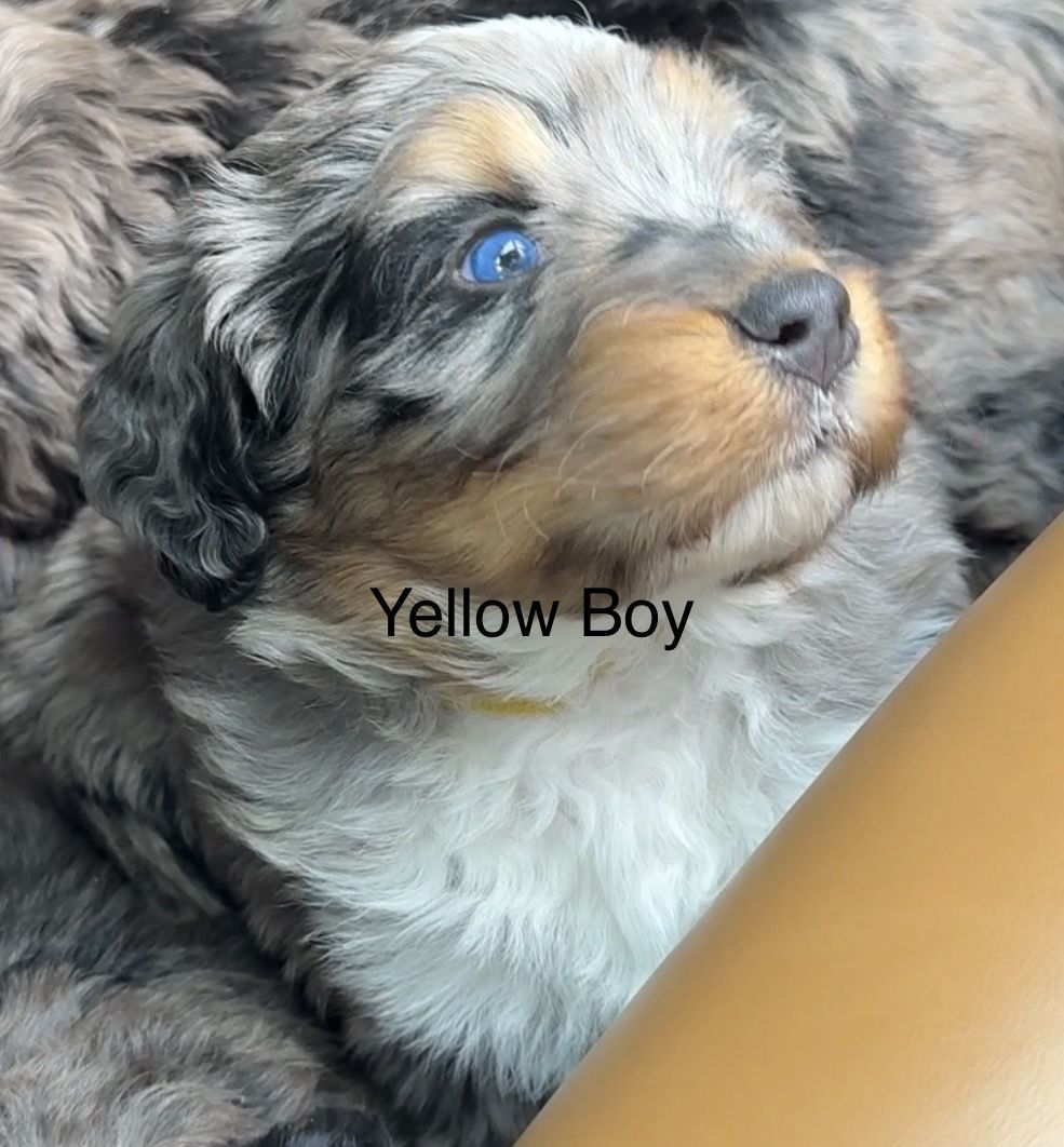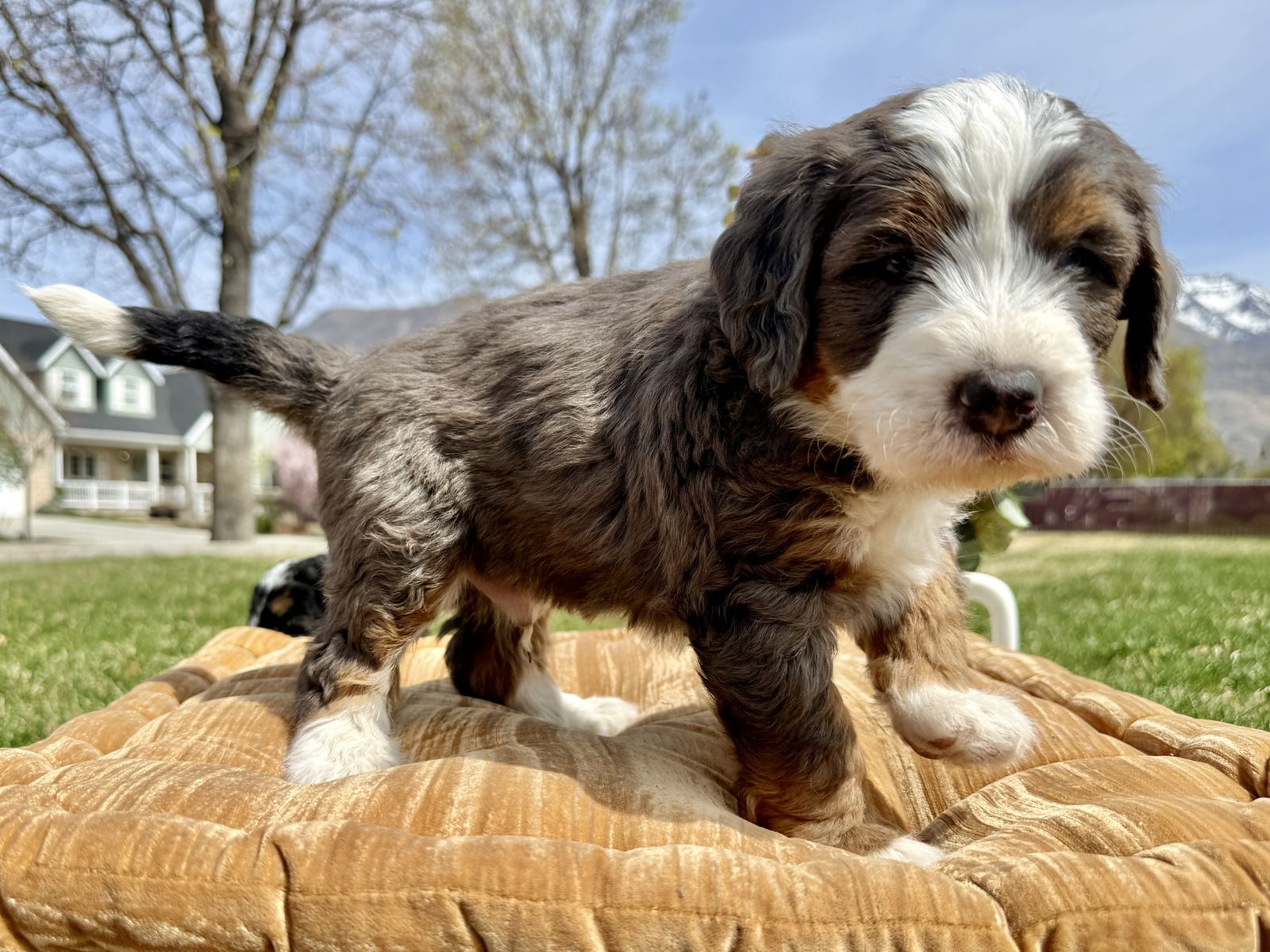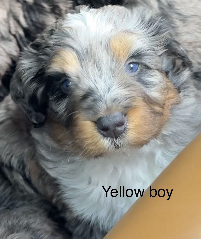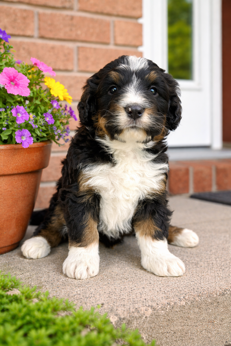 **Picture 16: Parents:**Maggie is an exceptional 58-lb Bernedoodle with a strong 78% Bernese Mountain Dog foundation and 22% Toy Poodle refinement. She is fully clear of all tested genetic diseases and was intentionally selected for her substantial bone, balanced structure, and deeply intuitive, family-centered temperament. Genetically, Maggie is EE, kyky, atat, BB, Ssp, mm with a rich 7/10 intensity, ensuring beautifully defined phantom/tan-point patterning, strong tri expression, and consistent color clarity. Her Bernese dominance brings calm loyalty, emotional intelligence, and that signature soulful expression families adore.