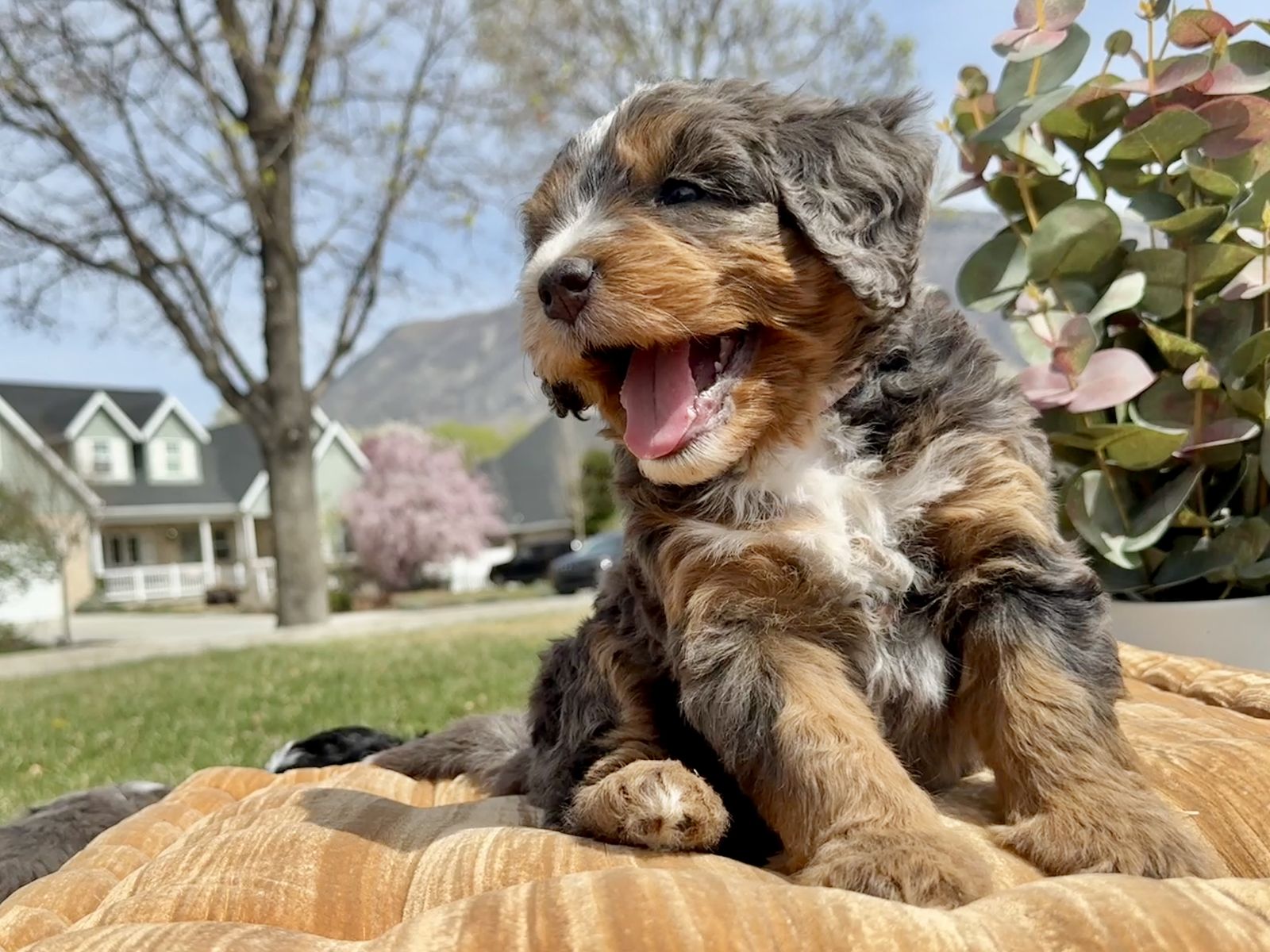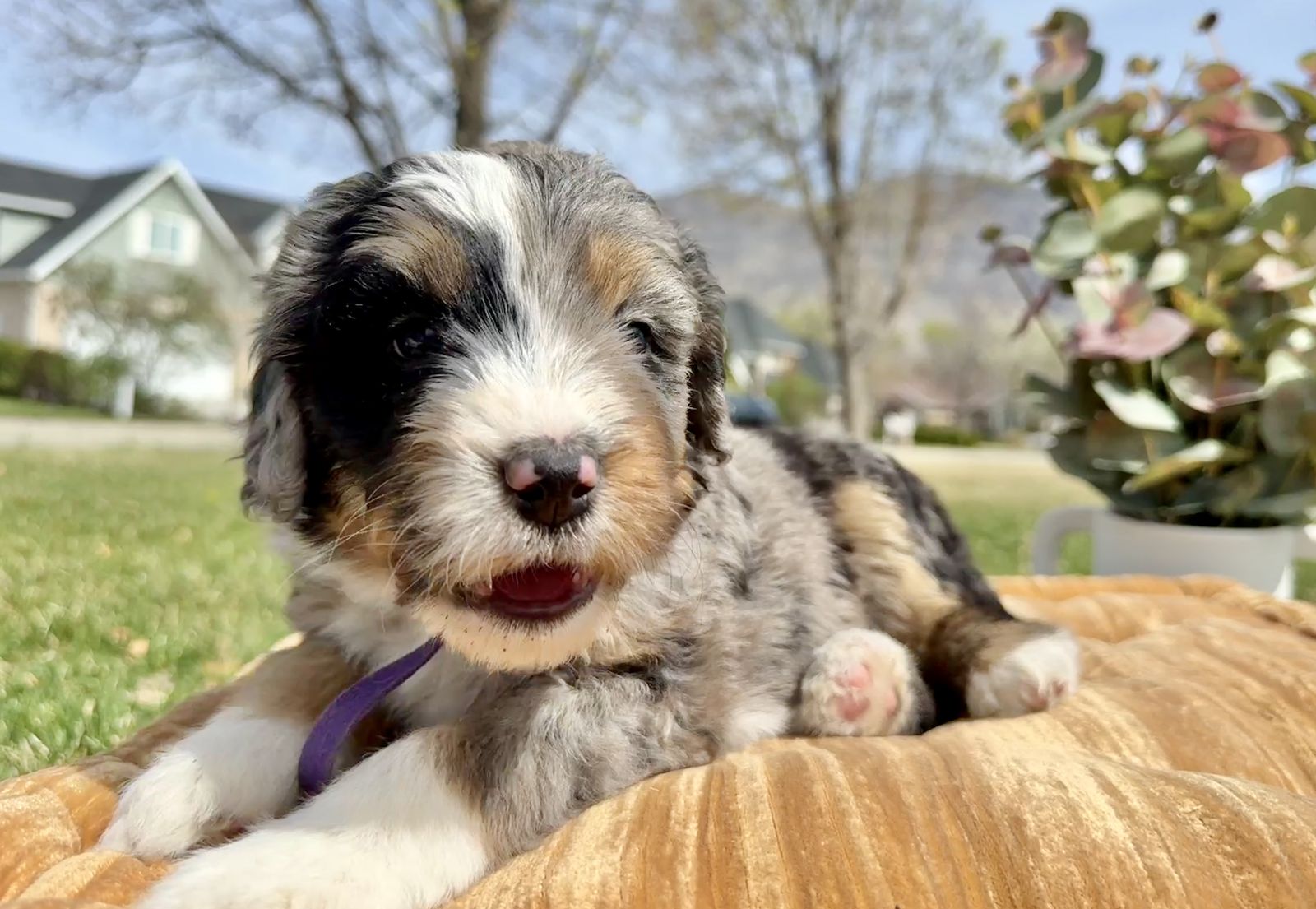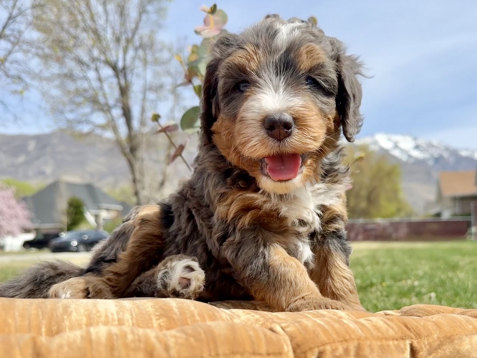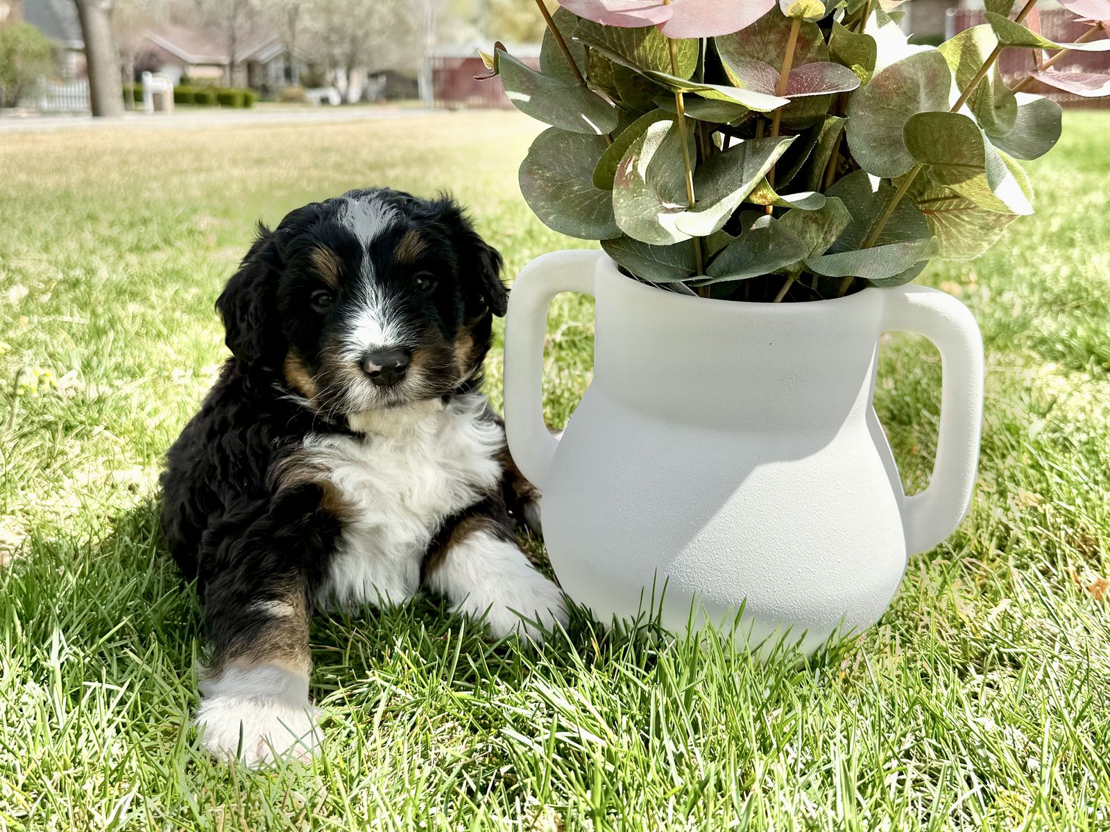 **Picture 16: Parents:**Maggie is an exceptional 58-lb Bernedoodle with a strong 78% Bernese Mountain Dog foundation and 22% Toy Poodle refinement. She is fully clear of all tested genetic diseases and was intentionally selected for her substantial bone, balanced structure, and deeply intuitive, family-centered temperament. Genetically, Maggie is EE, kyky, atat, BB, Ssp, mm with a rich 7/10 intensity, ensuring beautifully defined phantom/tan-point patterning, strong tri expression, and consistent color clarity. Her Bernese dominance brings calm loyalty, emotional intelligence, and that signature soulful expression families adore.