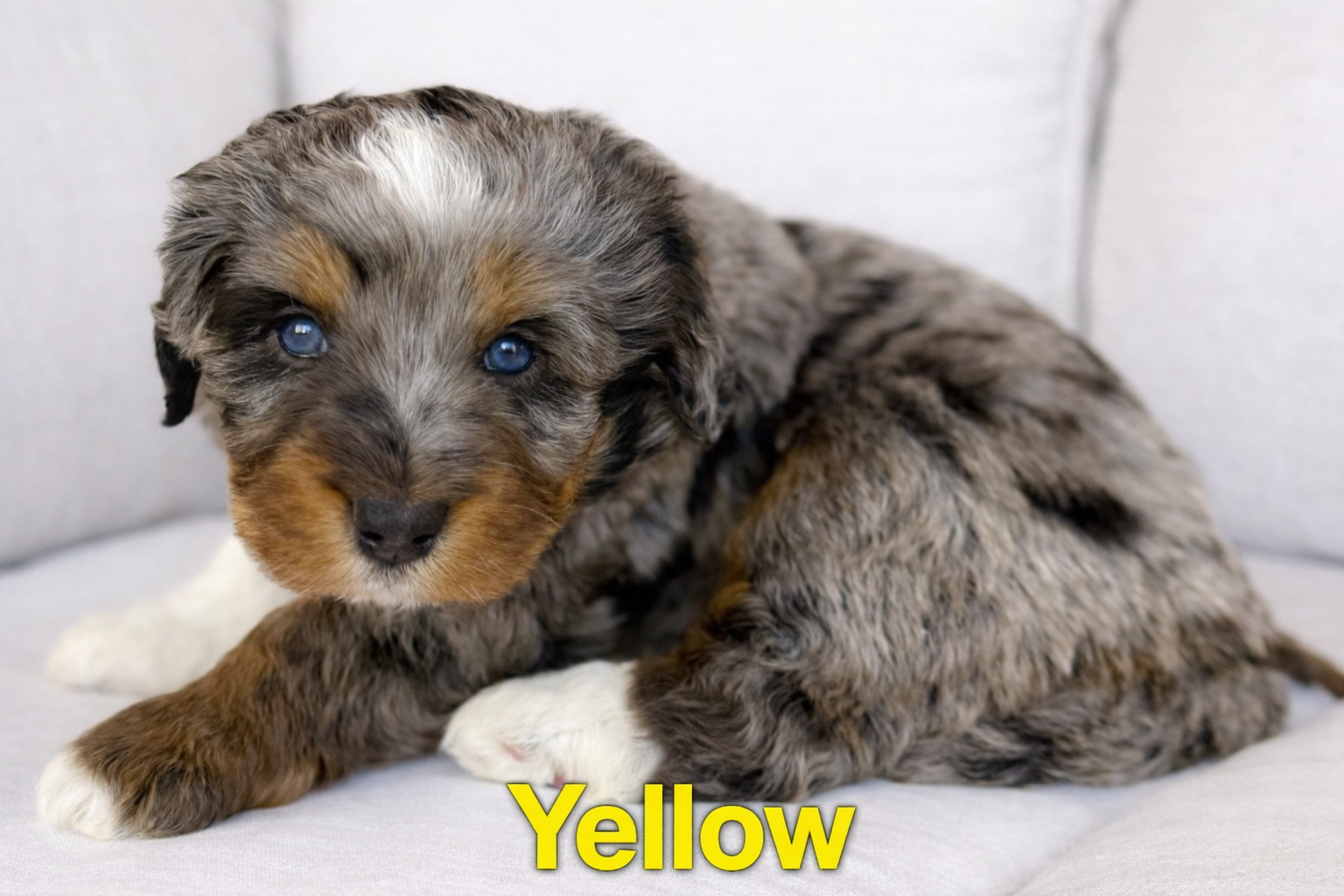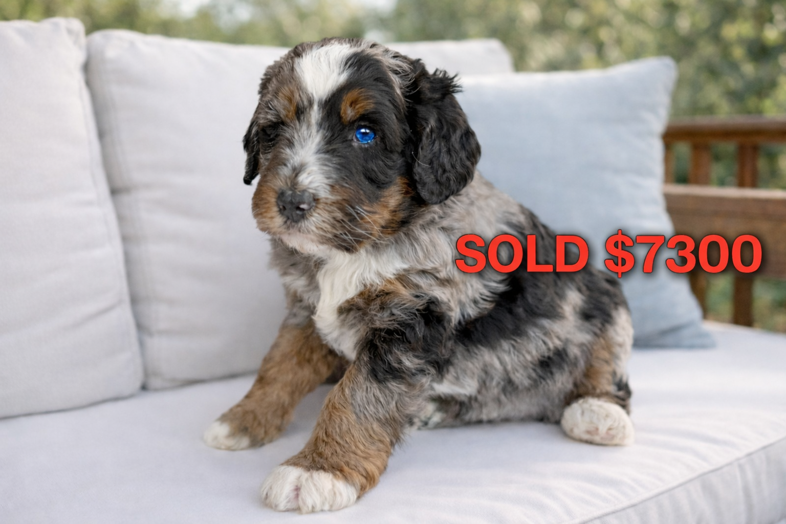 Teddy is a striking 25-lb merle stud with two luminous blue eyes and a compact, refined frame. He is 100% clear on his full genetic health panel and carries the rare and highly coveted merle gene. Genetically, Teddy is Ee, BB, M/M, kyky, atat, D/D, S/S, making him a true phantom-patterned merle with the ability to produce chocolate-based merles and blue-eyed offspring. His temperament is confident, affectionate, and deeply people-oriented — the perfect complement to Maggie’s steady Bernese heart.