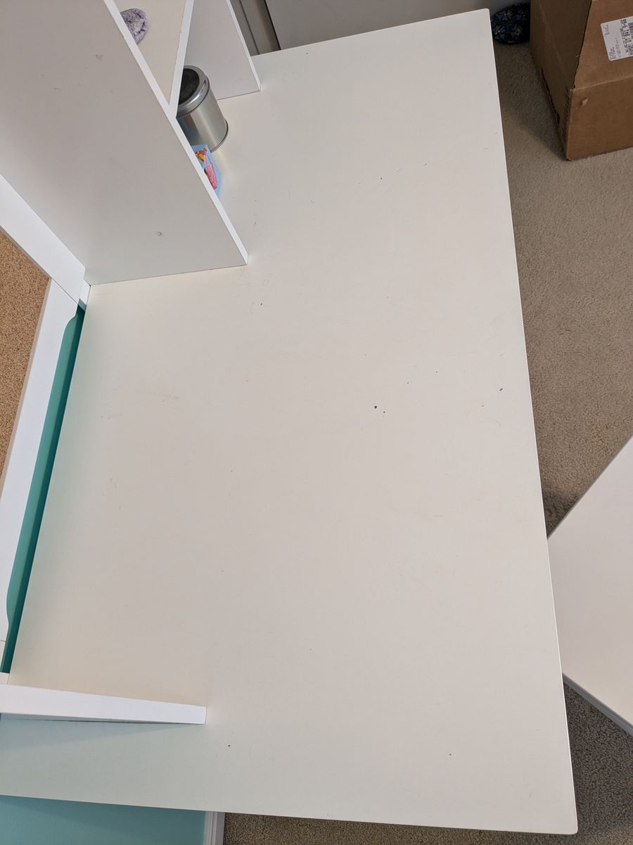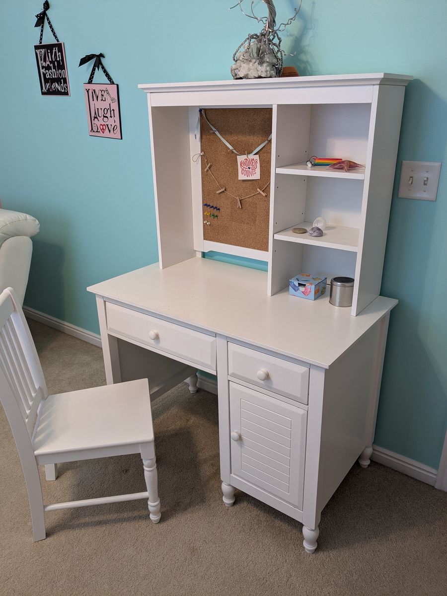Selling a complete white student desk set. Great for a kid's room or homework station. It’s functional, looks nice, and includes everything you need to get set up.
