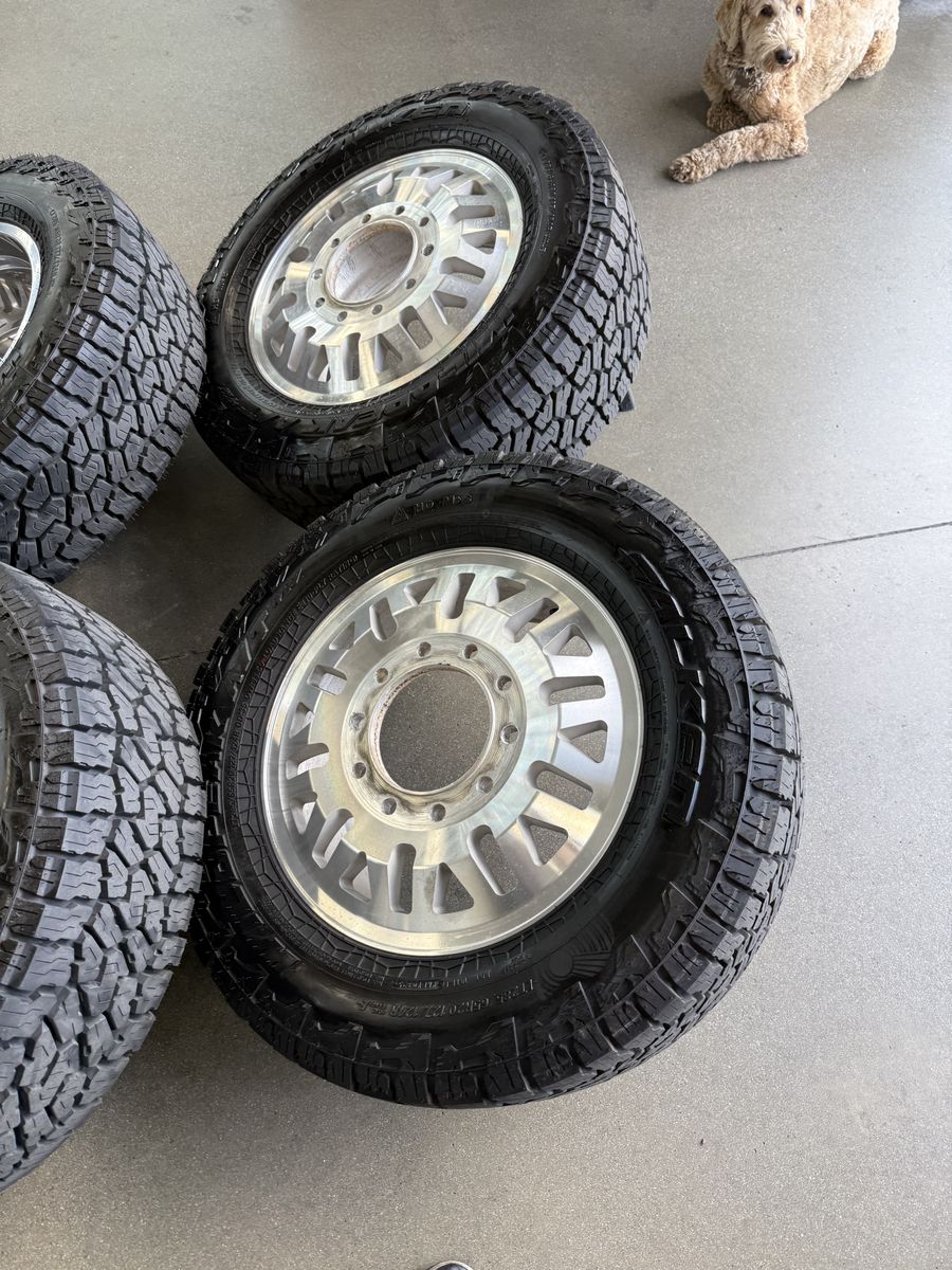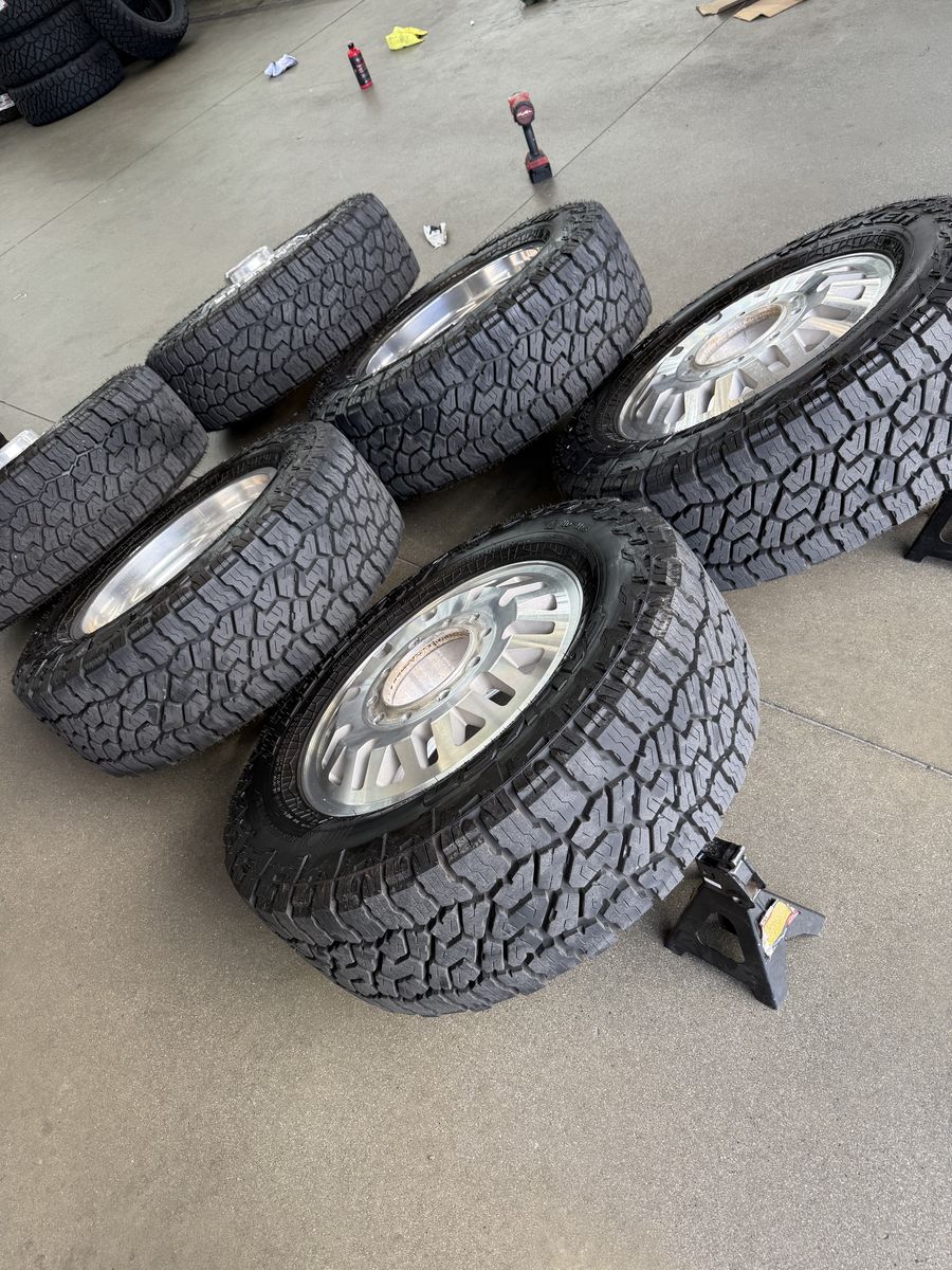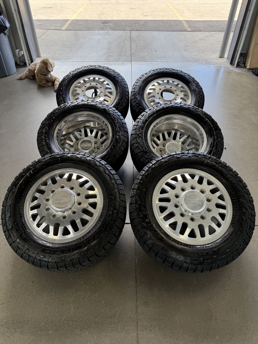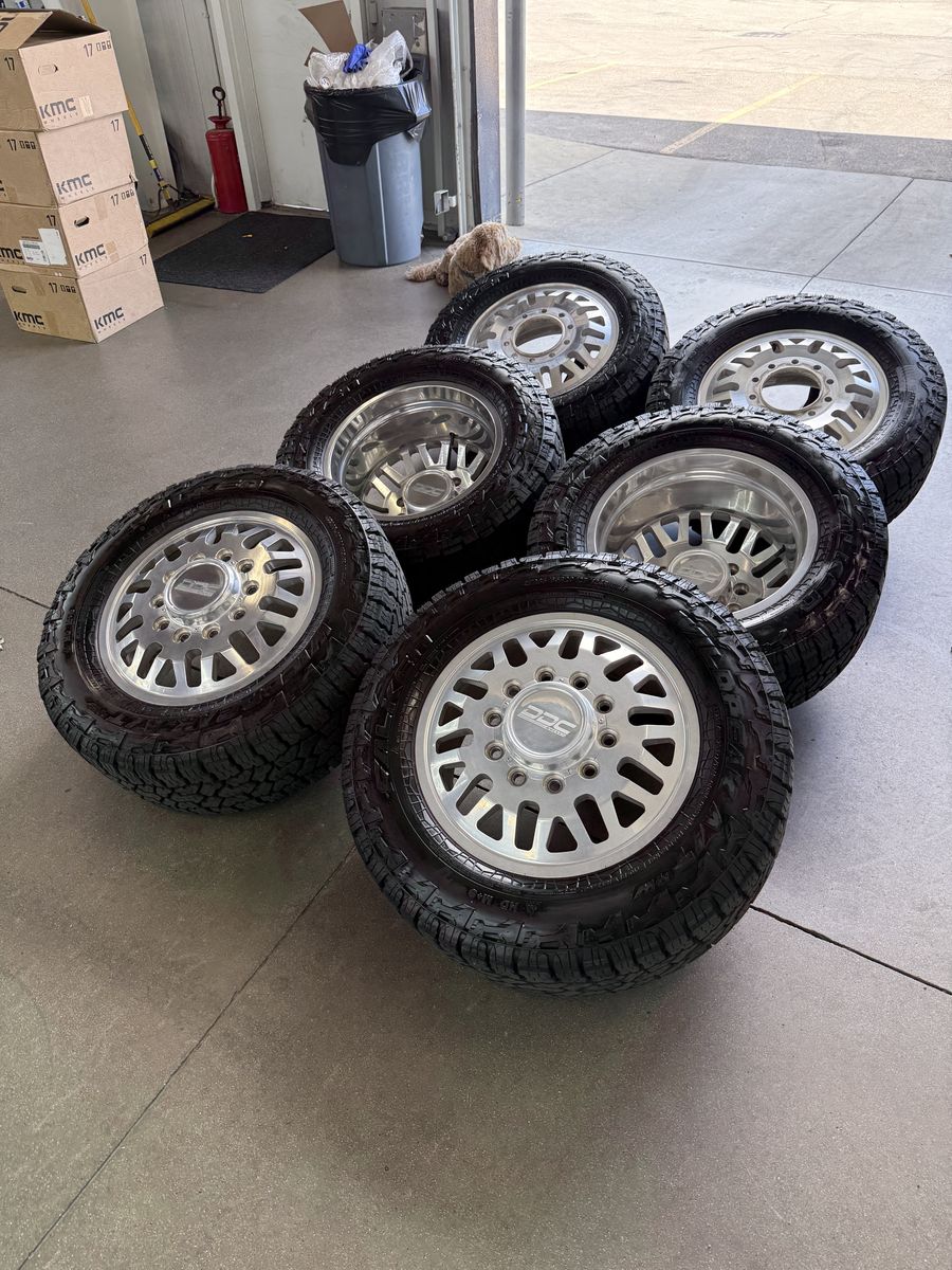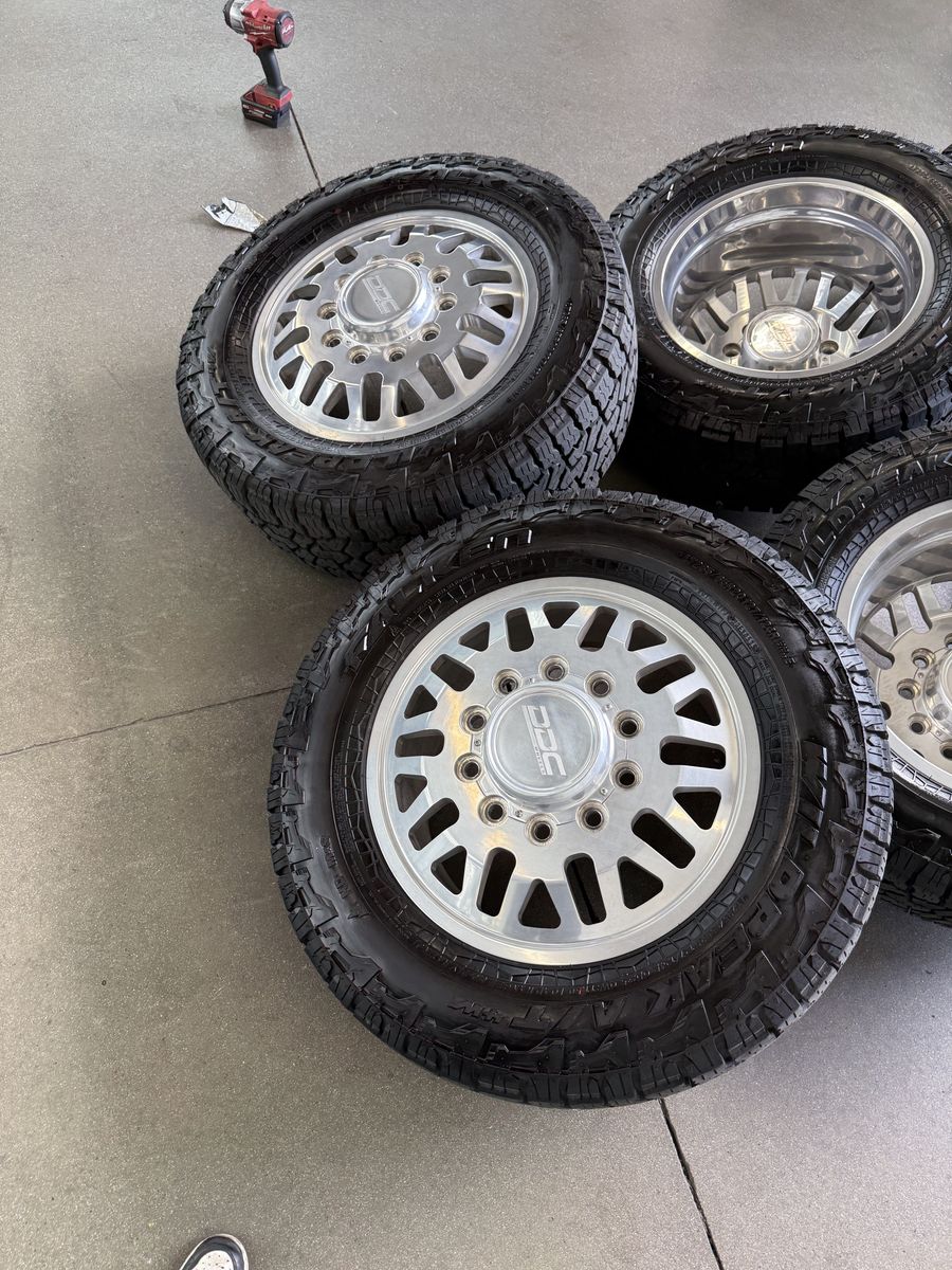 Wheels are 20in DDC wheels model “mesh” top of the line, forged Dually wheels, billet caps are also included. Wheels are in perfect shape, no curb rash dings or damage on them, could use a light hand polish. All center caps Included, wheels are direct bolt 10x225. Tires are 285/65/20 falken wild peak all terrain, load range E, top of the line tires. This setup is over $7500 brand new. Only 2k miles on them.