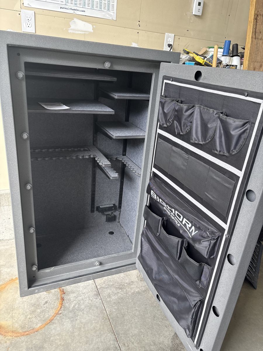 23 cu ft gun safe, 49 long gun capacity. Almost new, some cosmetic wear, great safe. 30 min fire rating, electronic lock, interior outlets and USB with LED lighting. 60” tall x 36” wide x 24” depth 430lbs