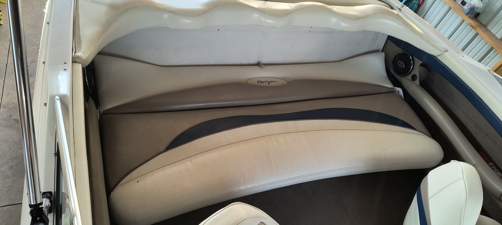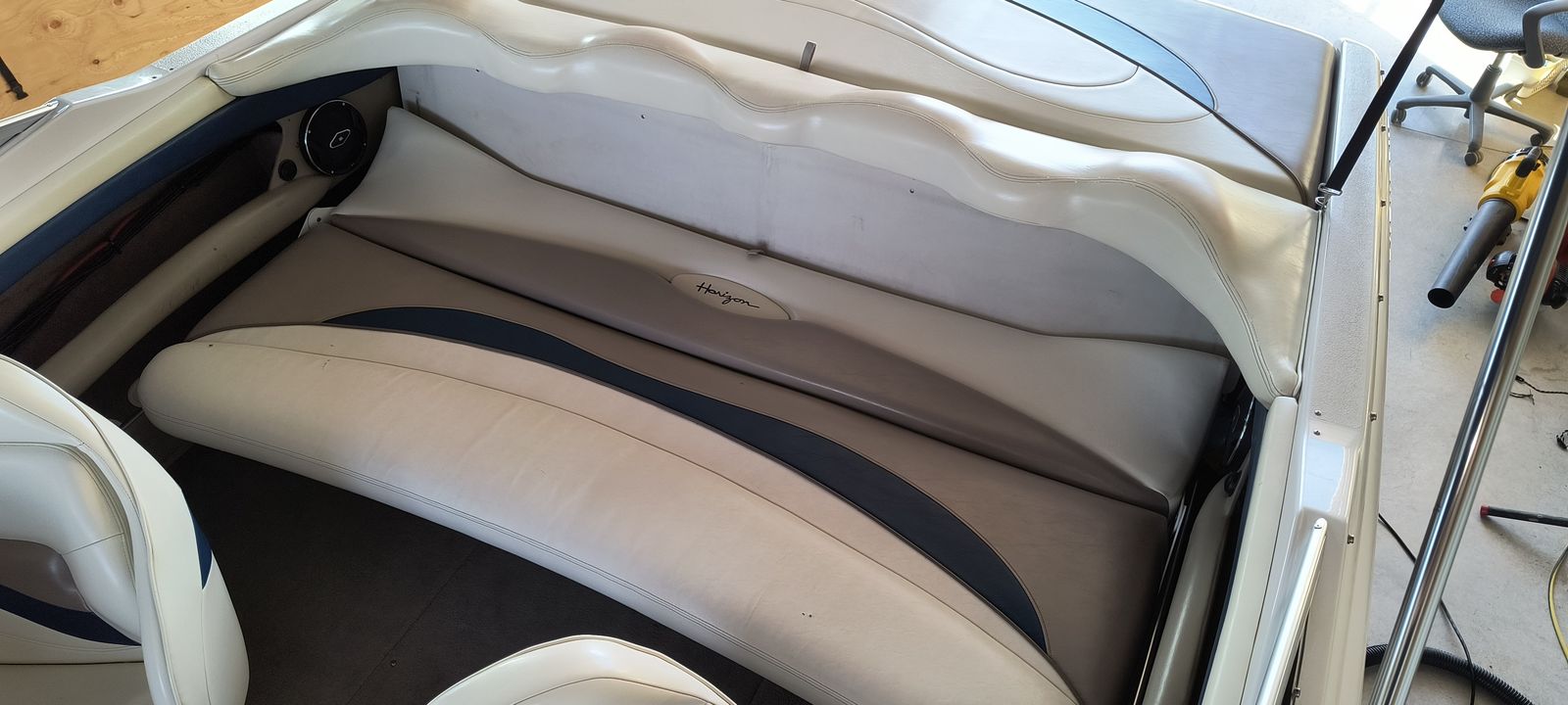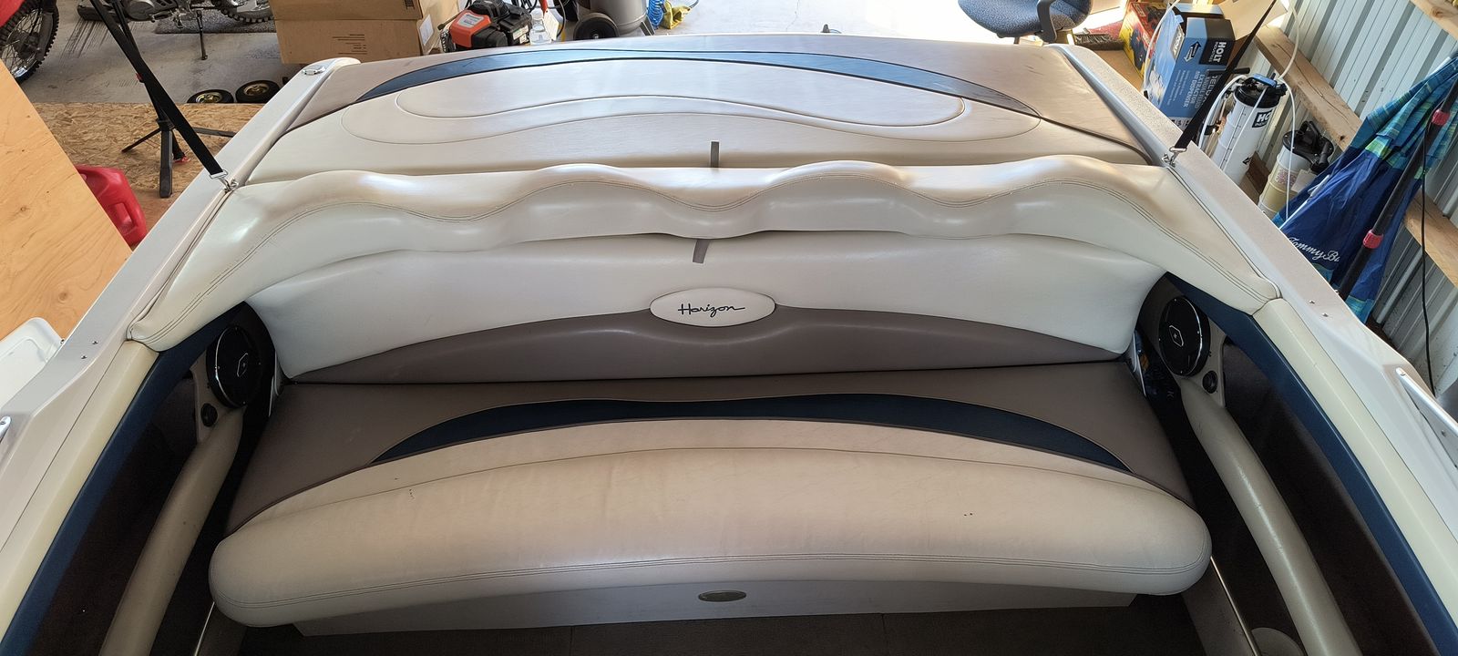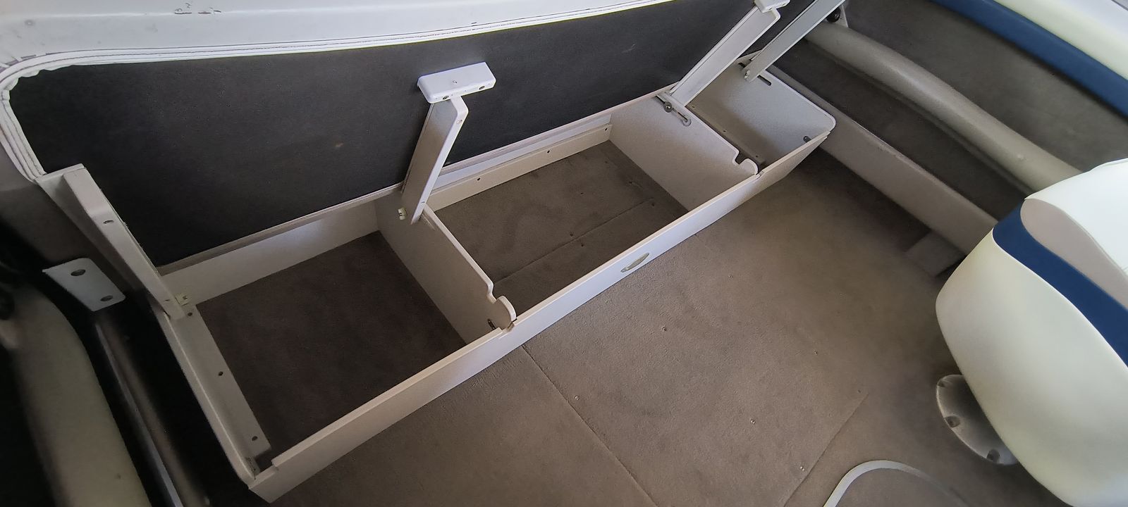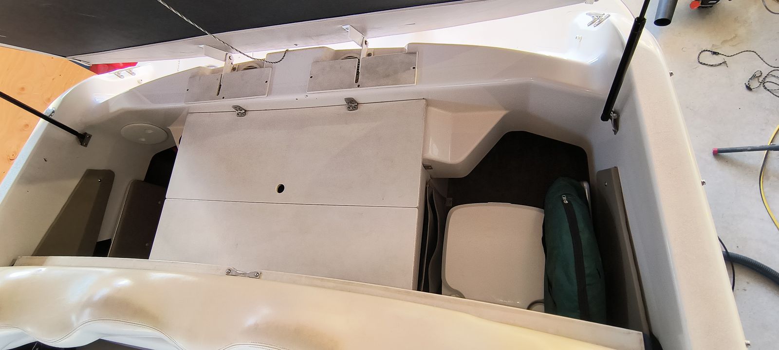 Rear bench folds down into bed with storage under it. Large storage area on either side of the motor. Ski locker. Captain seat's, Front benches have auxiliary cushions that make it into a second bed.