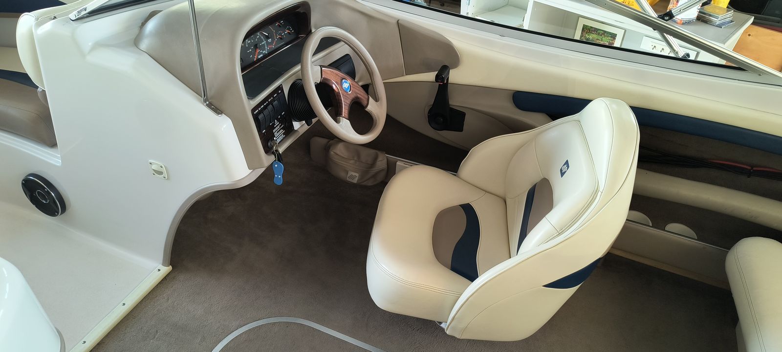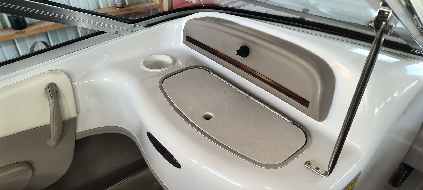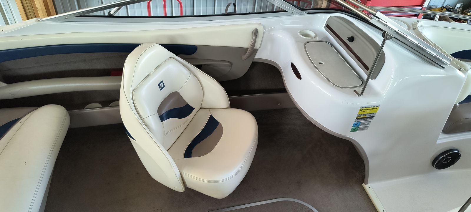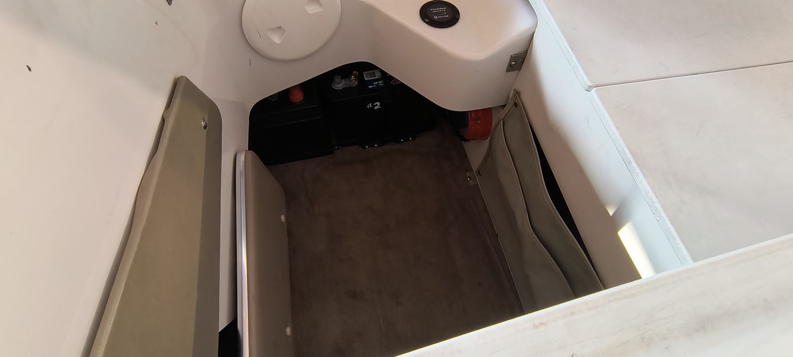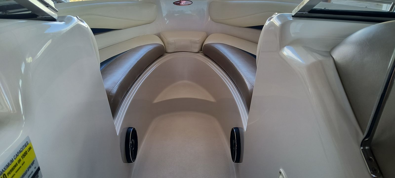 Rear bench folds down into bed with storage under it. Large storage area on either side of the motor. Ski locker. Captain seat's, Front benches have auxiliary cushions that make it into a second bed.