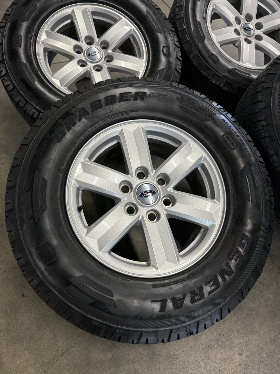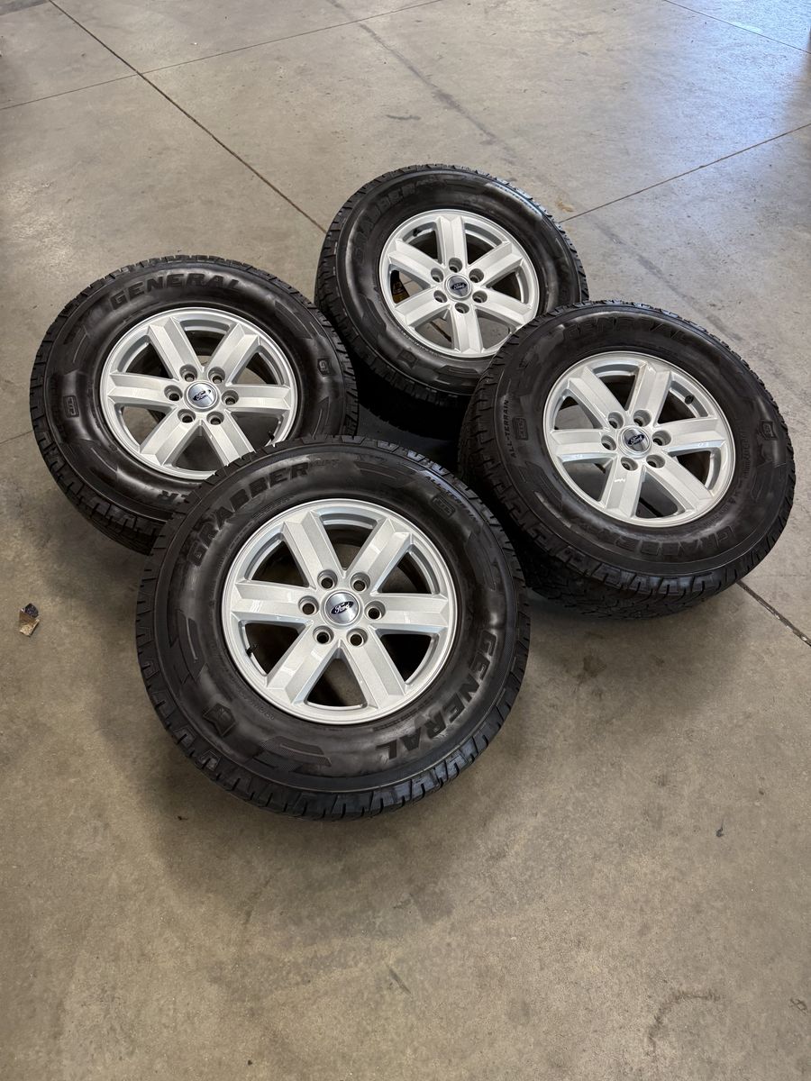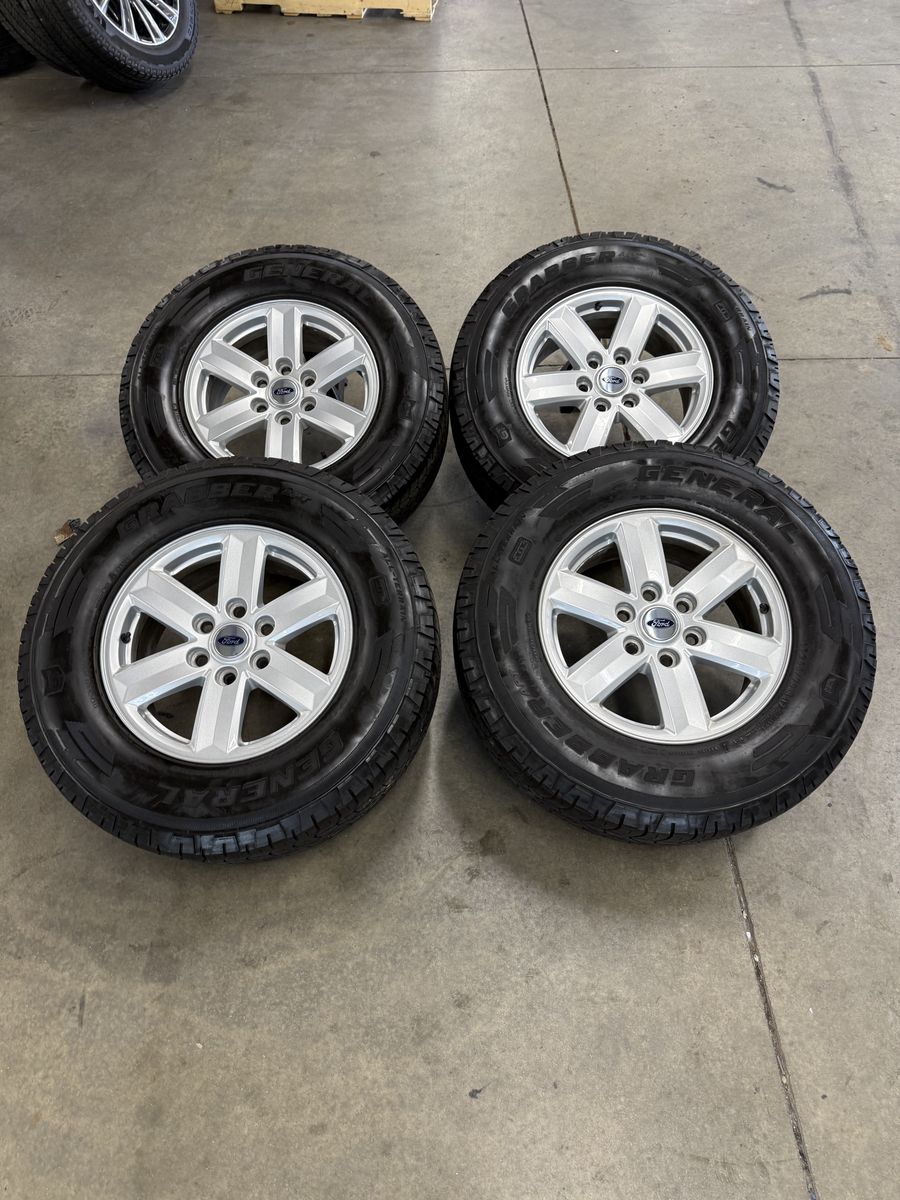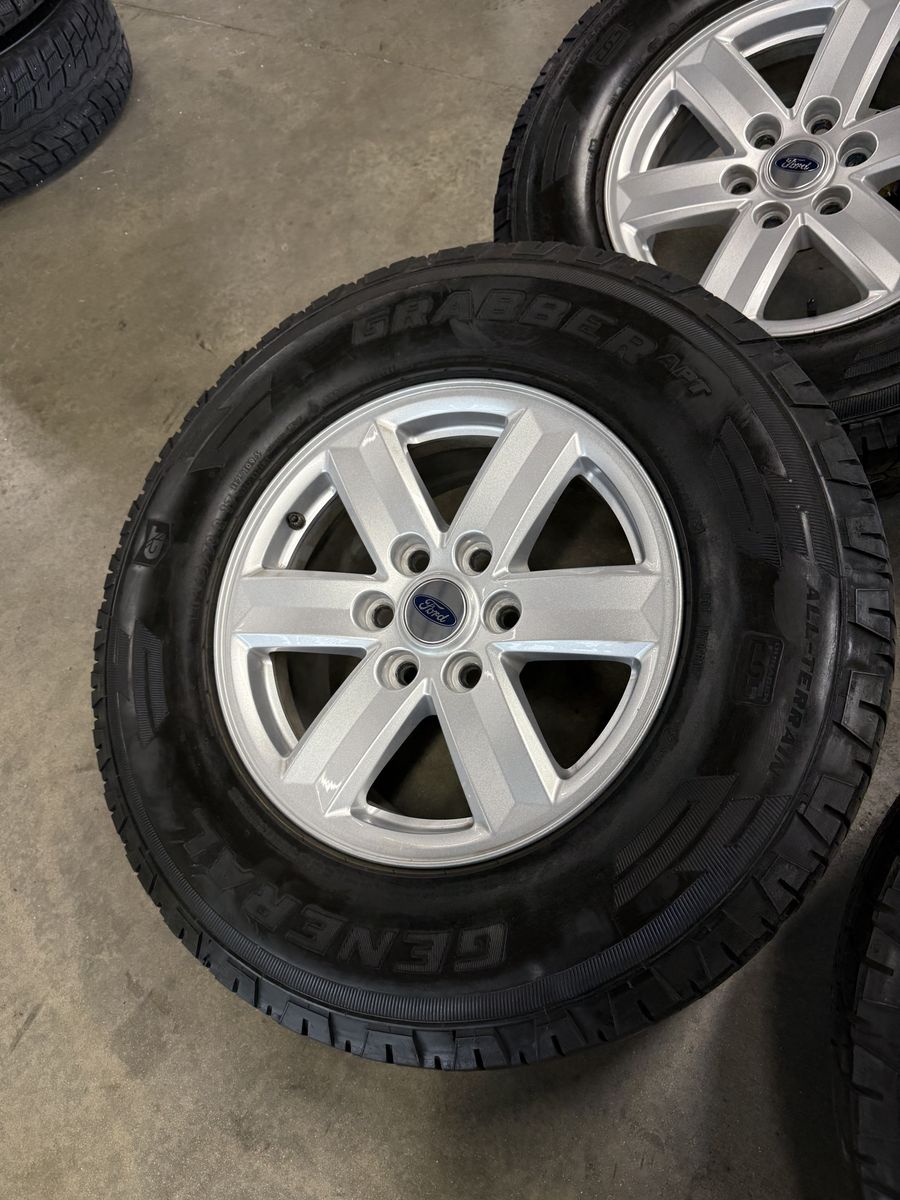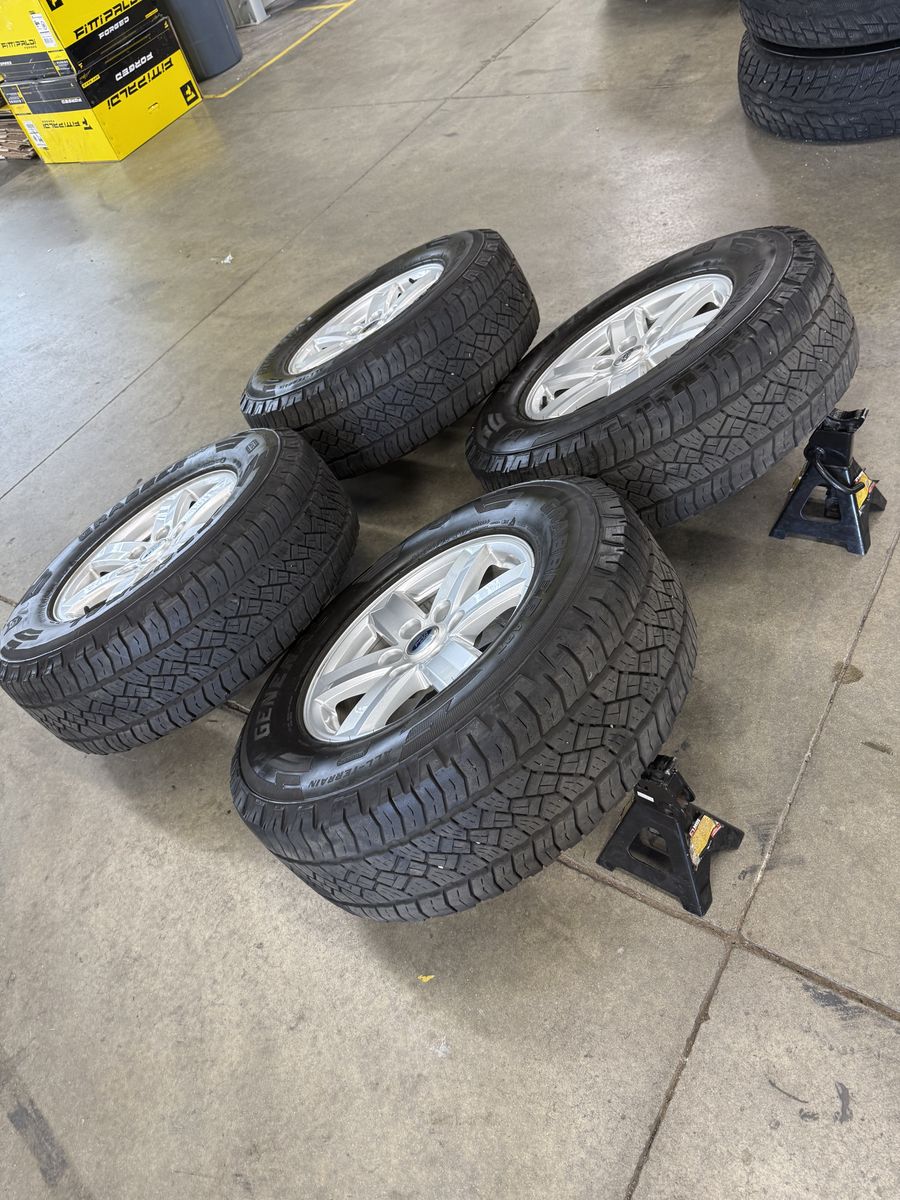 Wheels are 17in OEM wheels off a 2024 ford f150 pickup truck. Wheels are in like new shape, no curb rash, dings or major damage on them, all of the wheels are in like new shape, no curb rash or damage on them wheels are in great shape, as well as all center caps are also included. Tires are 265/70/17 general grabber all terrain, top of the line tires, no patches or plugs in them. Tires have about 75% tread left and are in great shape!