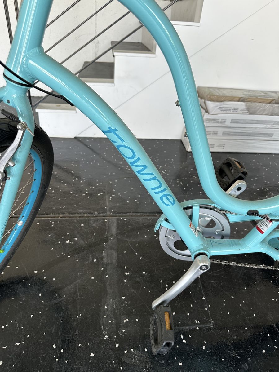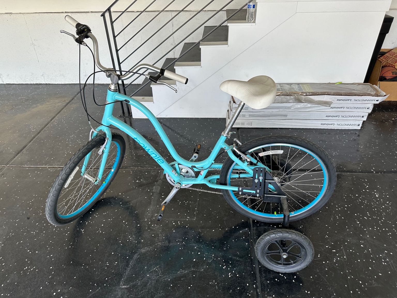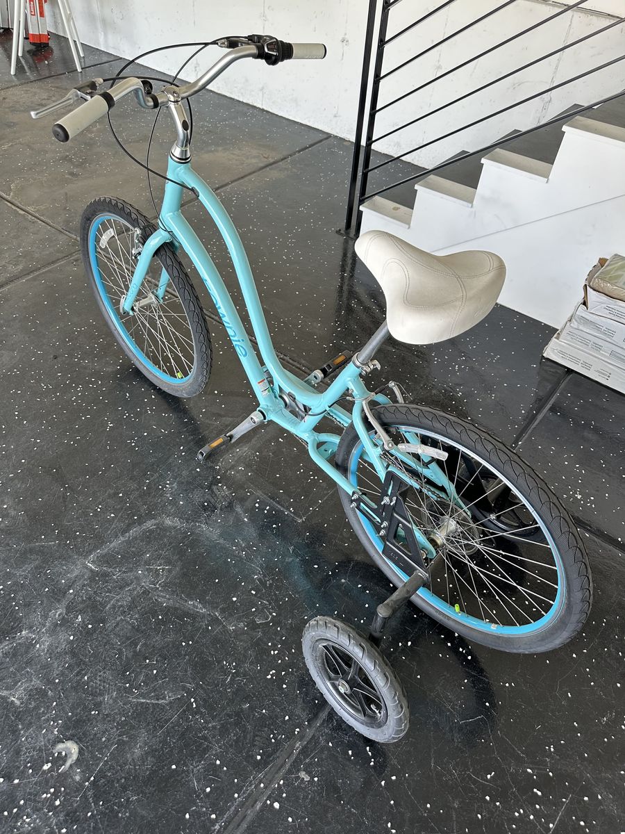 VenmoElectra Townie 7D step-through cruiser in aqua blue with heavy-duty adult training wheels installed.