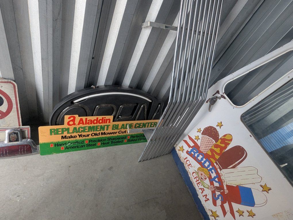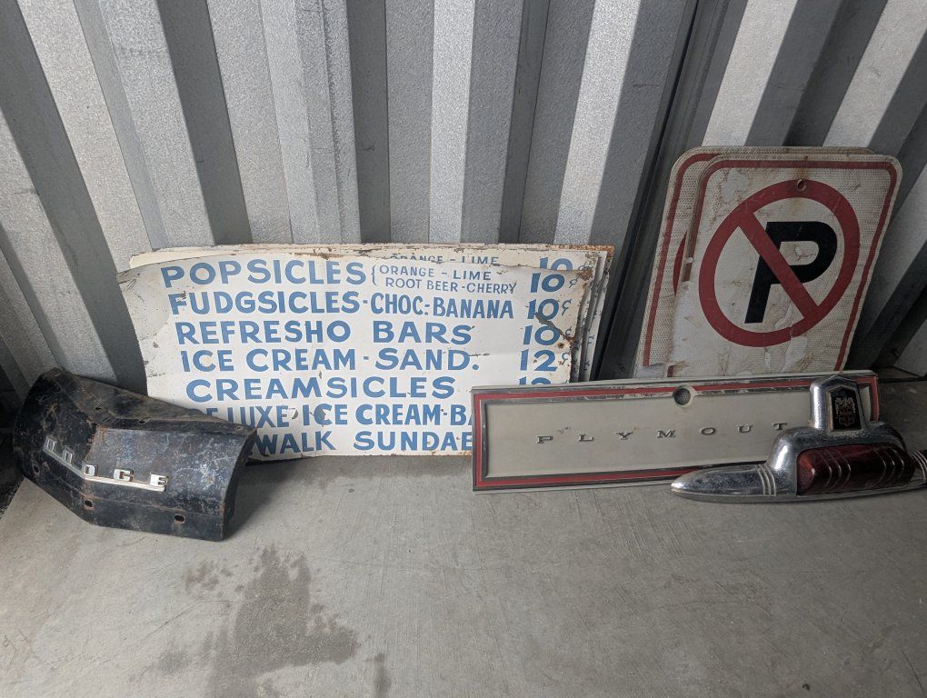 Includes: Vintage car grilles (Chevy, Mercedes, etc.) Petroliana and automotive advertising Road signs and metal signage License plates and parts Old hardware, display pieces, and garage decor Good mix of display-ready items and project pieces.
