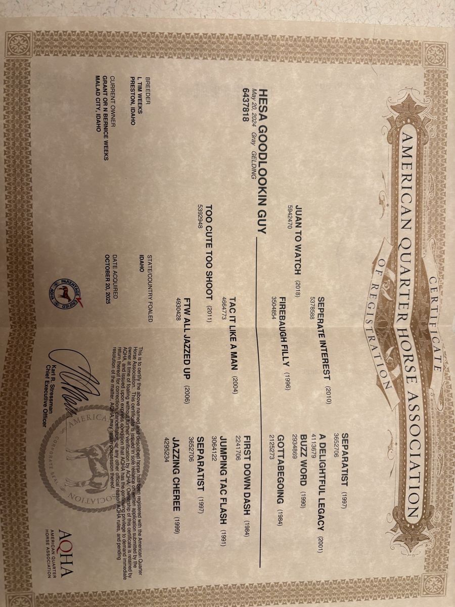 He will turn 2 on May 20th. Has had 90 days on him. Will make someone a great horse. Papered AQHA. Currently has shoes on. He is not broke, he is started. Come take a look.