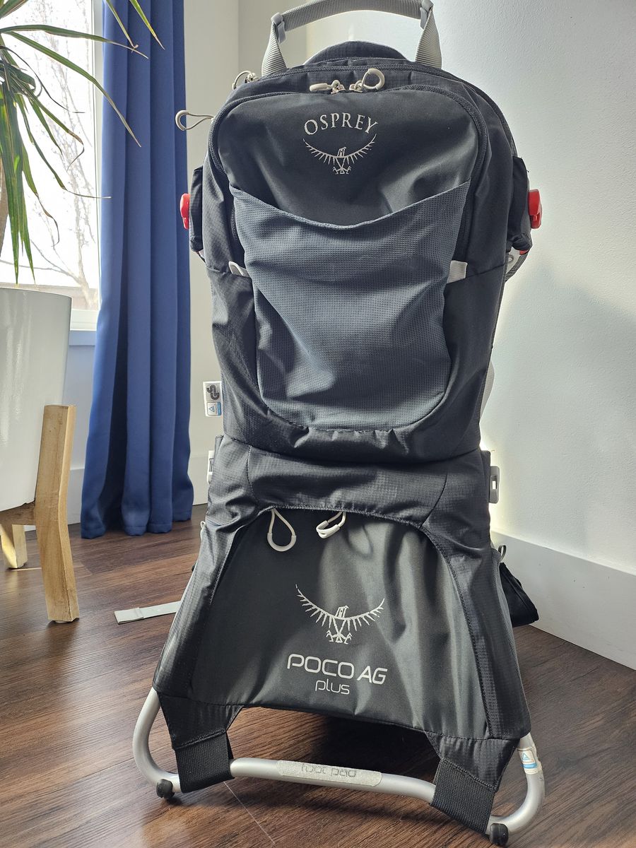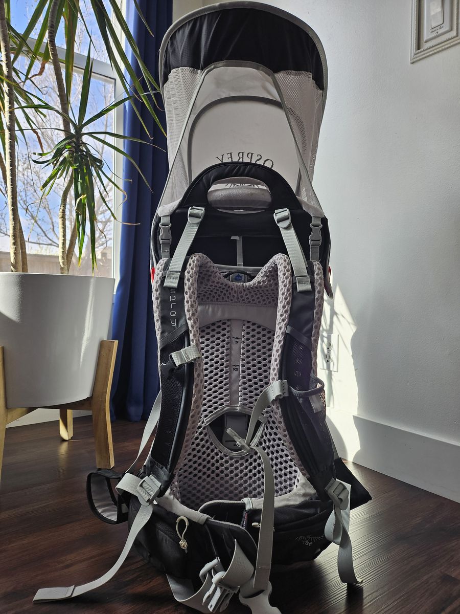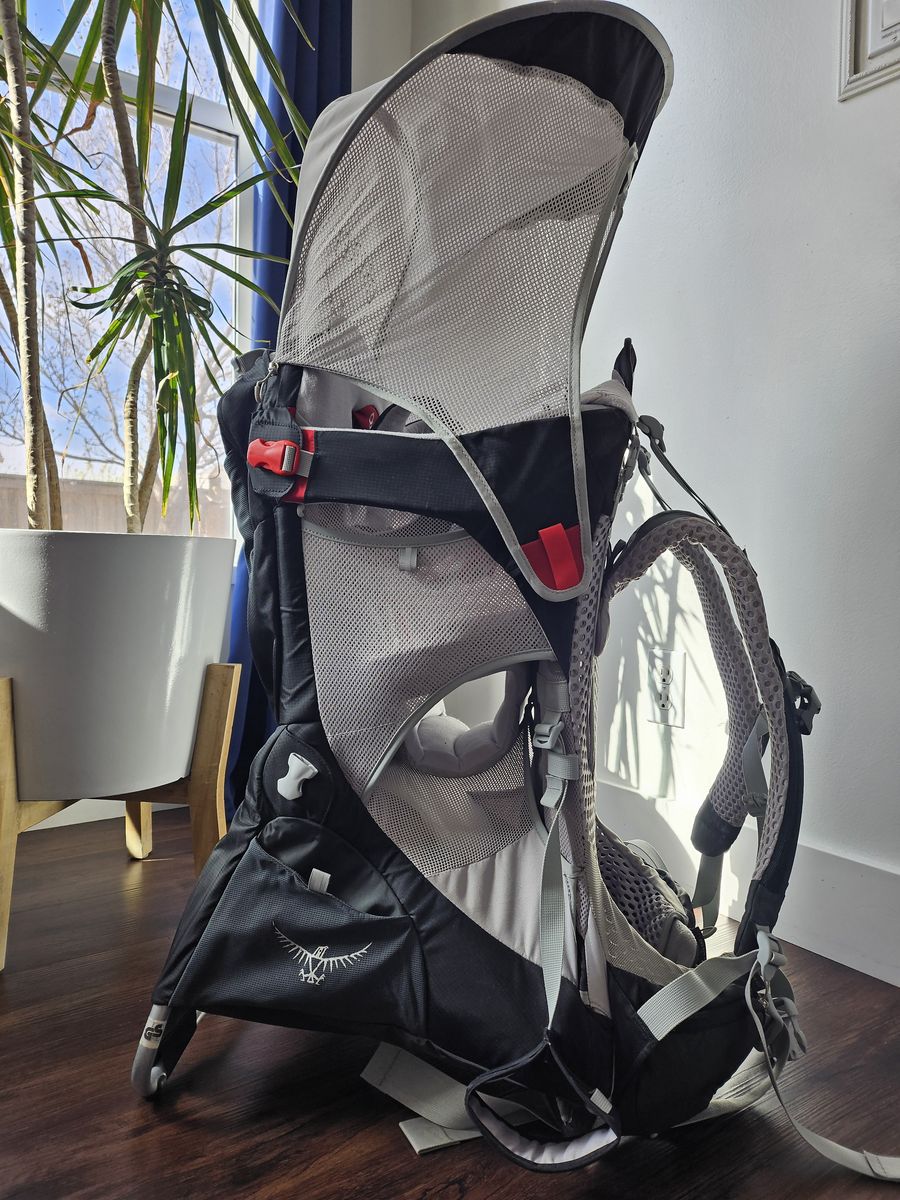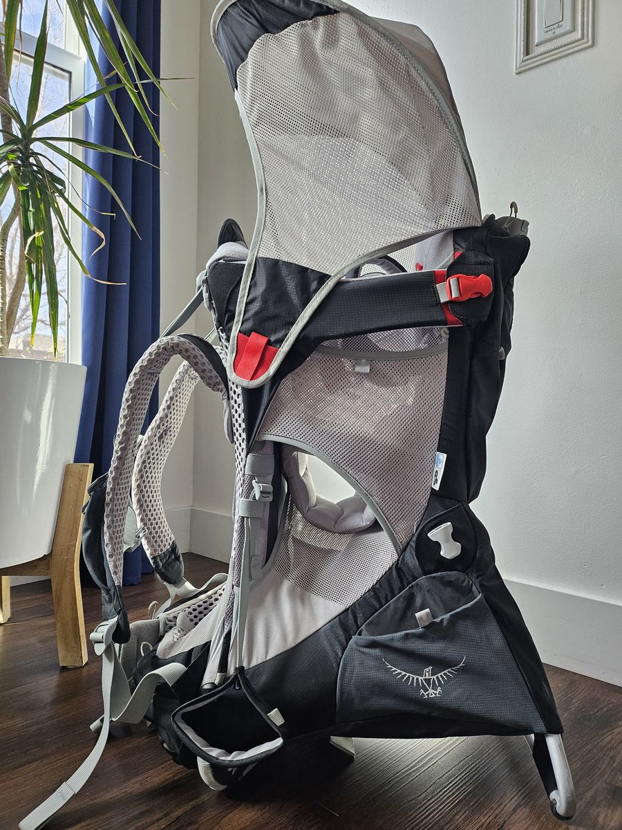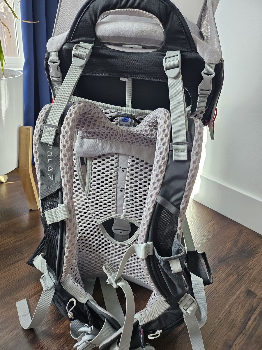 Highlights: Lightweight aluminum frame with 3D tensioned mesh backpanel and harness for breathable, comfortable carry. Fully adjustable 5-point child safety harness, padded drool pad (removable/washable), adjustable seat height, and foot stirrups. Extra-large lower zippered compartment + multiple pockets (zippered/padded hipbelt pockets, front panel, side stretch mesh). Adjustable torso fit and Fit-on-the-Fly hipbelt for adults of different sizes. Built-in sunshade, sternum strap with whistle, hydration sleeve, top/side grab handles, and foldable kickstand. Durable 210D nylon construction that holds up well on trails.
