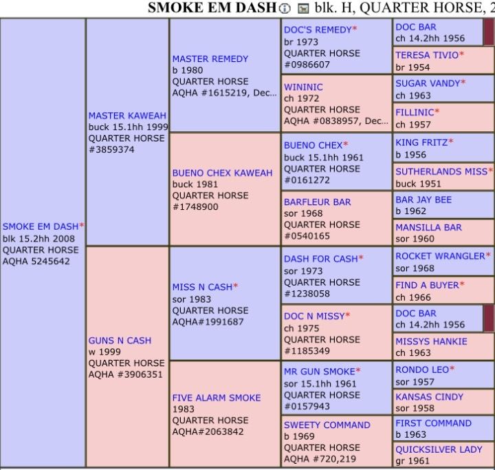 SMOKE EM DASH’s 2nd dam, FIVE ALARM SMOKE, is daughter of AQHA Hall Of Famer, MR GUN SMOKE. He is also in the NRCHA and NRHA Hall Of Fame(s).