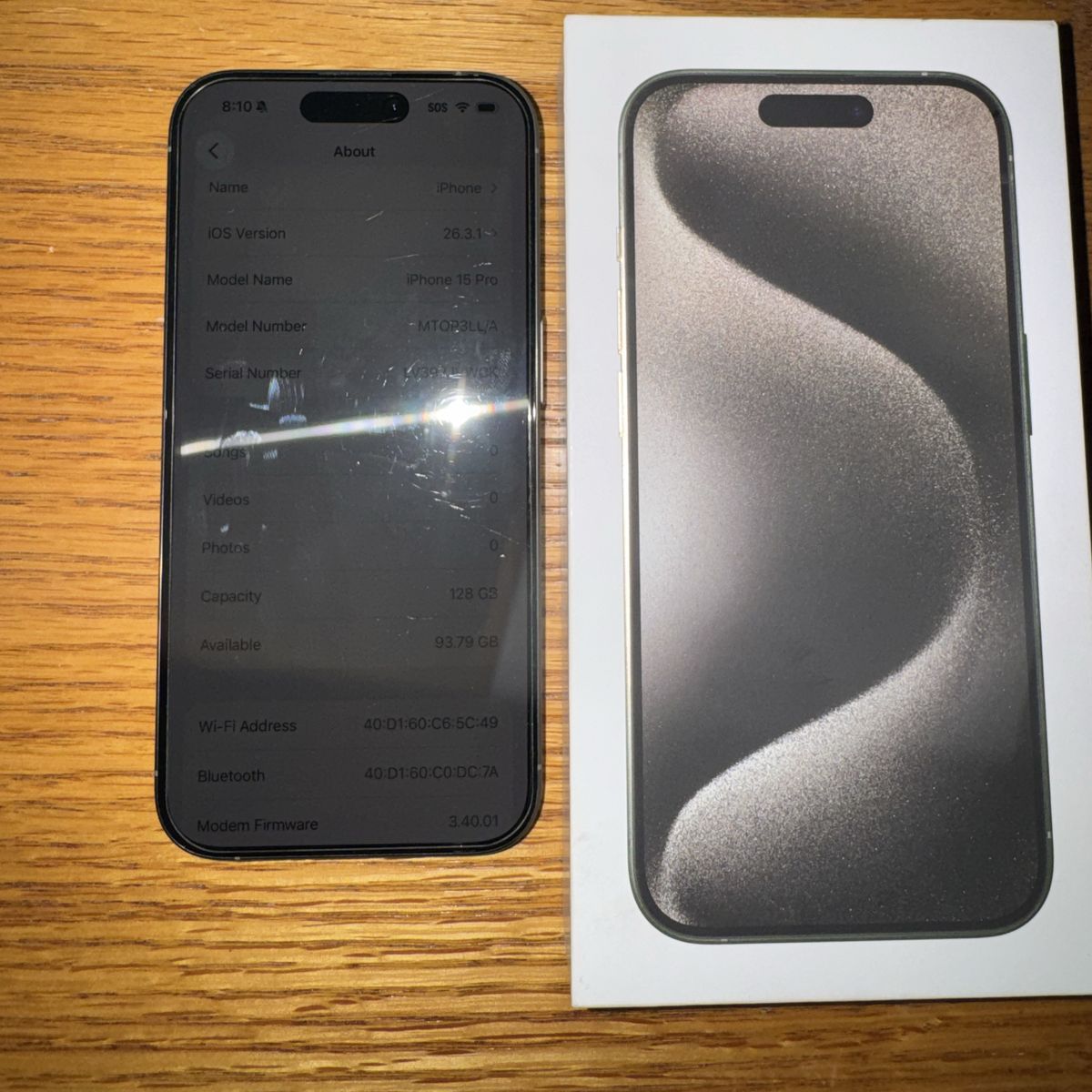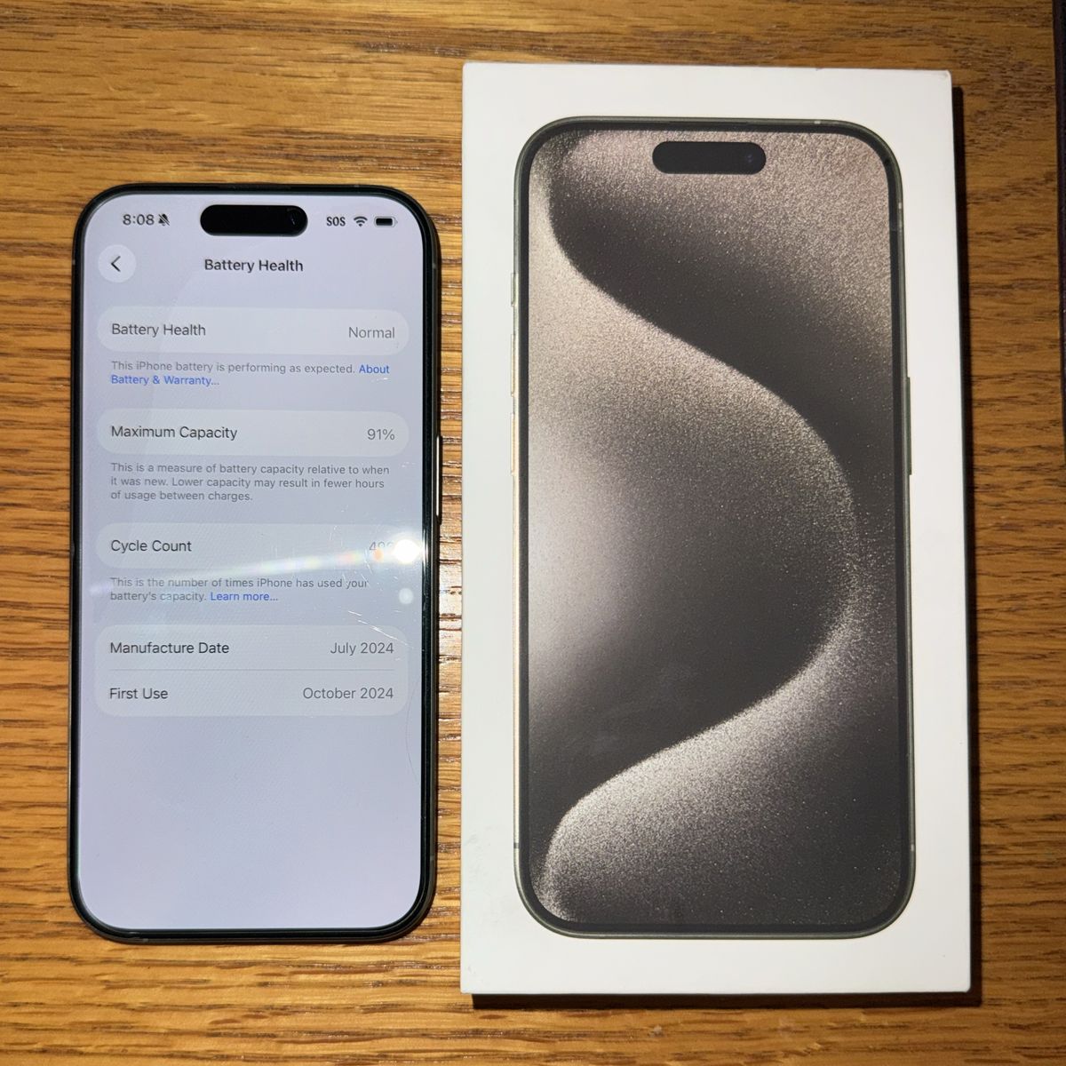 I sell this iPhone 15 pro unlocked for any phone company and any country very well cared for has 91% battery health and has 128 GB, has original box and charger was always in its protector, and screen protector and rear cameras are still in very good condition the details are in the photos any questions do not hesitate to contact me, only really interested people.!!