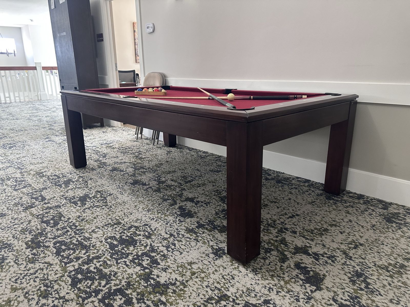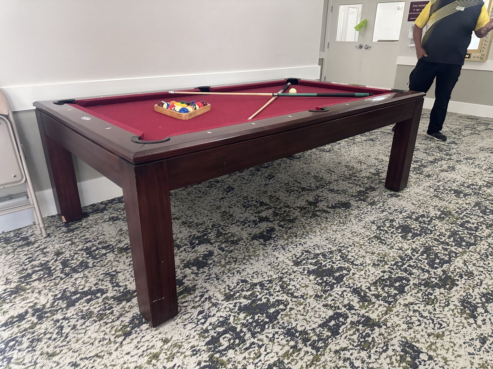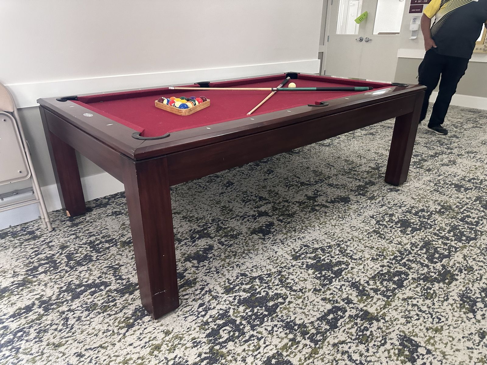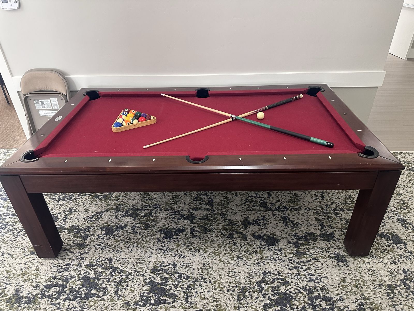 We are selling our pool table. Works great. Comes with all the balls and about 4-6 sticks and the holder.