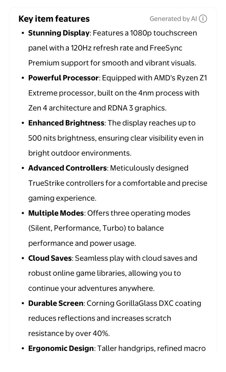 Stunning Display: Features a 1080p touchscreen panel with a 120Hz refresh rate and FreeSync Premium support for smooth and vibrant visuals. • Powerful Processor: Equipped with AMD's Ryzen Z1 Extreme processor, built on the 4nm process with Zen 4 architecture and RDNA 3 graphics. • Enhanced Brightness: The display reaches up to 500 nits brightness, ensuring clear visibility even in bright outdoor environments. • Advanced Controllers: Meticulously designed TrueStrike controllers for a comfortable and precise gaming experience. • Multiple Modes: Offers three operating modes (Silent, Performance, Turbo) to balance performance and power usage. • Cloud Saves: Seamless play with cloud saves and robust online game libraries, allowing you to continue your adventures anywhere. • Durable Screen: Corning GorillaGlass DXC coating reduces reflections and increases scratch resistance by over 40%.