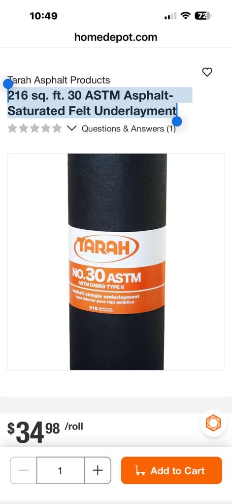 PayPal216 sq. ft. 30 ASTM Asphalt-Saturated Felt Underlayment. Tarah brand. Brand new.