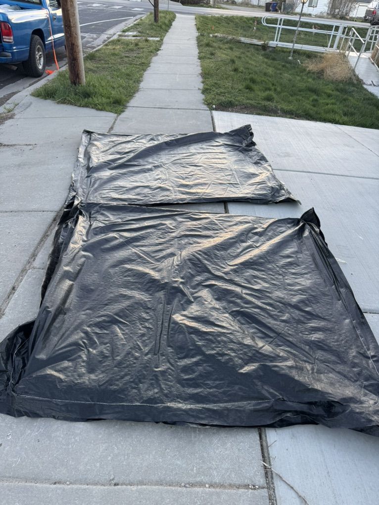 Each square measures 5 feet by 5 feet by an inch and a quarter thick. I have two available. They are both new and sewn into a black tarp for transport. They can be rolled for transport, but make a roll about 18” in diameter because of how thick and sturdy they are. Currently stored flat.