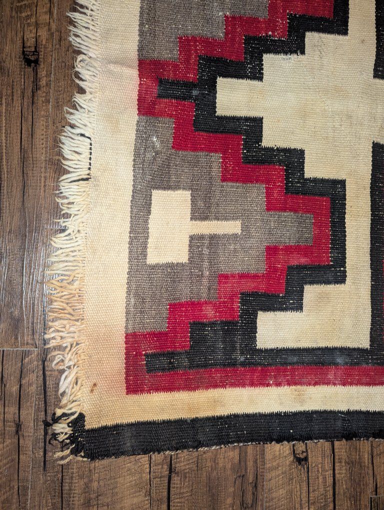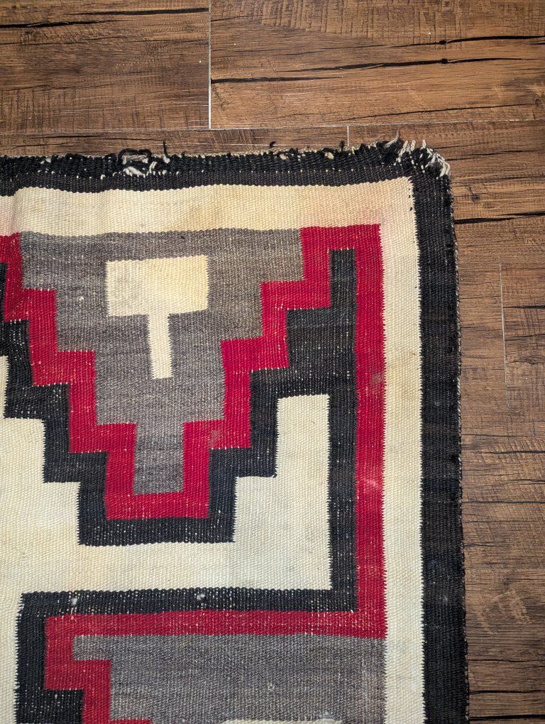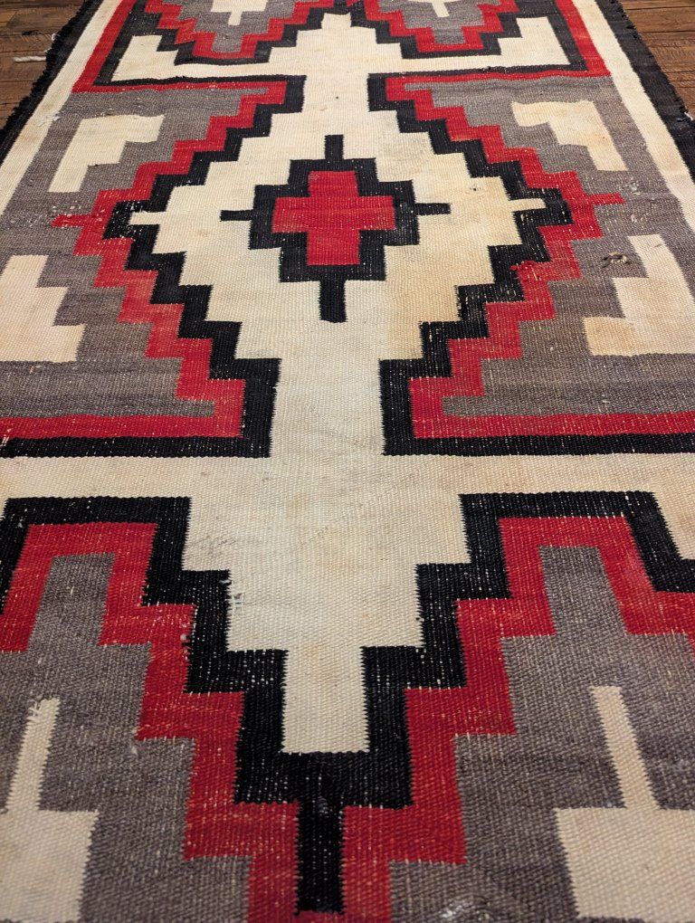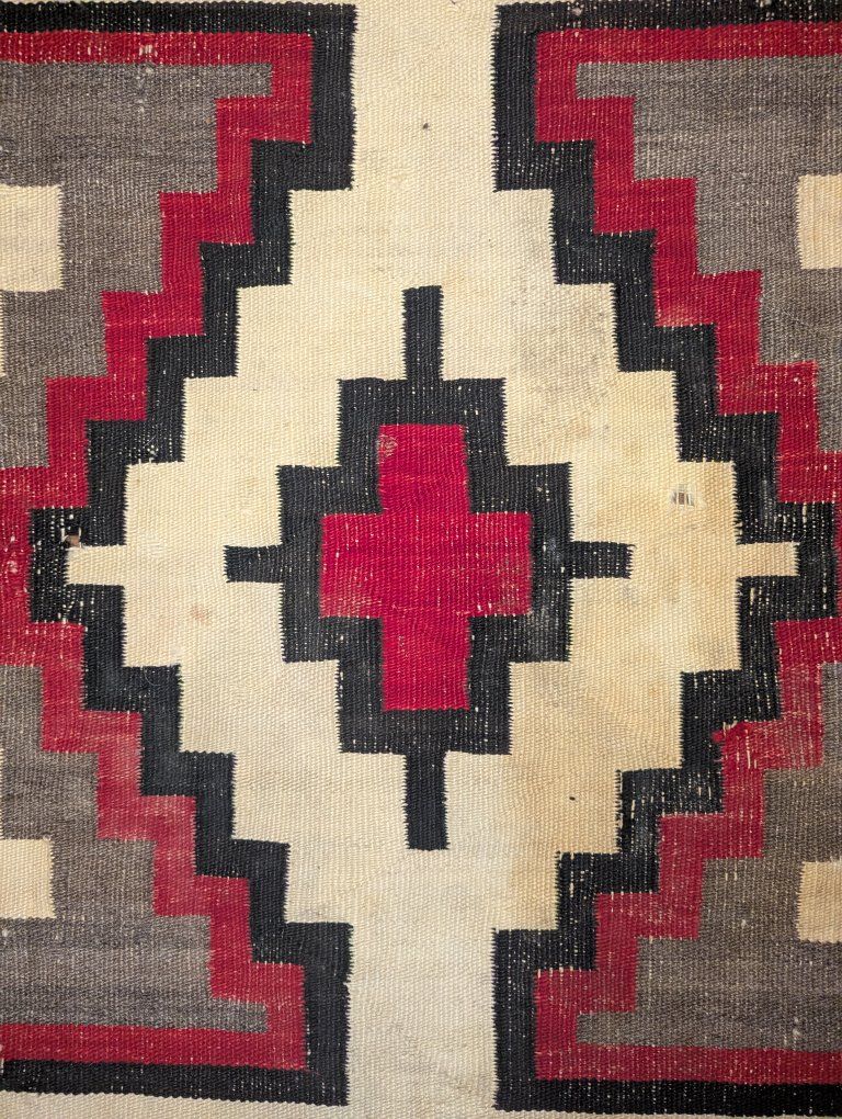 GooglePayVintage Navajo rug with a strong geometric layout with a central diamond and cross form, stepped terracing, and what is often described as a lizard or lightning style motif, a dynamic design element seen in Western Navajo weavings. The overall composition has excellent visual balance and strong contrast.