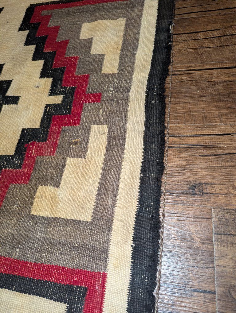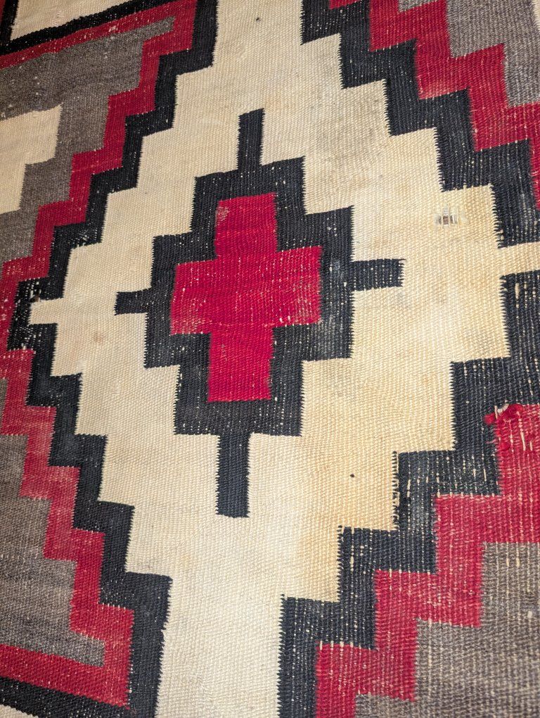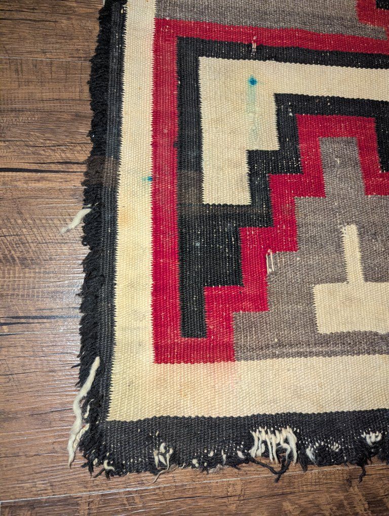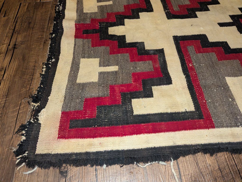 GooglePayVintage Navajo rug with a strong geometric layout with a central diamond and cross form, stepped terracing, and what is often described as a lizard or lightning style motif, a dynamic design element seen in Western Navajo weavings. The overall composition has excellent visual balance and strong contrast.