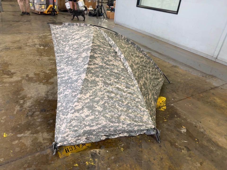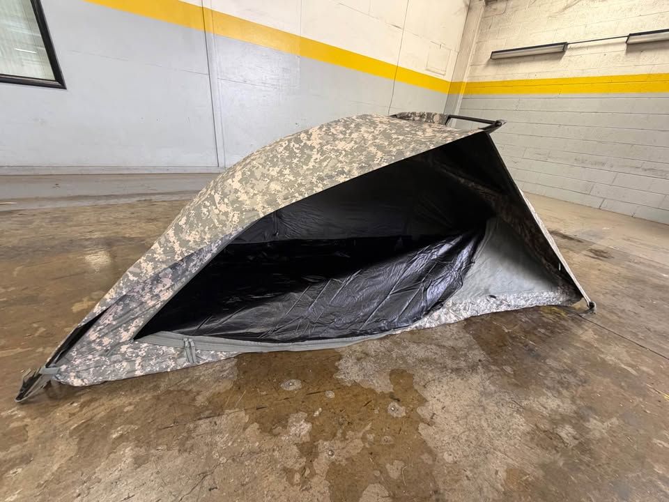 These are genuine U.S. military-issued 1-person combat shelters in ACU digital camo — built for soldiers operating in harsh, unpredictable conditions.