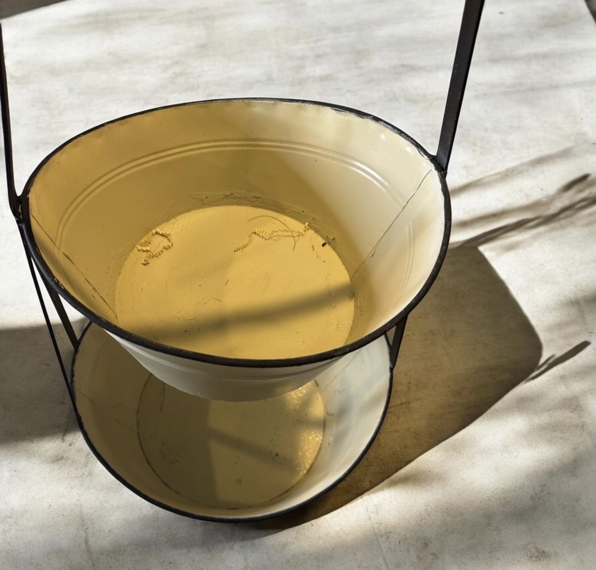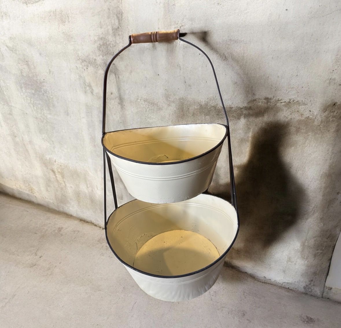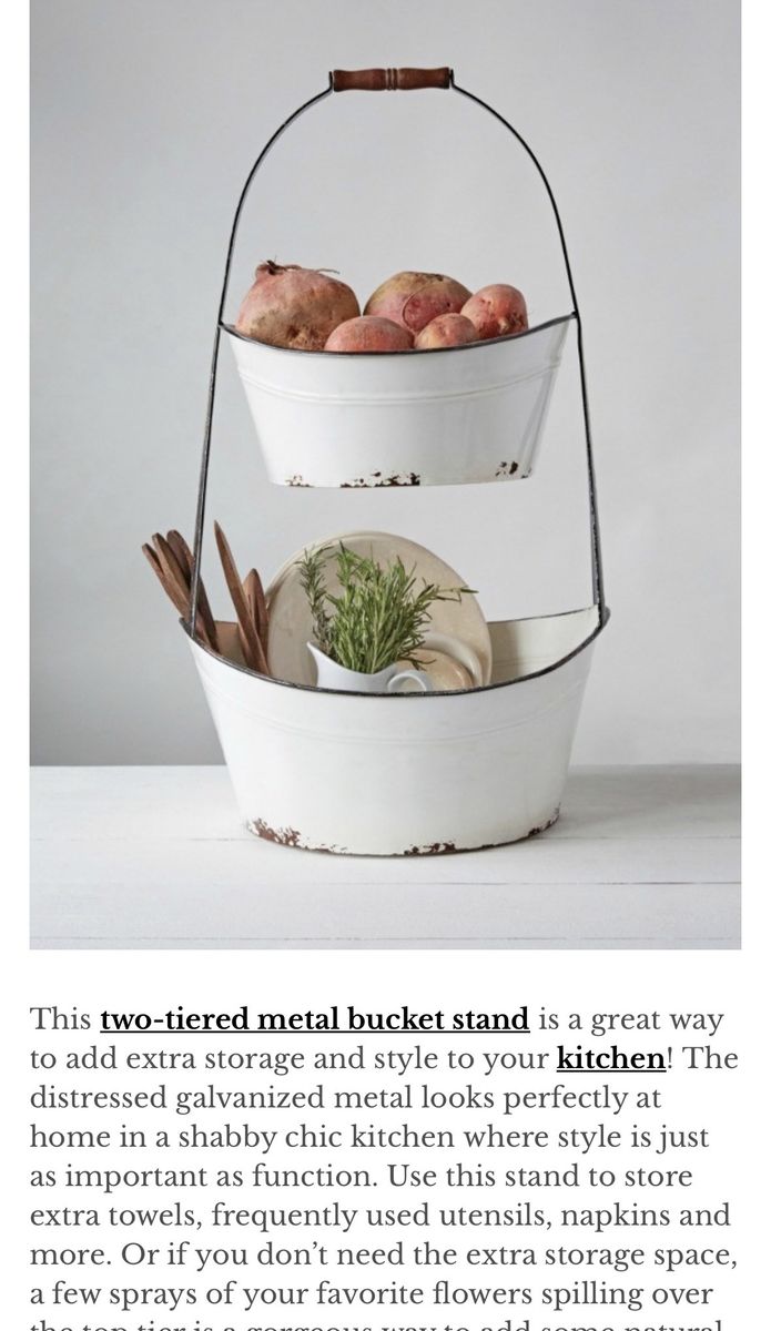 VenmoThe rustic style of our Black and White Enamel 2 Tier Bucket Stand is a striking way to organize your home or show off your favorite decorative accents. This classic white enamel storage bucket features black trim, a metal frame, a wooden handle and a rustic. Use this tall tiered storage stand for anything from plants or crafts supplies to washroom essentials. SPECIFICATIONS metal and wood 16" × 15.25" × 27.75" h Cream colored