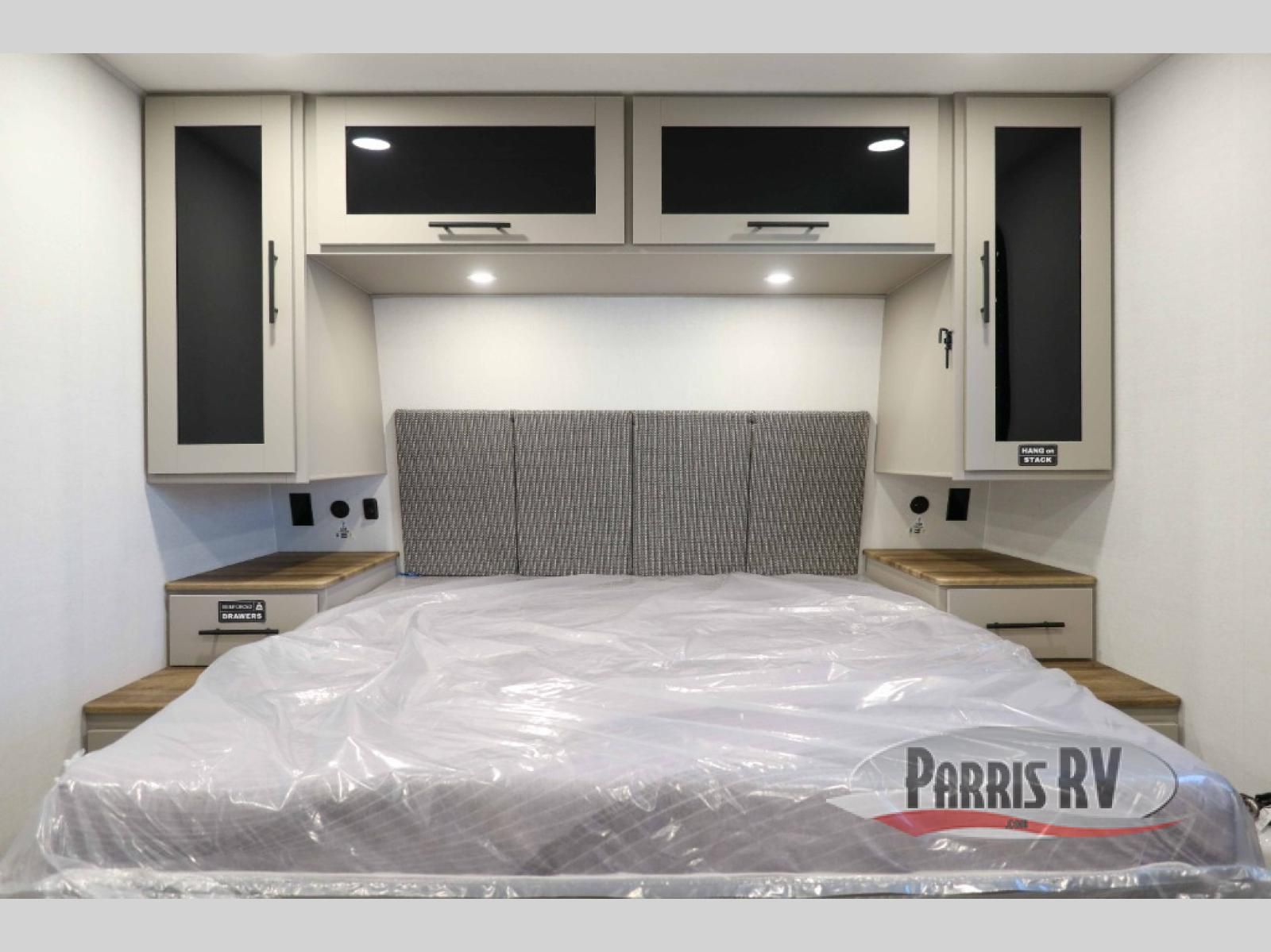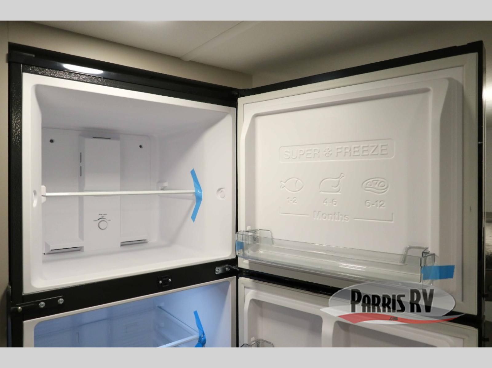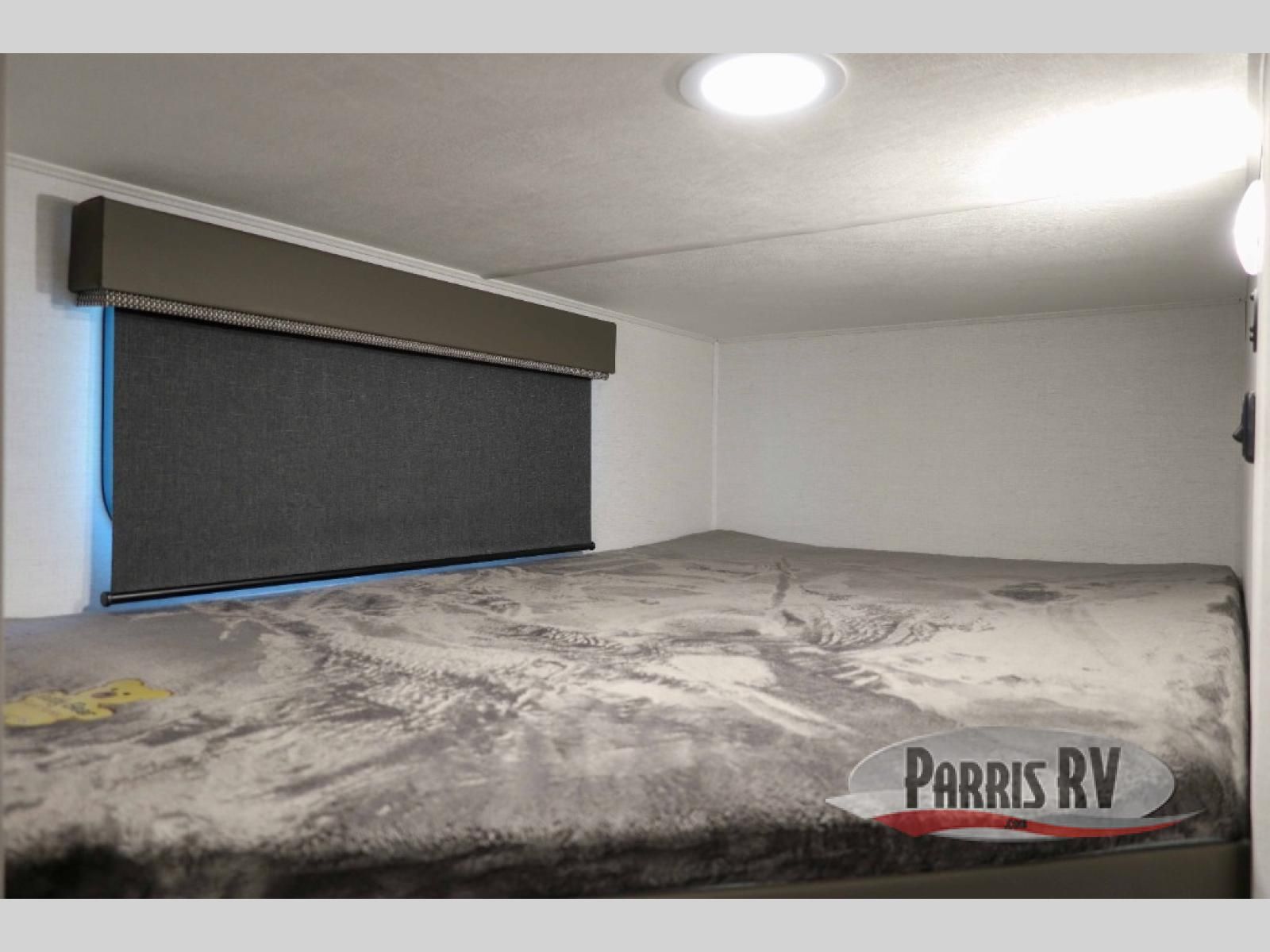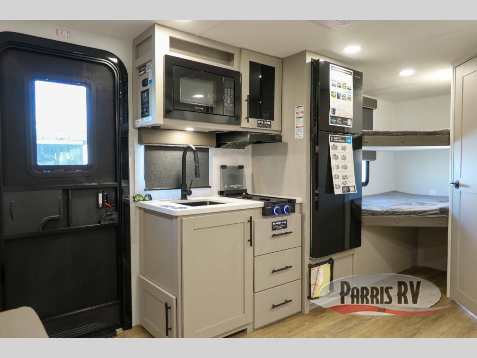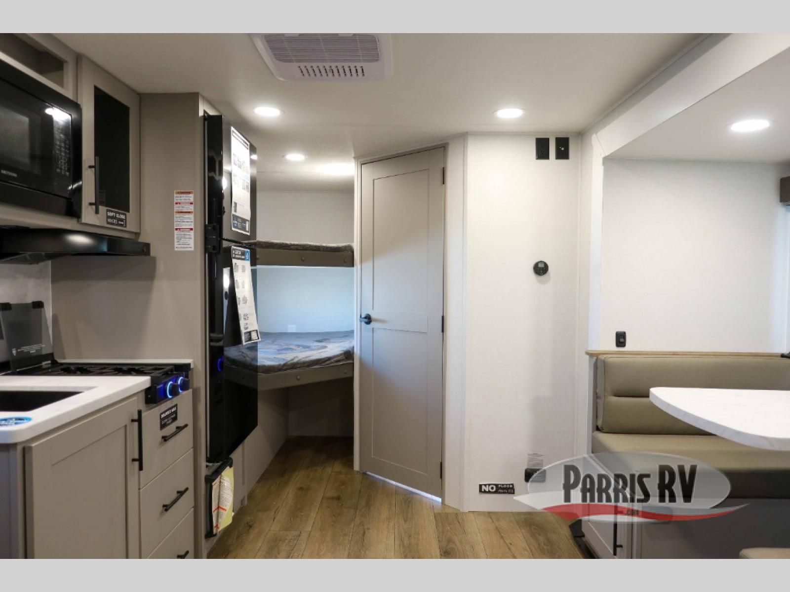 Step inside through the solid step entry and you'll be greeted by a cozy queen bed, perfect for a restful night's sleep. In between wardrobe nightstands and topped with overhead storage, there's plenty of room for your clothes and essentials. For added versatility, the bed converts into a 60" jack knife sofa, providing extra seating when needed. The slide out features a dinette that offers additional space, a comfy sleeping area, and a spot to enjoy meals. Across from the dinette, the kitchen is fully equipped with a 10-cu. ft. refrigerator, two-burner cooktop, sink, and microwave, everything you need to prepare your favorite dishes. At the rear corner, you'll find even more sleeping space with dual 46" x 74" bunks, right next to a full bathroom complete with a 30" x 36" shower for added comfort and convenience.