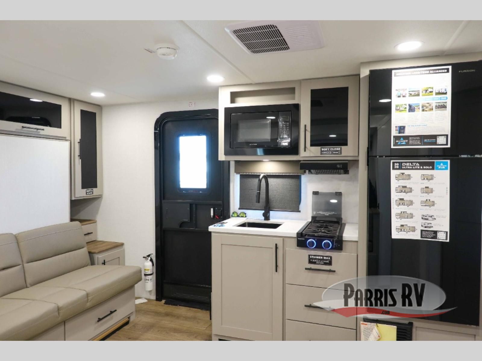Each Delta Solo Model Each is designed to provide both comfort and convenience in a compact footprint. Inside, you'll find residential-style touches like can-style LED ceiling lights, cabinet doors with magnetic catches, and commercial-grade vinyl flooring built to last. On the exterior, practical travel features include exterior switches for the slide-out and awning, sturdy Step Above fold-out entry steps, and color-coded, numbered wiring for simplified maintenance and troubleshooting.