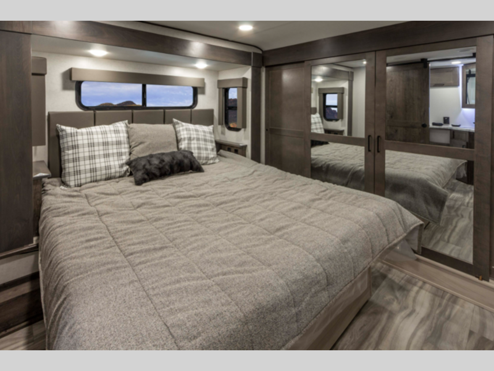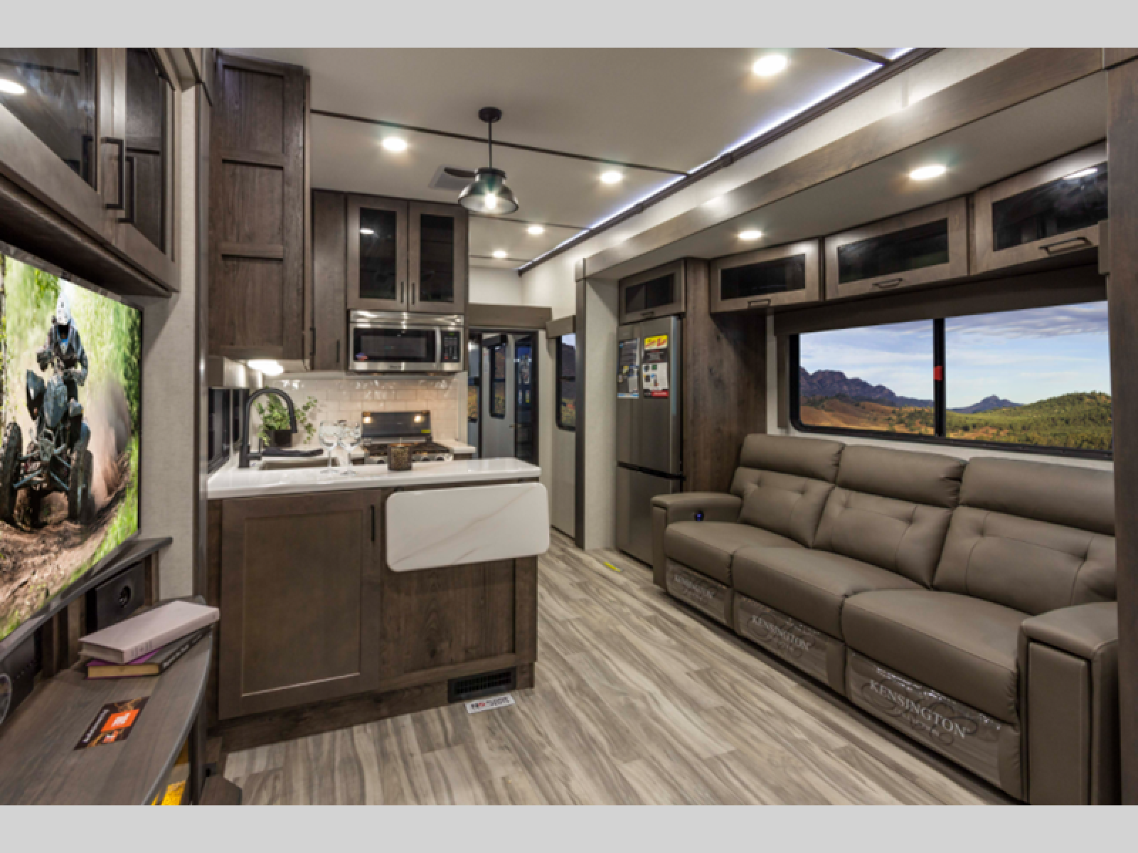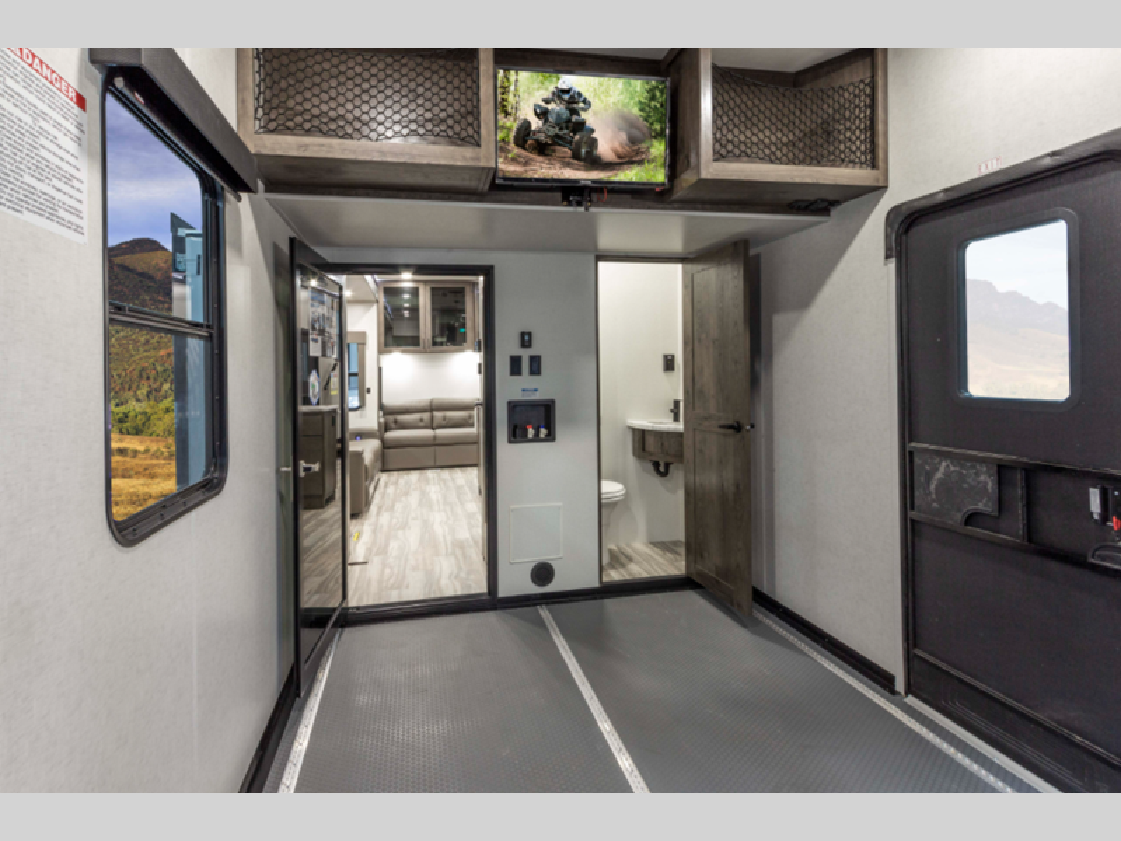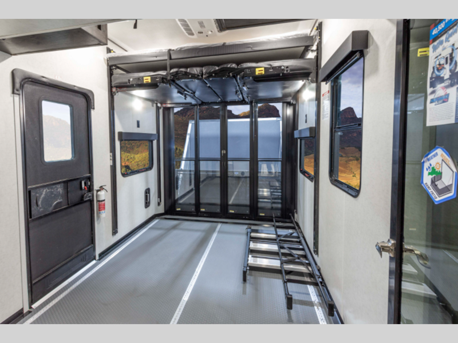 There is room for your off-road toys and the whole family in this toy hauler! The bath and a half makes life more convenient and the dual entry doors create a smooth flow of traffic in and out of the unit. Aside from 13' of garage space, an air compressor, and an entrance/exit door there are also opposing HappiJac sofas with a queen bed above them, a loft that opens to the living room, and a half bathroom. The chef can prepare their best meals with the four burner cooktop while two others sit at the flip up counter with two bar stools. After a fun day on the trails, wash up in the full bathroom with the 48" x 30" shower, grab your pajamas from the front wardrobe or flip top dresser in the front private bedroom then relax on one of the two sofas by the fireplace and Smart TV!
