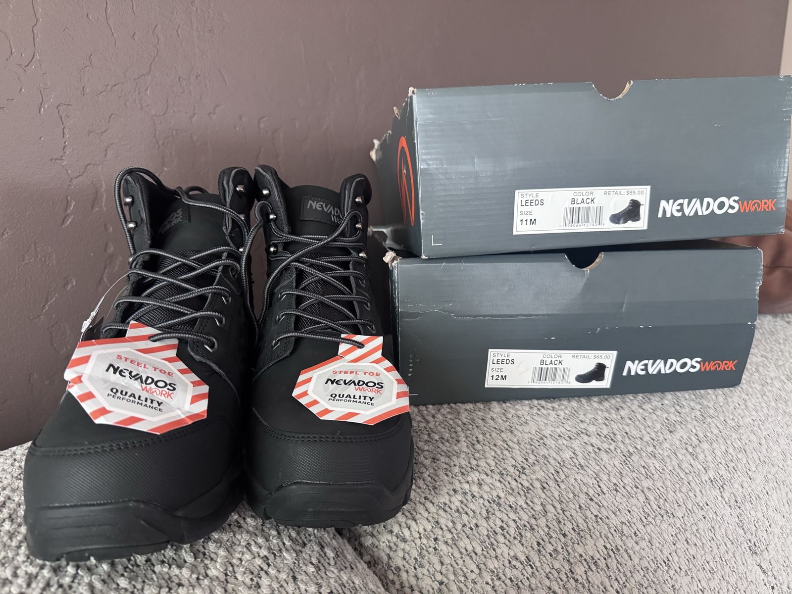 ApplePayNew steel work boots, I have 2 different sizes available. 1 size 11 men’s 1 size 12 men’s