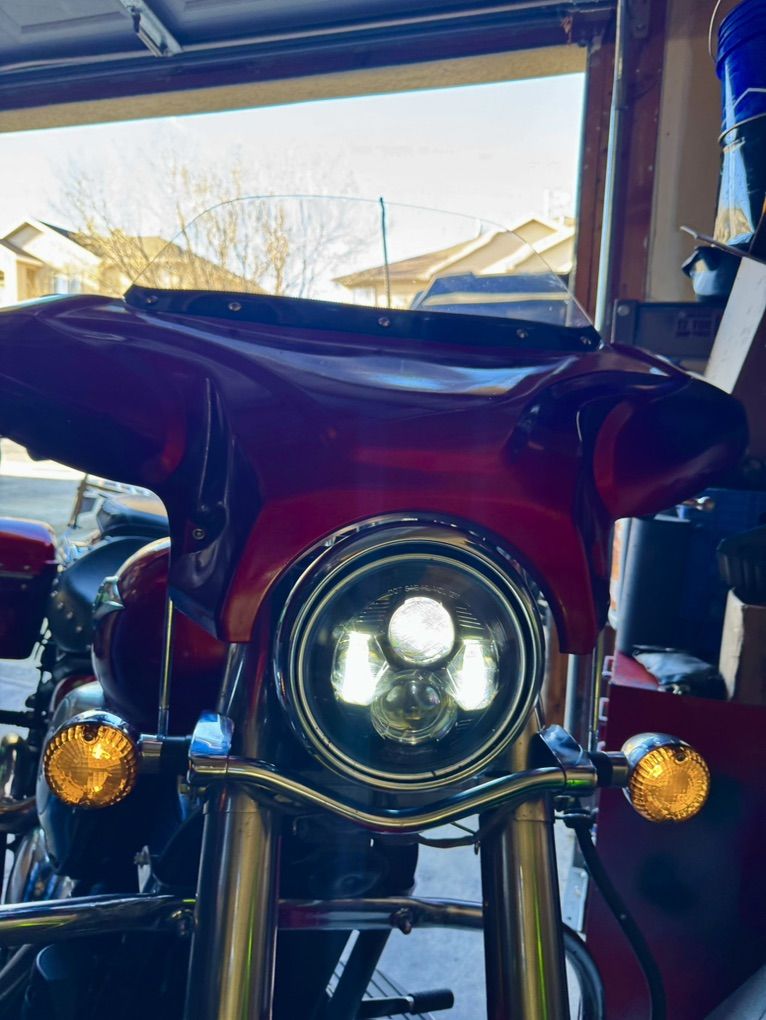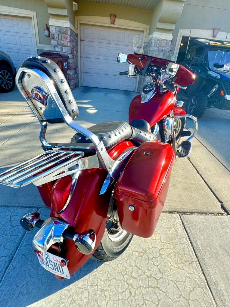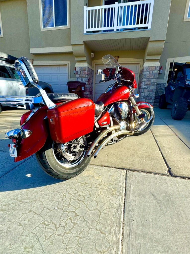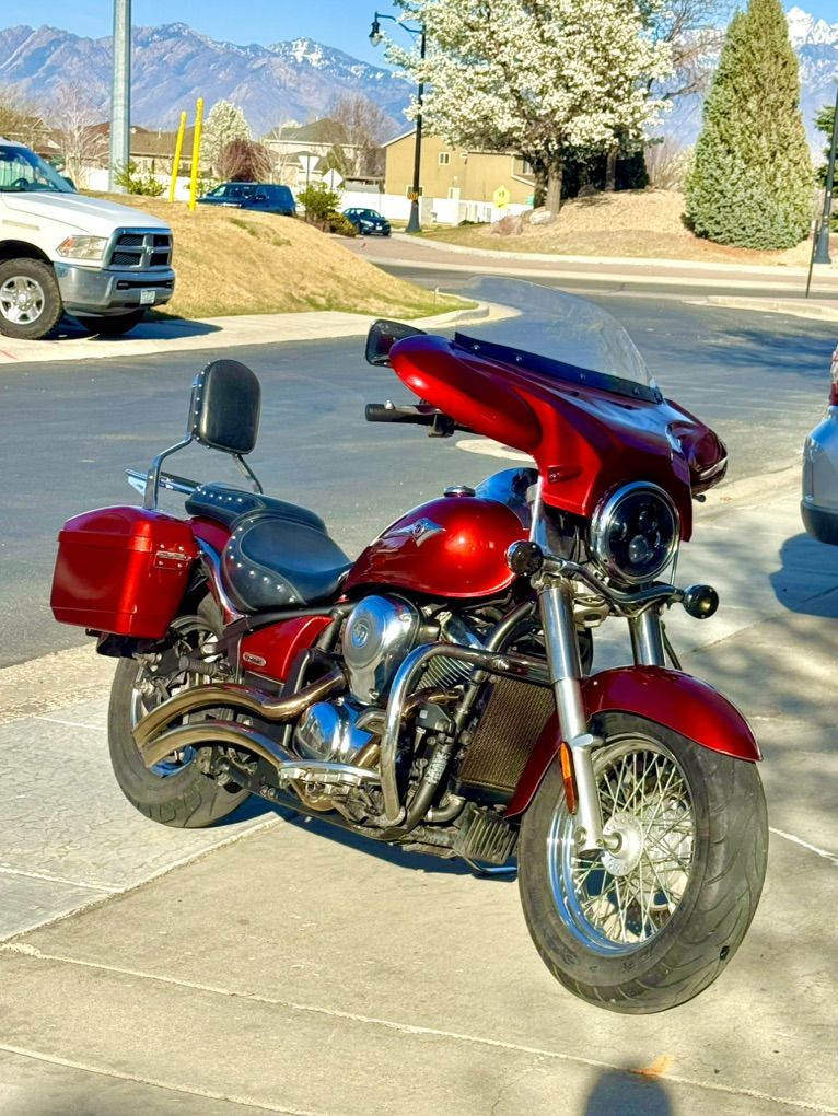 Custom red metallic paint Front fairing Led headlight Aftermarket handle bars Bluetooth radio Sweeper pipes Hard saddle bags paint matched New battery Tires good