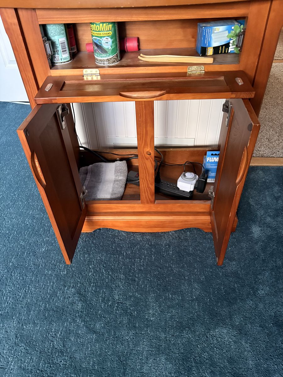VenmoThis is designed as a terrarium, but has held water for more than 10 years. It’s currently a biological aquatic environment with a colony of small aquatic snails. Set up includes: 20L tank with sliding screen lid Shark filter (biological and mechanical) LED light bar, adjustable Stand Decor & rocks