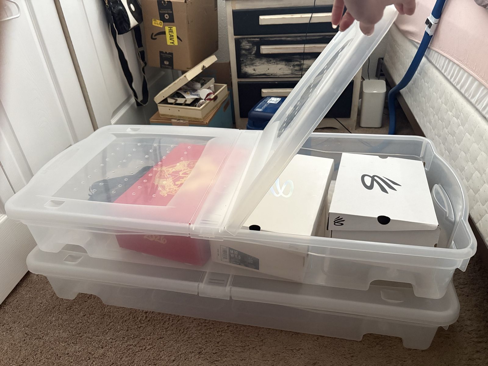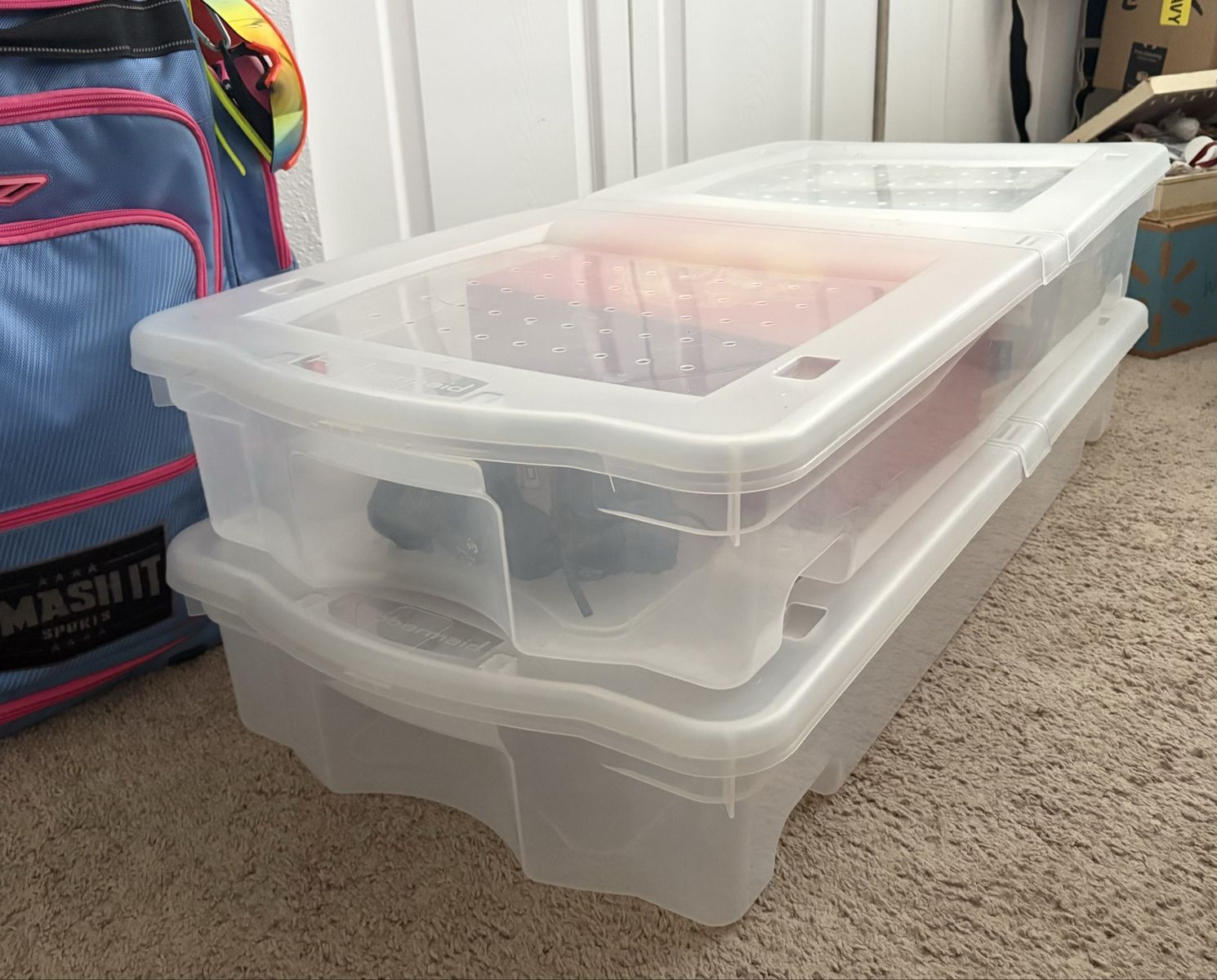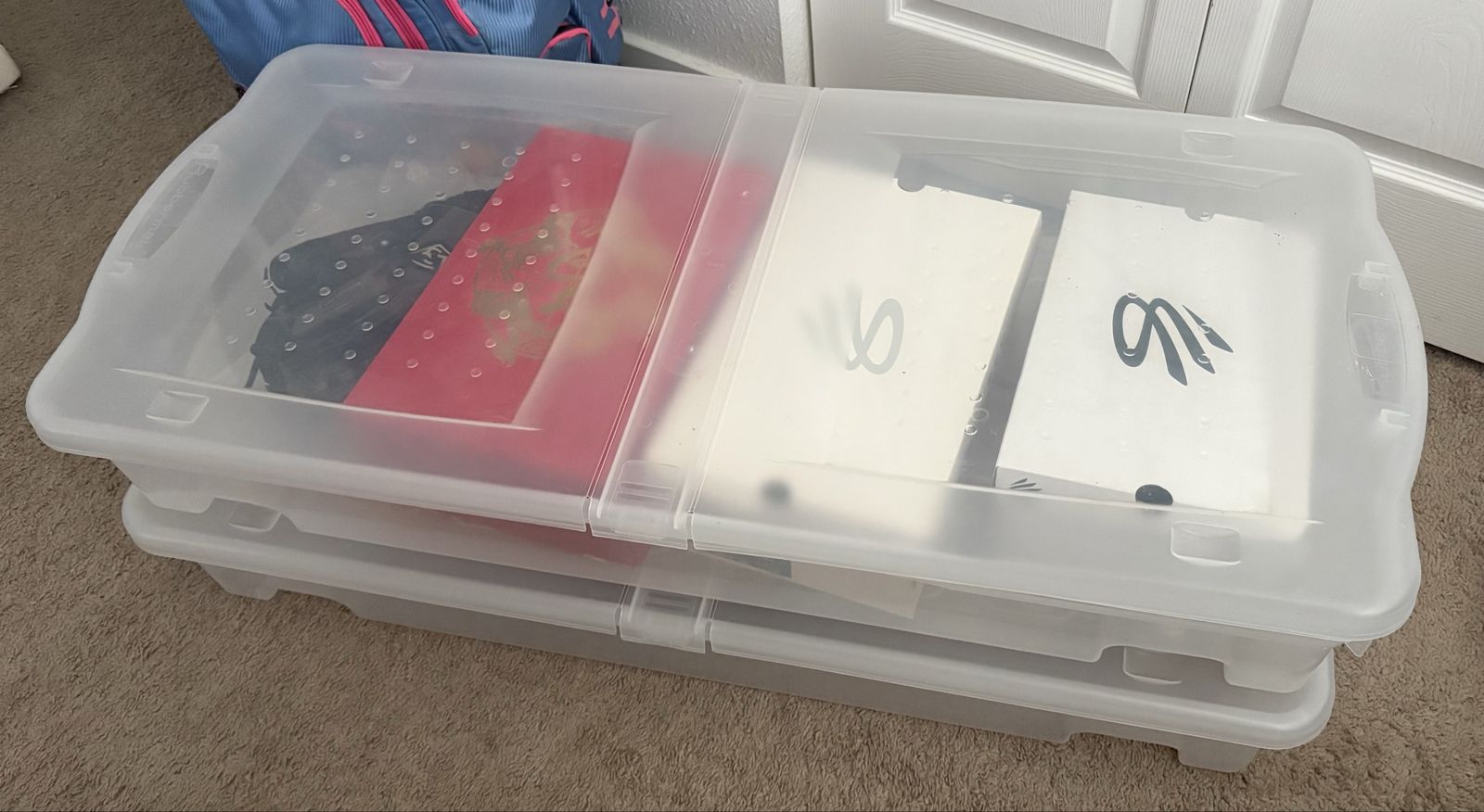 VenmoSet of 2 Rubbermaid under-bed storage bins in great condition. These are the long, low-profile style (approx. 43” L x 19” W x 6.75” H), perfect for sliding under a bed or storing seasonal items, shoes, clothing, or keepsakes.