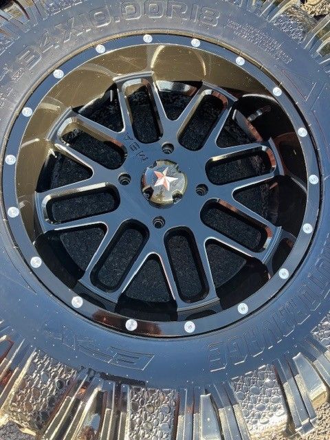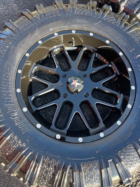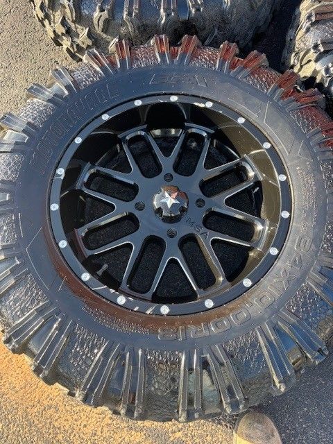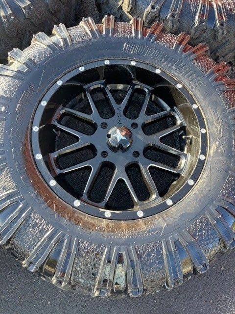 VenmoMSA 18 x 7 Wheels EFX MotoRavage 34" Tires. Fits Can Am X3, 4x136 bolt pattern. Tires have about 25% life left. These are very good looking wheels and will really set your UTV apart. There are some scratches in them but you could use a little black touch up paint or even a black sharpie to make them dissappear. The 34 inch tires really improve your ground clearance. Only $400 for the set!