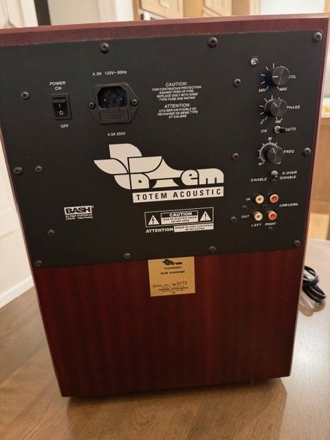 Passive Radiators: Twin 10" side-firing unitsAmplification: 500W RMS Class D High-Efficiency Frequency Response: 18 Hz – 200 Hz Finish: Furniture-grade Mahogany Veneer Inputs: High-level (speaker), RCA, and LFE Phase Control: 0° to 180° (Variable) Dimensions (WxHxD)11.25" x 14.25" x 14.25" Passive Radiators: Twin 10" side-firing units Amplification: 500W RMS Class D High-Efficiency Frequency Response: 18 Hz – 200 Hz Finish: Furniture-grade Mahogany Veneer Speed & Integration: Designed to pair seamlessly with Totem’s legendary "Forest" or "Wind" series, ensuring no "bloat" in the crossover transition.
