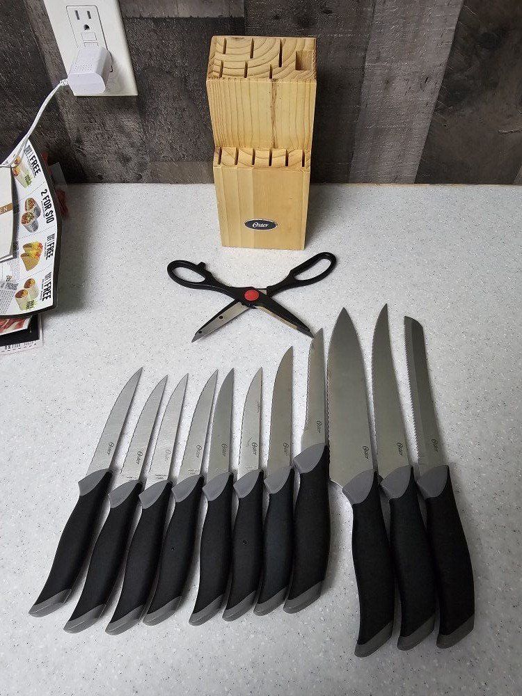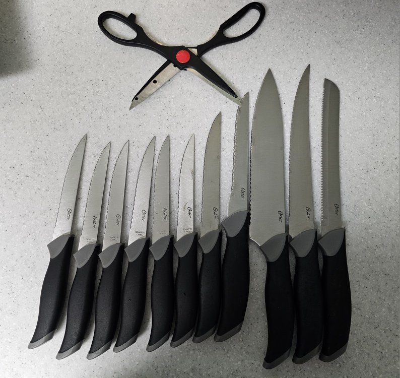 • 11 piece knife set with 1 pair of scissors and wooden block (not a complete set. 1 knife is missing)
