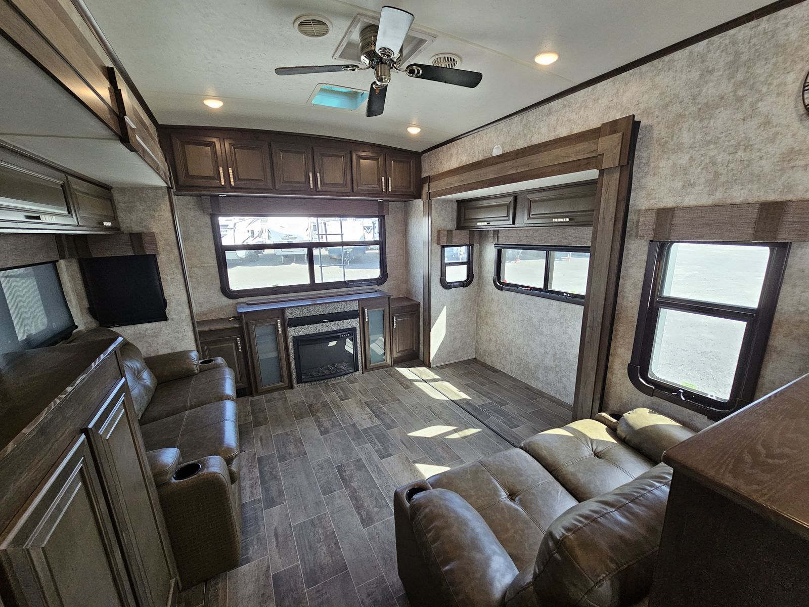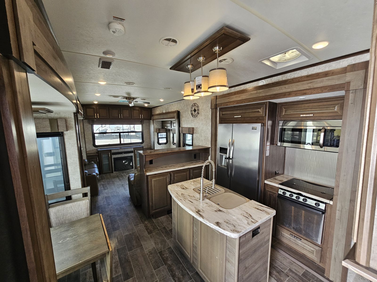 Inside, the rear den layout creates a dedicated living space featuring opposing slide-outs, theater seating, and a large entertainment center—perfect for relaxing or hosting guests. The central kitchen is fully equipped with solid-surface countertops, a residential refrigerator, ample pantry storage, and a free-standing dinette, making meal prep easy and enjoyable.