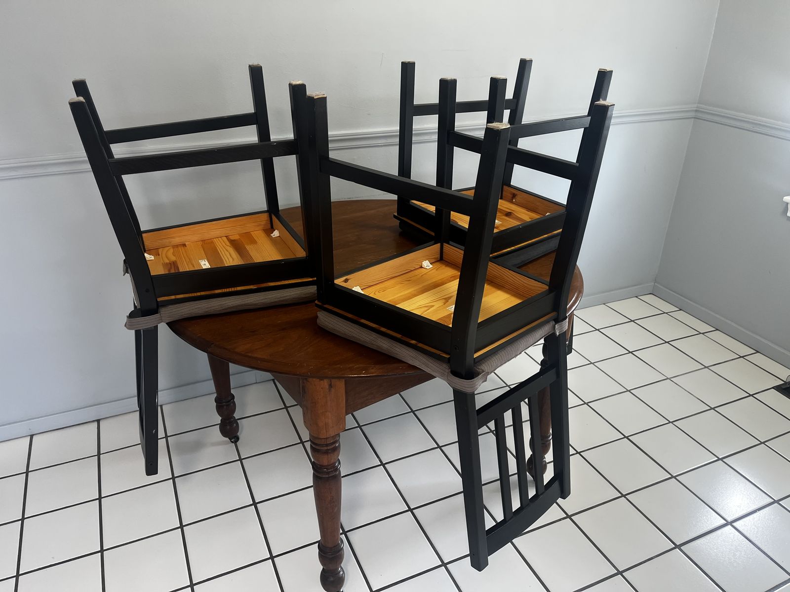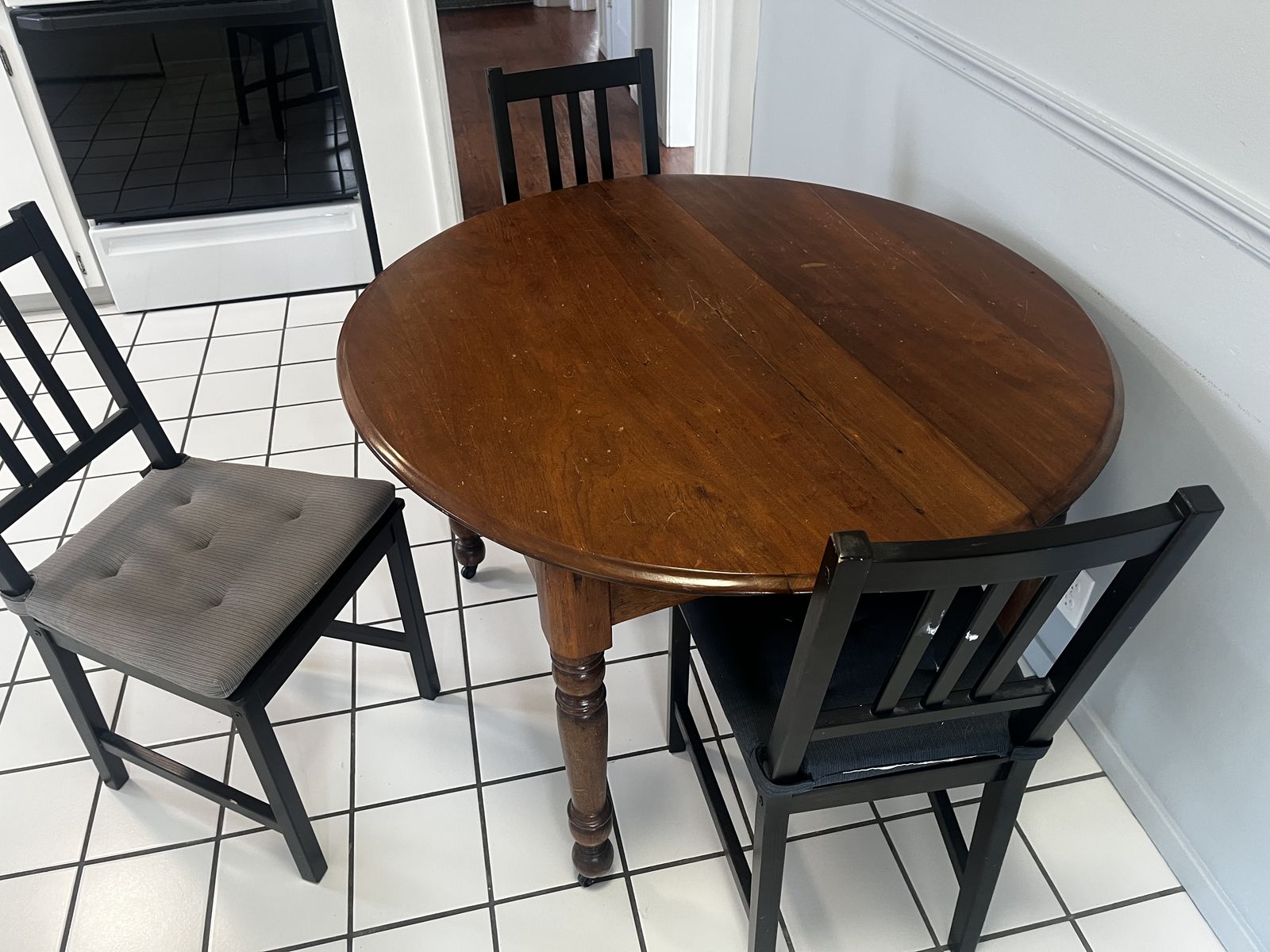 VenmoGreat dining or breakfast nook set. Selling a solid wood round table with unique character and three matching black IKEA chairs with cushions.