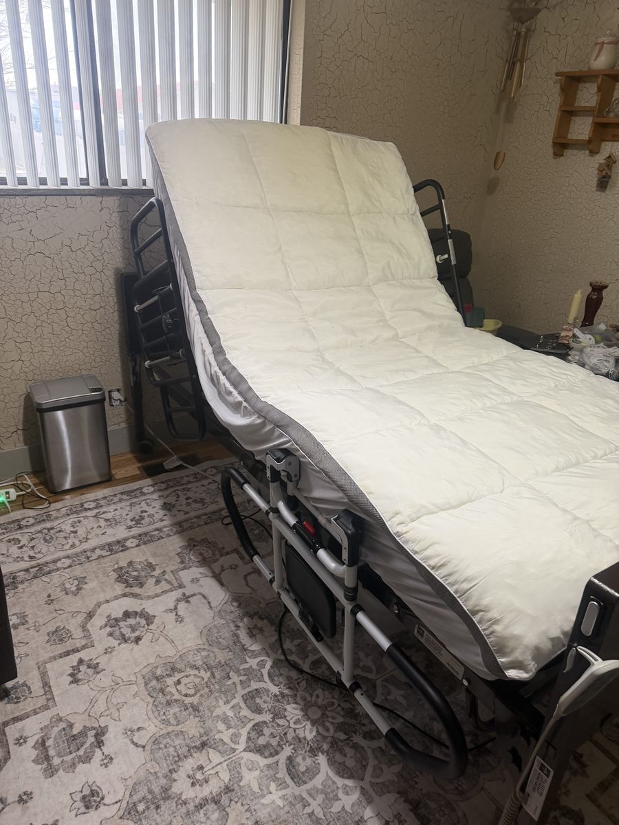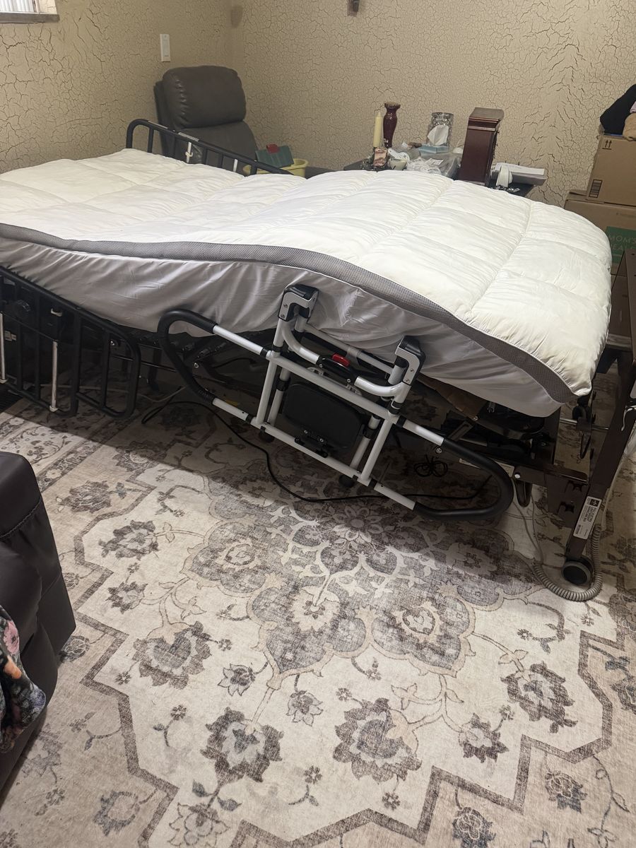 I have a 7 year old hospital bed with rails attached to the bed and then additional rails on both sides of the bed. It comes with a mattress and if wanted a topper mattress cover. I am asking 600.00 only cash. You come and pick it up. Text if interested.
