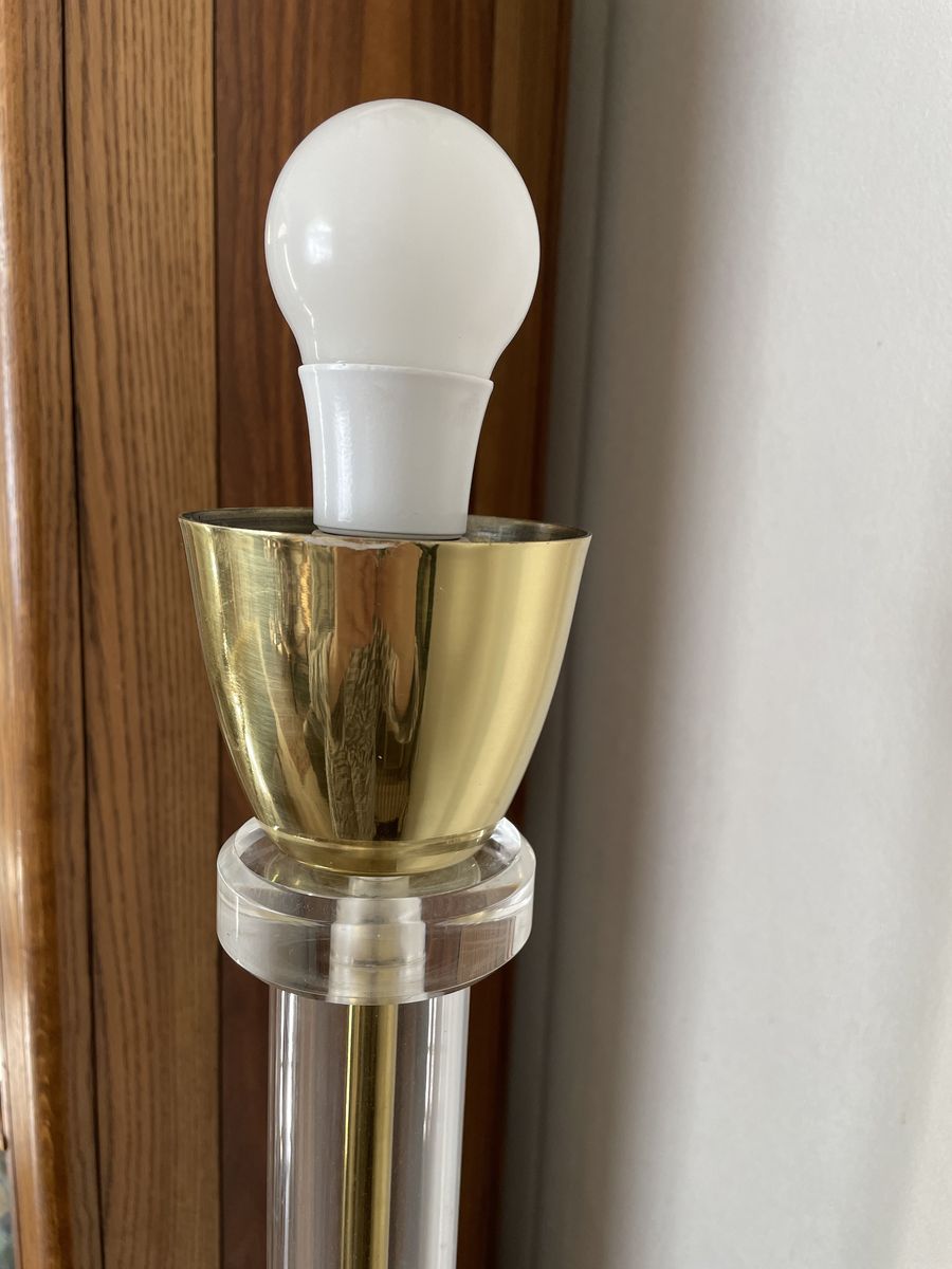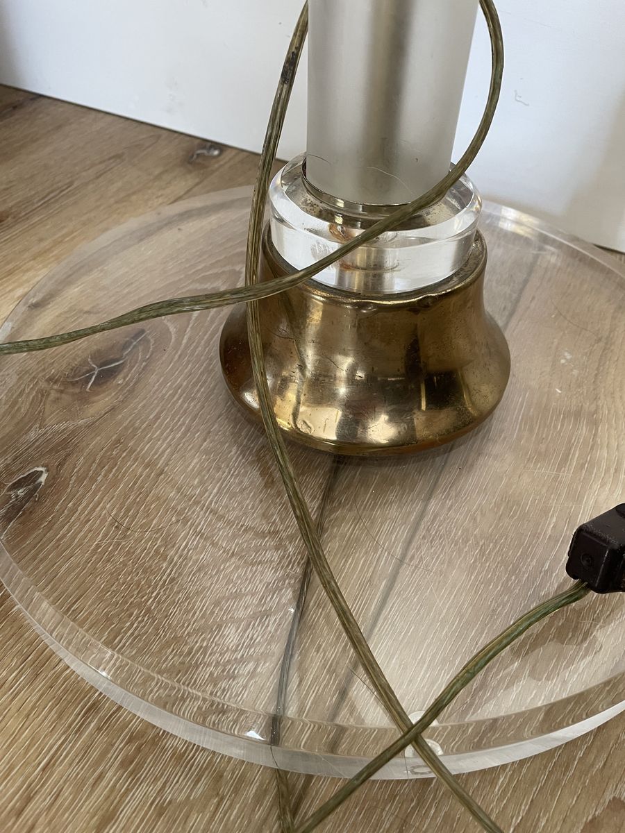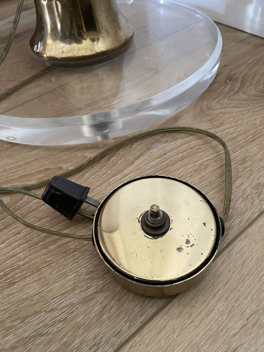 The lampshade is missing.. I am not sure if the metal part is brass or not. One of the four small pads on the bottom is missing.