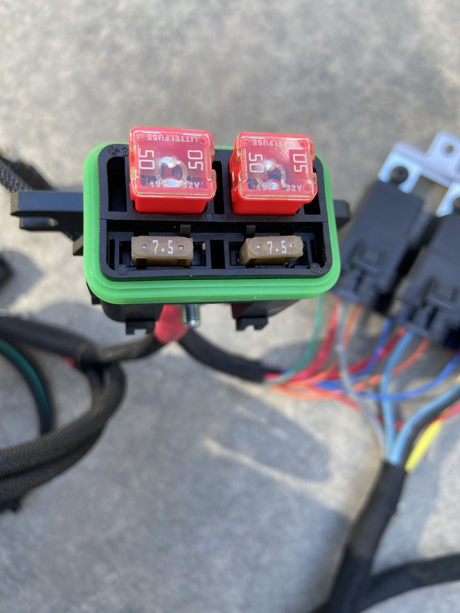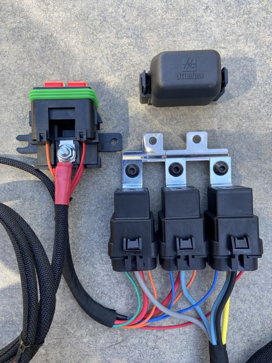 This includes, 10 Gauge TXL wire, 30/50a Relays, 50a Fan Fuses, Fiberglass high resistant heat split loom, in an all waterproof contained system.