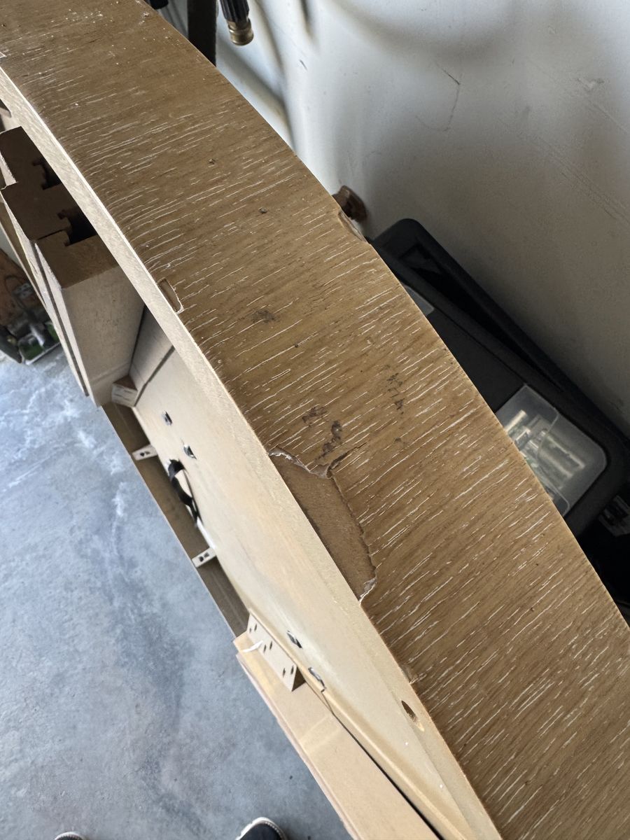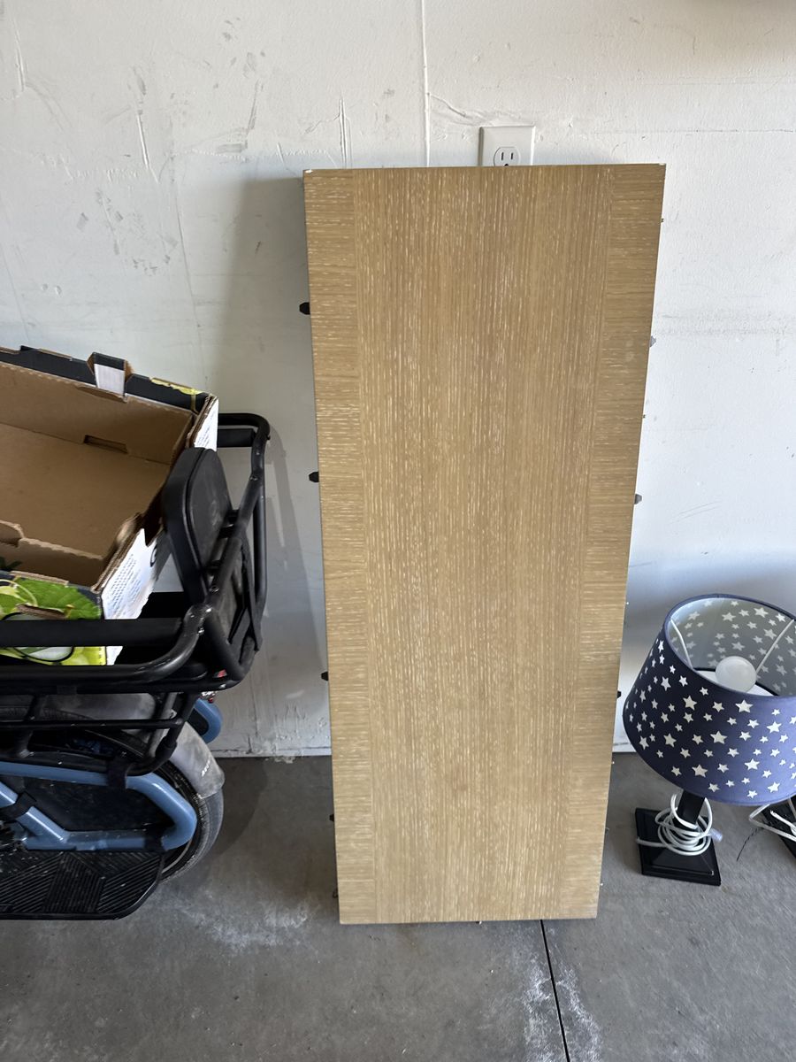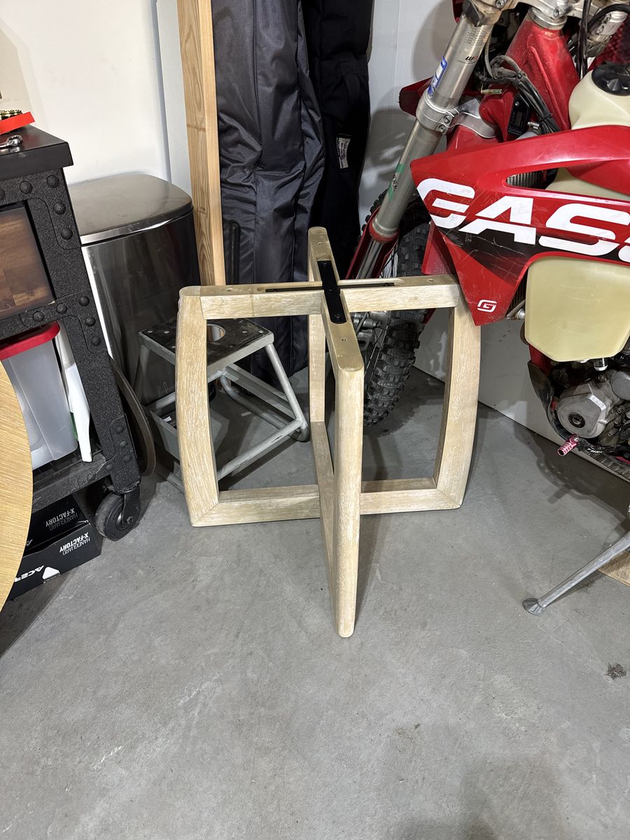 Round kitchen table with leaf. Some peeling otherwise works great. Could be covered or resurfaced.