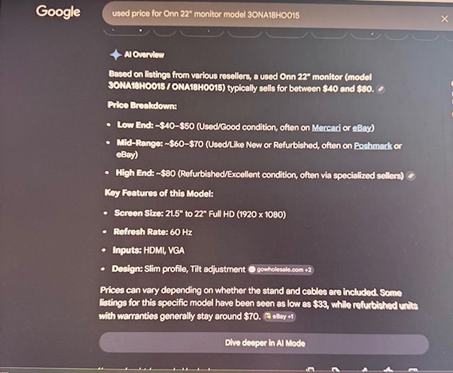 22" Onn Monitor, Model #3ONA18HO015. Comes with power cord. A couple of surface scratches on the screen (middle-lower section). Used periodically since purchased.