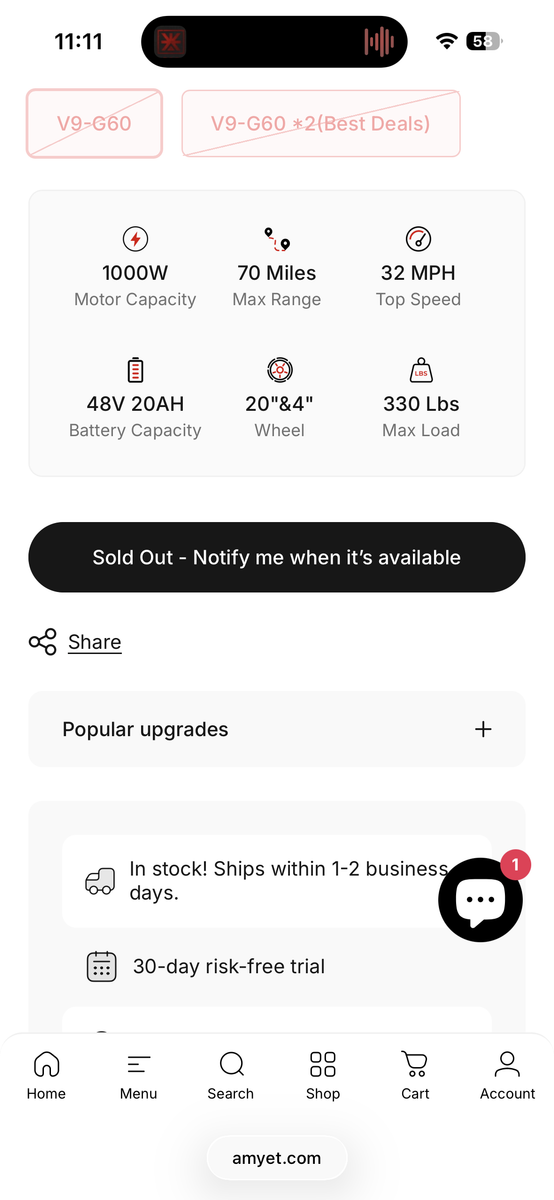 ApplePayI have an Amyet V9-G60 for sale. It's in new condition with just 13 miles on it. It's a blast to buzz around on! Please don't lowball me. If you want to make an offer that's fine, but don't ask me to sell it for half of what I have it listed for. I won't waste your time if you don't waste mine. I'm not interested in trades. Thanks!